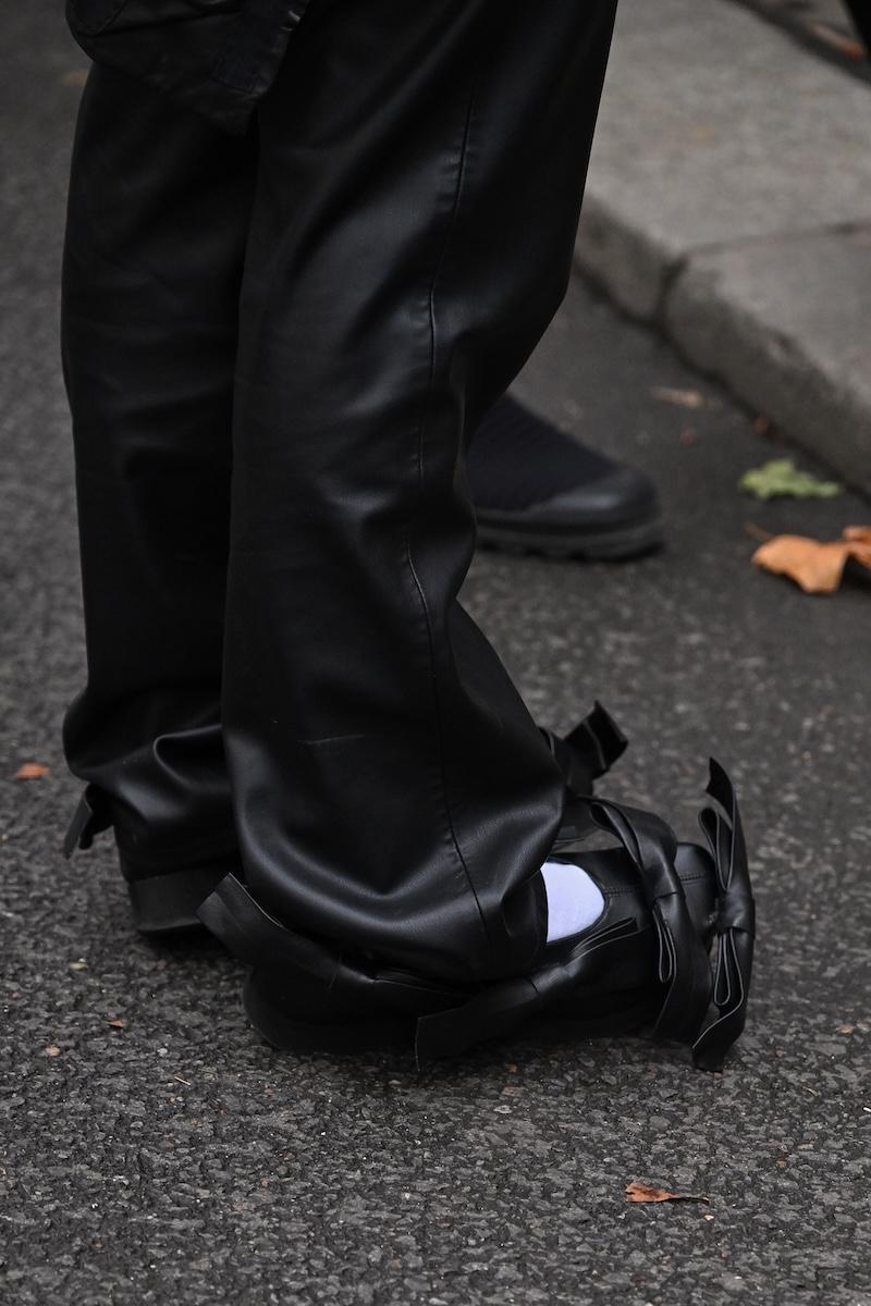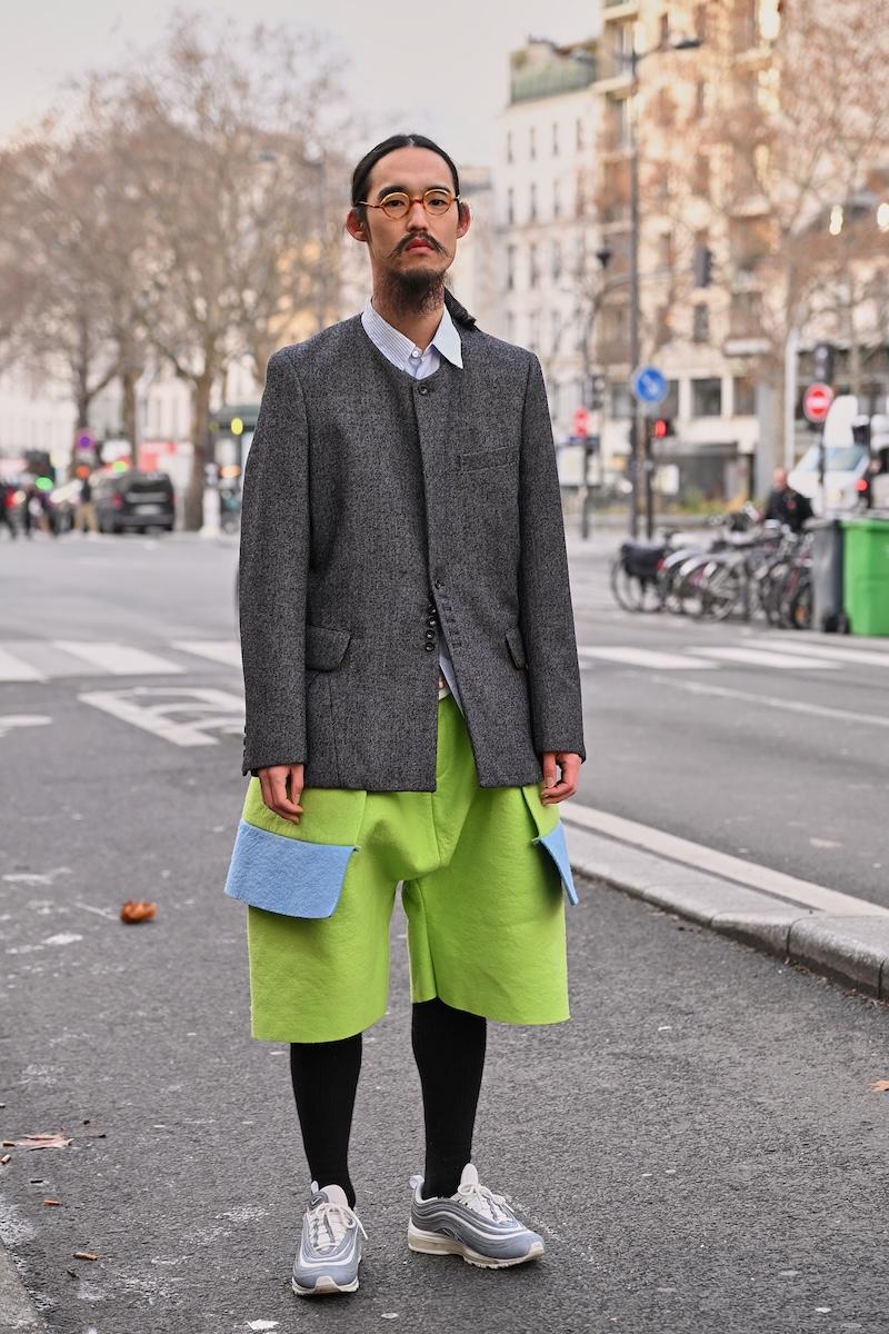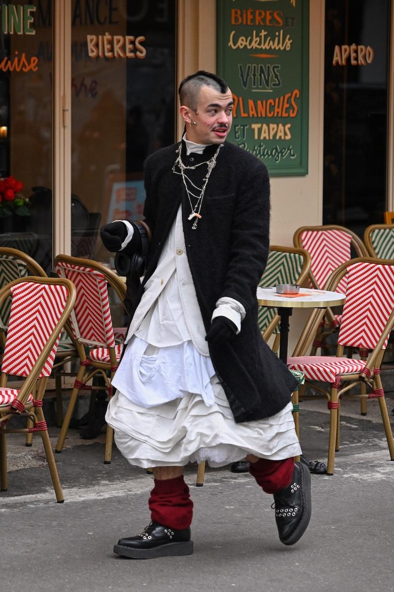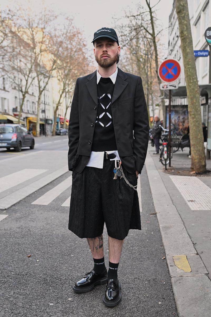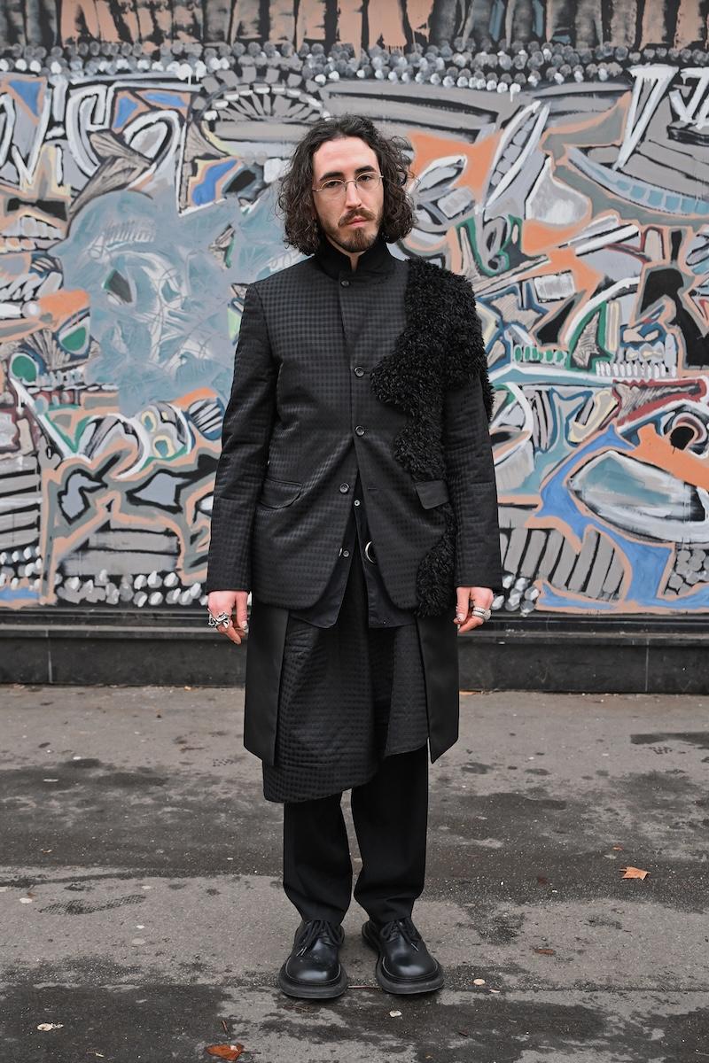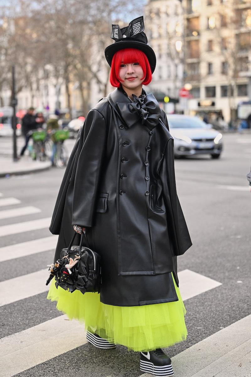 最新シーズンのアイテムに過去のコレクションをミックスし、同日にショーを行った「ジュンヤワタナベ(JUNYA WATANABE)」を交差させる装いも多く見られた。足元では、「キッズ ラブ ゲイト(KIDS LOVE GAITE)」との前衛的なコラボレーションシューズが存在感を発揮。さらに加えて、同ブランドのショーでも帽子を手掛ける、パリ拠点の日本人デザイナーによる「ヒヅメ(HIZUME)」のヘッドピースでスタイリングを完成させている。