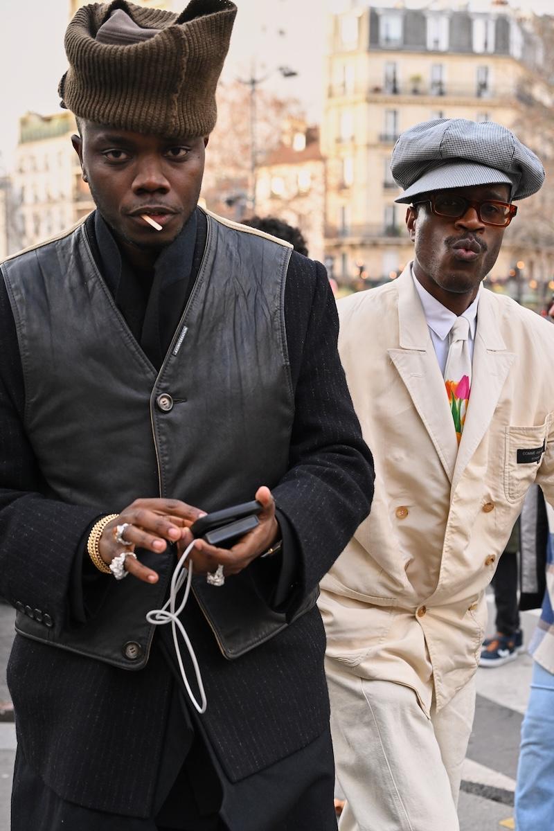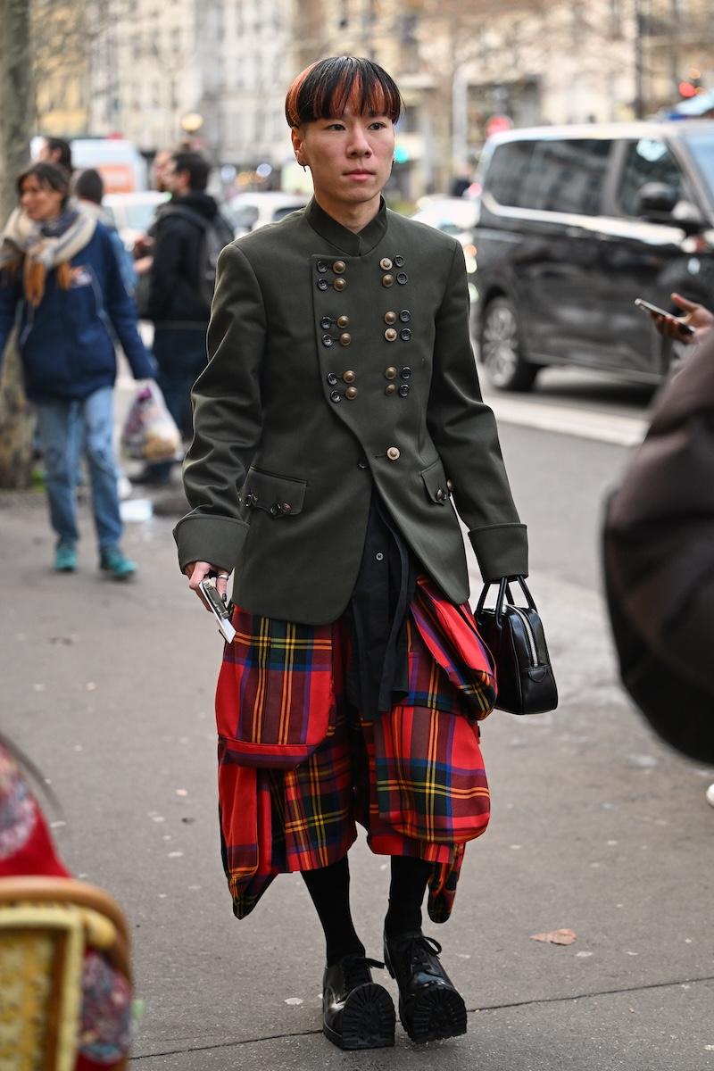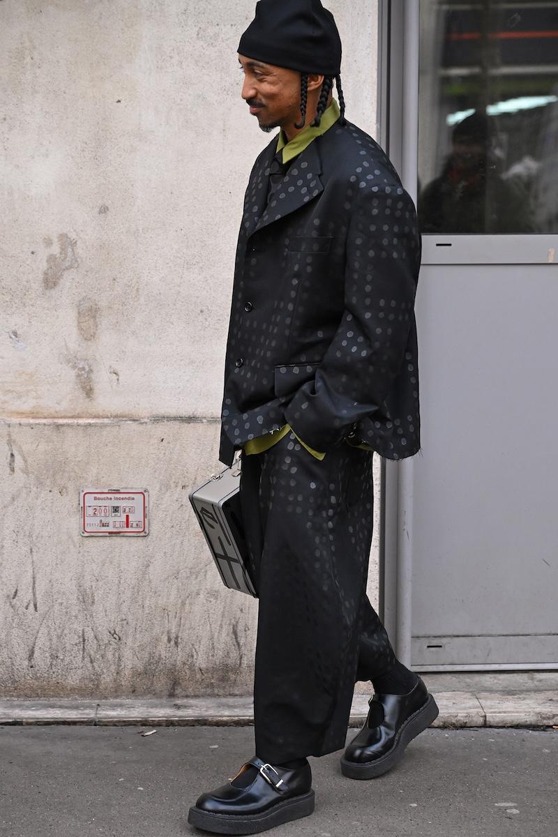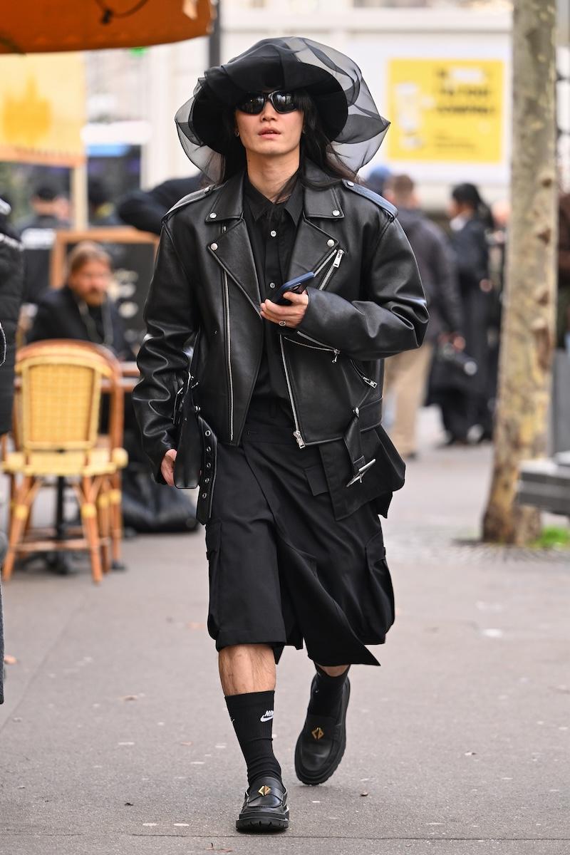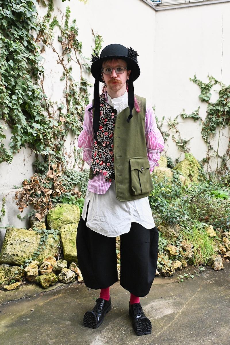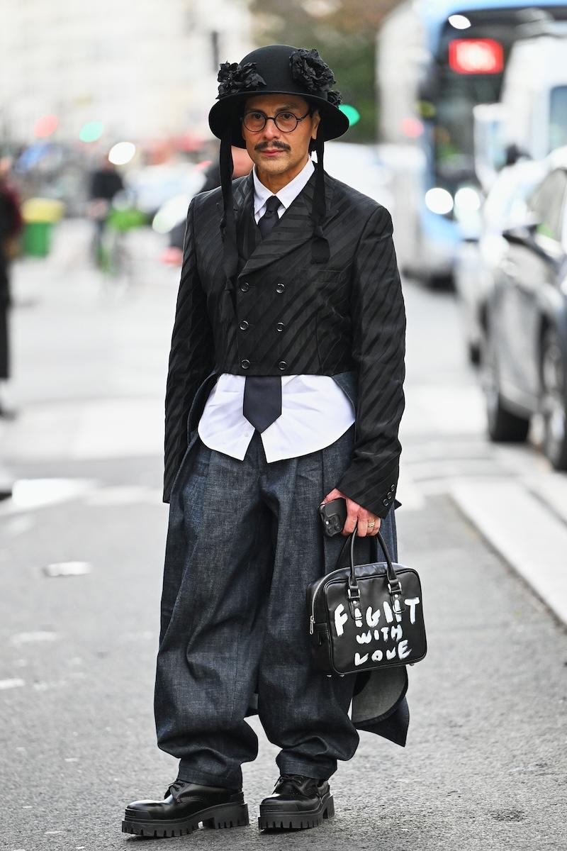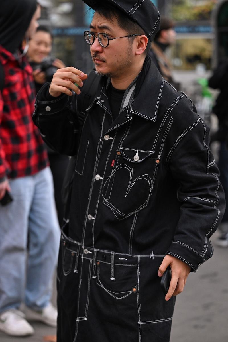 最新シーズンのアイテムに過去のコレクションをミックスし、同日にショーを行った「ジュンヤワタナベ(JUNYA WATANABE)」を交差させる装いも多く見られた。足元では、「キッズ ラブ ゲイト(KIDS LOVE GAITE)」との前衛的なコラボレーションシューズが存在感を発揮。さらに加えて、同ブランドのショーでも帽子を手掛ける、パリ拠点の日本人デザイナーによる「ヒヅメ(HIZUME)」のヘッドピースでスタイリングを完成させている。