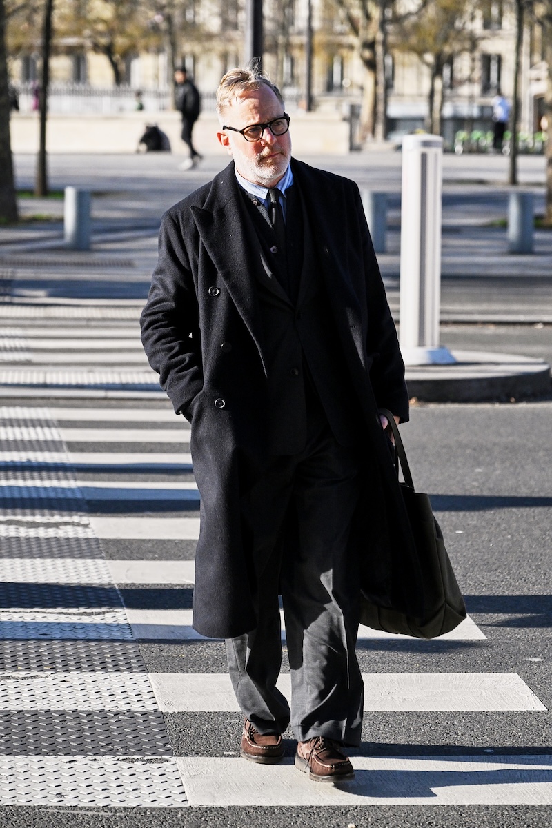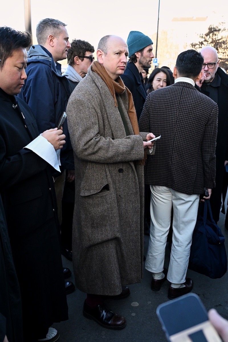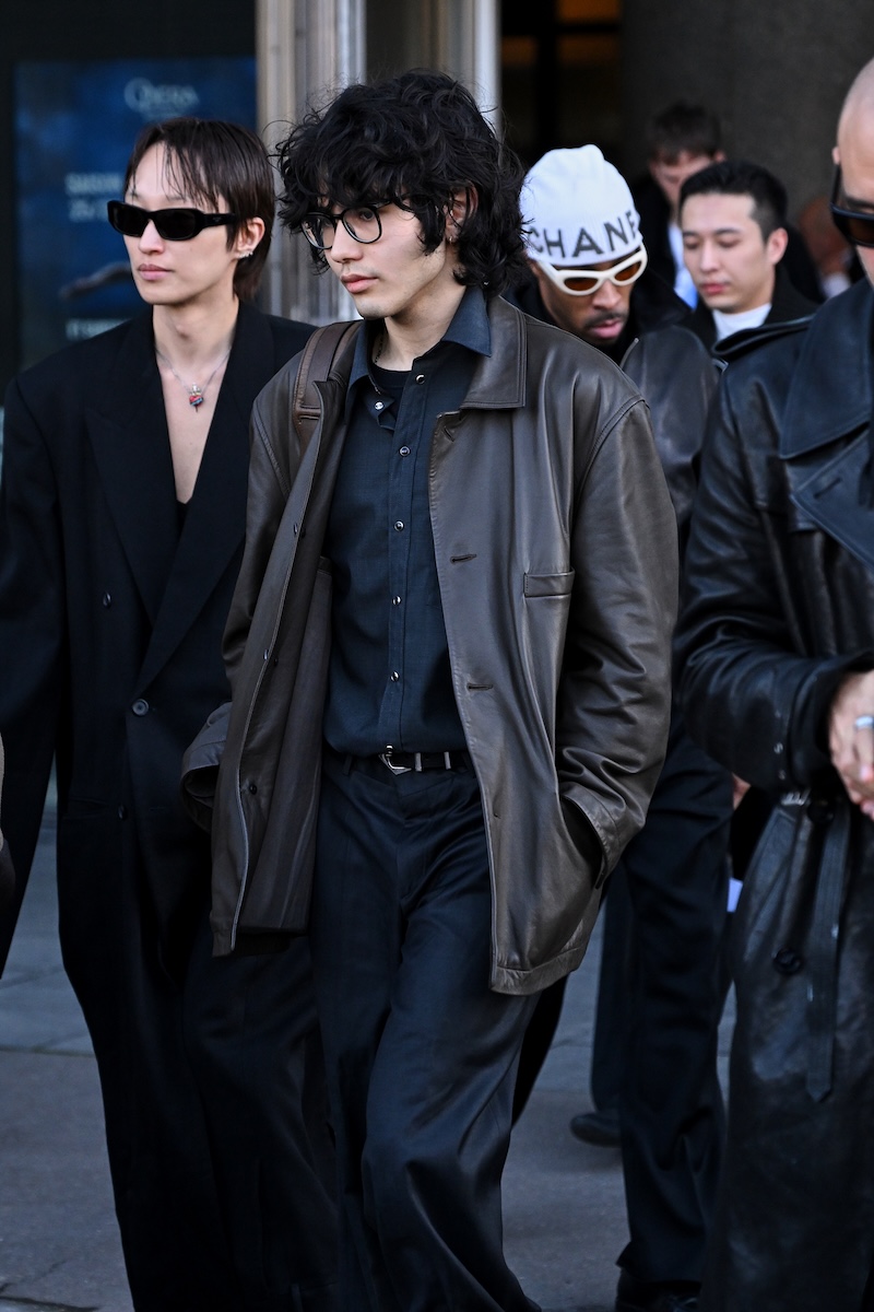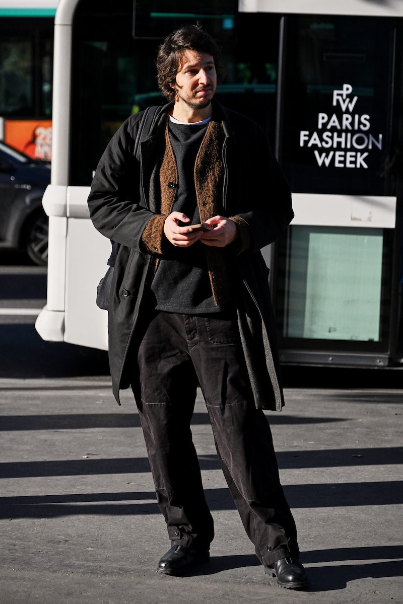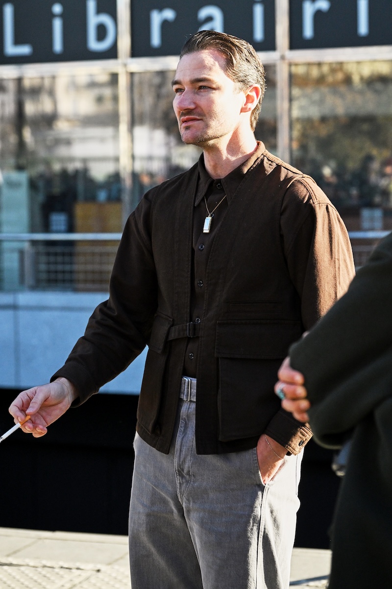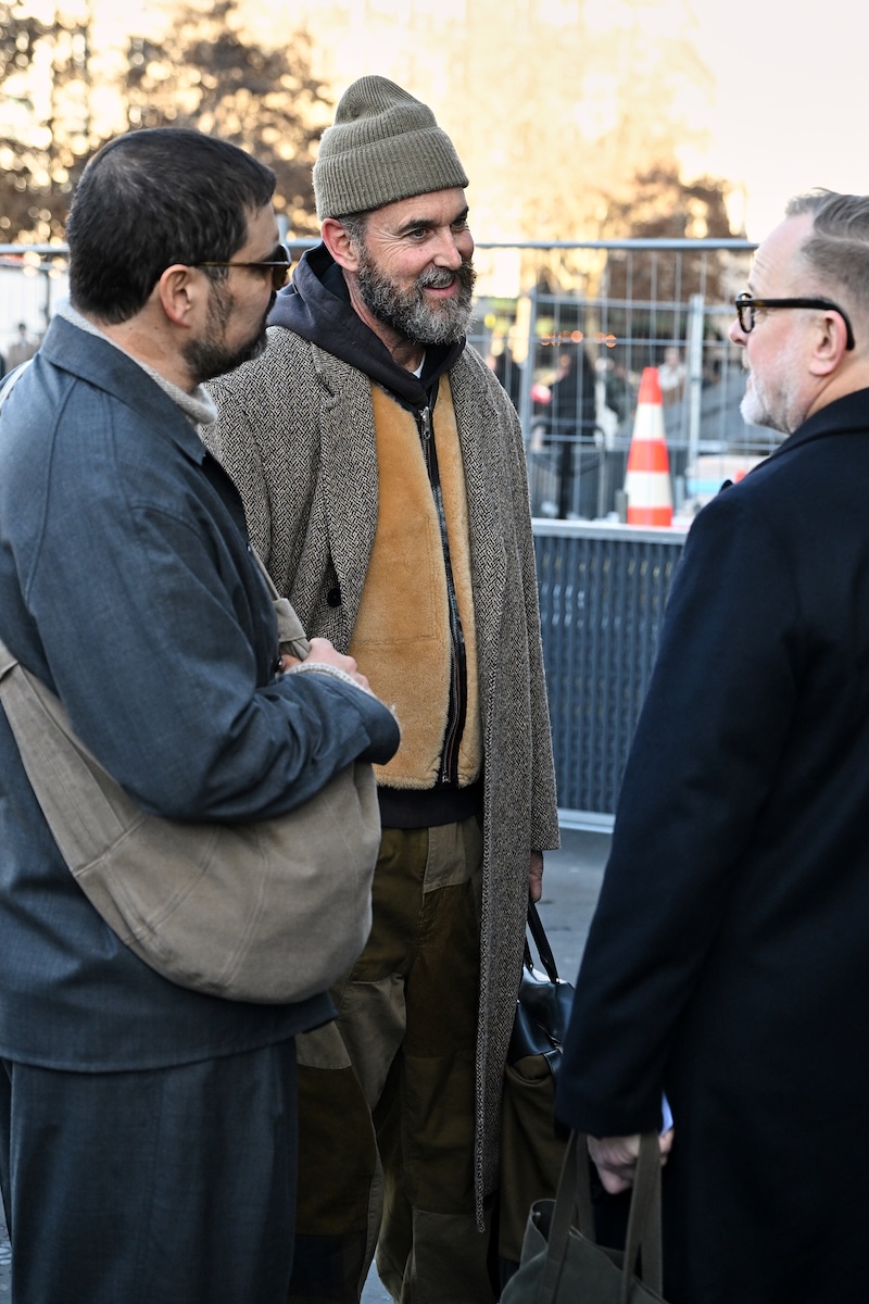 「ルメール(LEMAIRE)」は、2026-27年秋冬メンズ・コレクションをパリで現地時間1月21日に発表した。会場周辺に集ったゲストのスタイルで目立ったのは、黒やブラウン、深みのあるグリーンといったダークトーンを軸にしたレイヤリングだ。厚手のコートの下にニットやシャツを重ね、色数を抑えながらも素材感と分量で奥行きを生む着こなしが多く見られた。全体を貫いていたのは、ワークウエアに由来する実用的なアイテム群。無骨さを残しつつも、シルエットやバランスによって都会的に昇華されている点は、「ルメール」ならではのアプローチといえる。中でも支持を集めていたのがラップコートで、身体を包み込むような構築が印象的だった。その他のアウターも総じてゆったりとしたオーバーサイズで、力の抜けたエフォートレスなムードを醸し出している。足元はレースアップを中心としたクラシックなレザーシューズが主流。差し色としてマフラーを効かせるスタイリングも多く、ダークトーンの装いにさりげないリズムを添えていた。