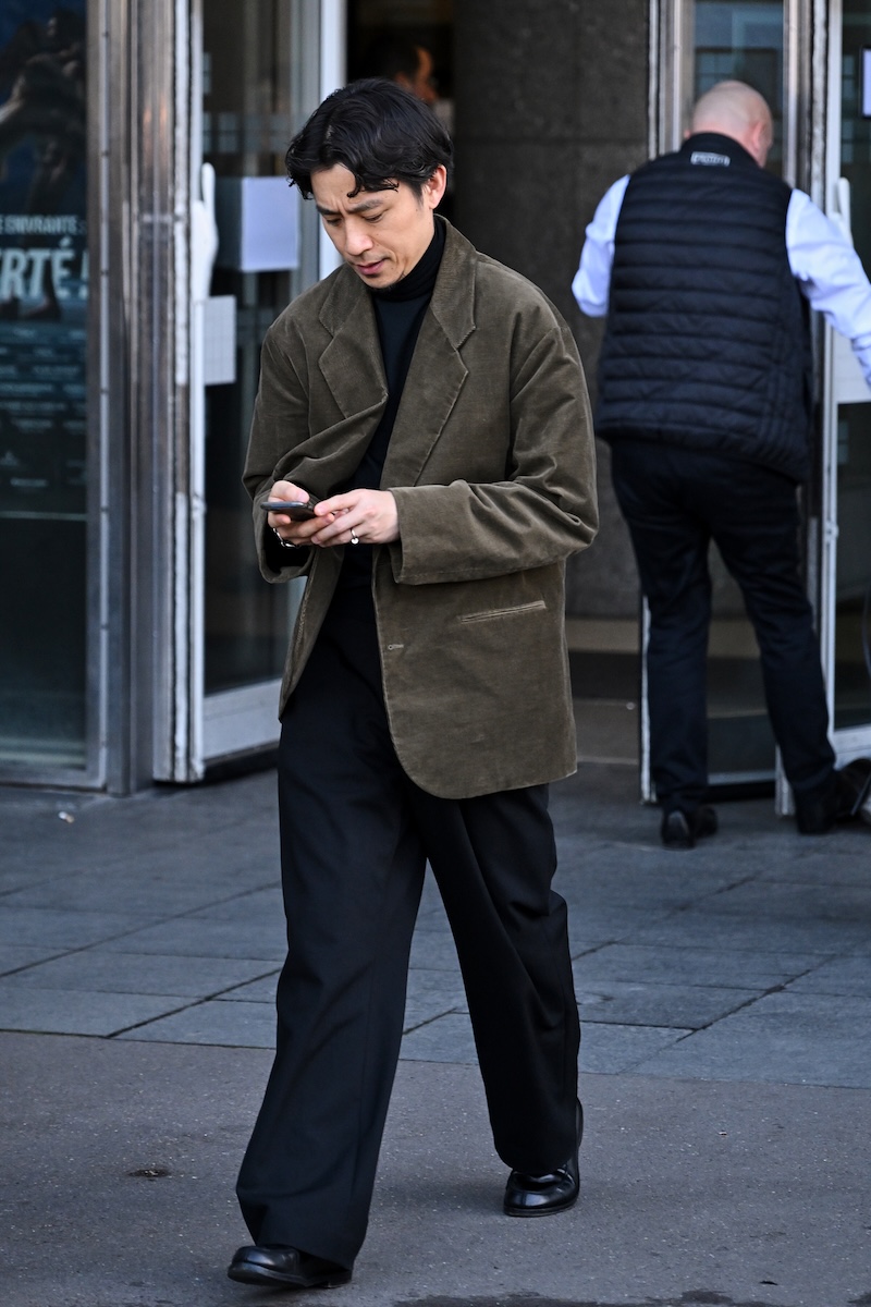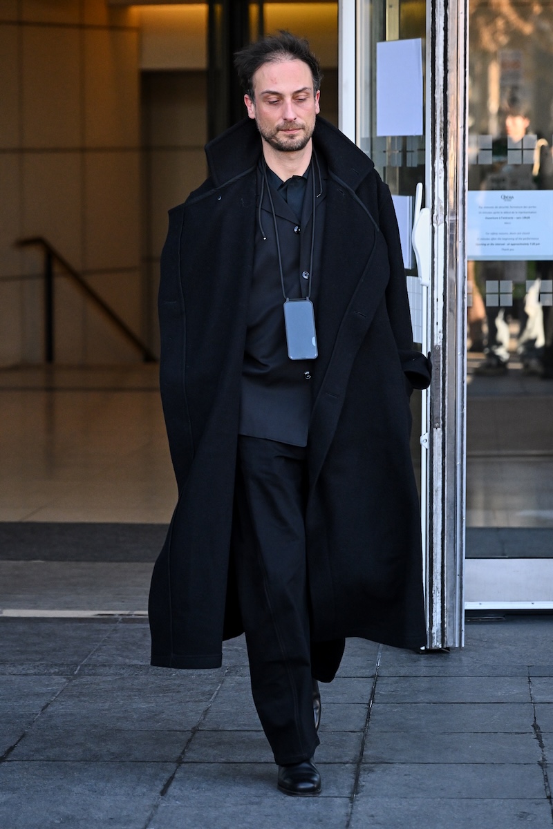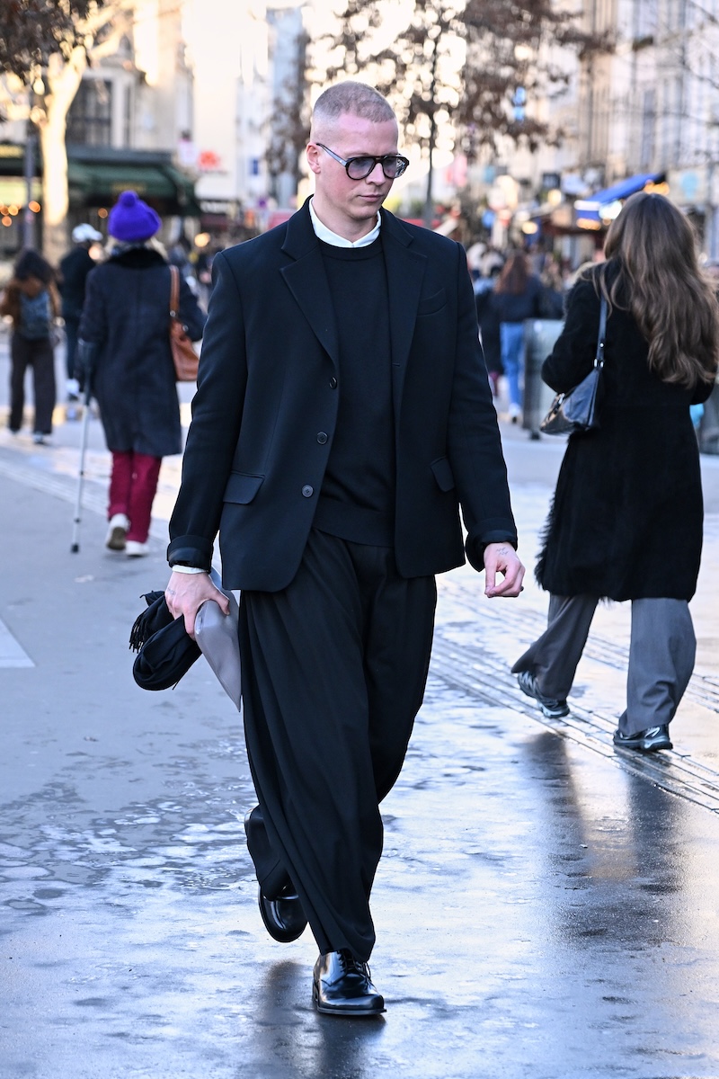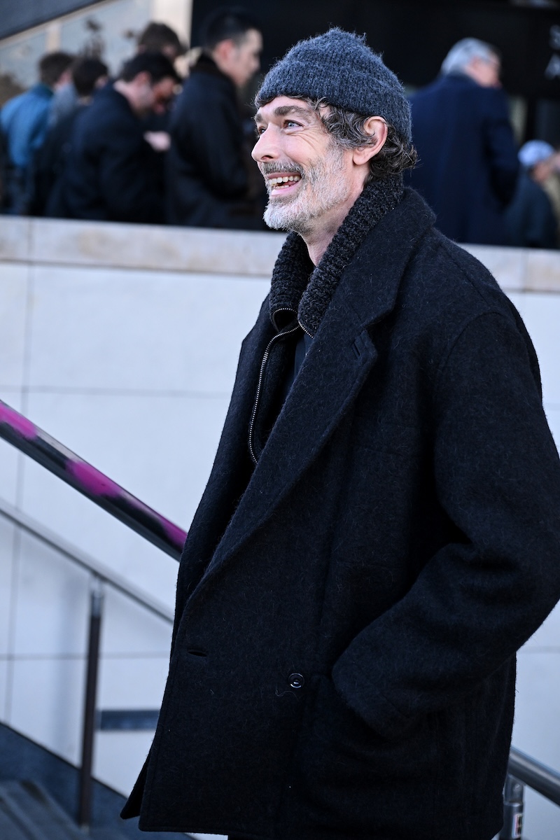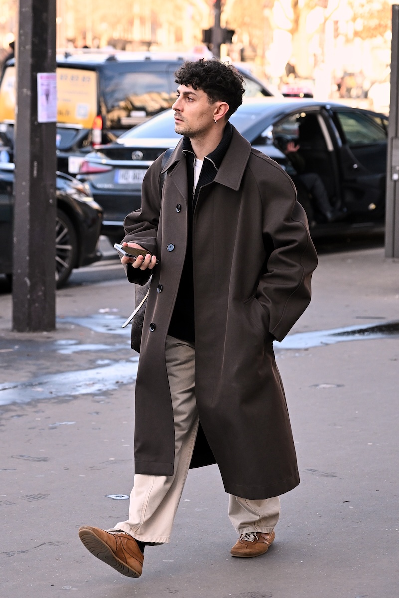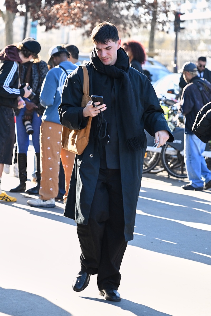 「ルメール(LEMAIRE)」は、2026-27年秋冬メンズ・コレクションをパリで現地時間1月21日に発表した。会場周辺に集ったゲストのスタイルで目立ったのは、黒やブラウン、深みのあるグリーンといったダークトーンを軸にしたレイヤリングだ。厚手のコートの下にニットやシャツを重ね、色数を抑えながらも素材感と分量で奥行きを生む着こなしが多く見られた。全体を貫いていたのは、ワークウエアに由来する実用的なアイテム群。無骨さを残しつつも、シルエットやバランスによって都会的に昇華されている点は、「ルメール」ならではのアプローチといえる。中でも支持を集めていたのがラップコートで、身体を包み込むような構築が印象的だった。その他のアウターも総じてゆったりとしたオーバーサイズで、力の抜けたエフォートレスなムードを醸し出している。足元はレースアップを中心としたクラシックなレザーシューズが主流。差し色としてマフラーを効かせるスタイリングも多く、ダークトーンの装いにさりげないリズムを添えていた。