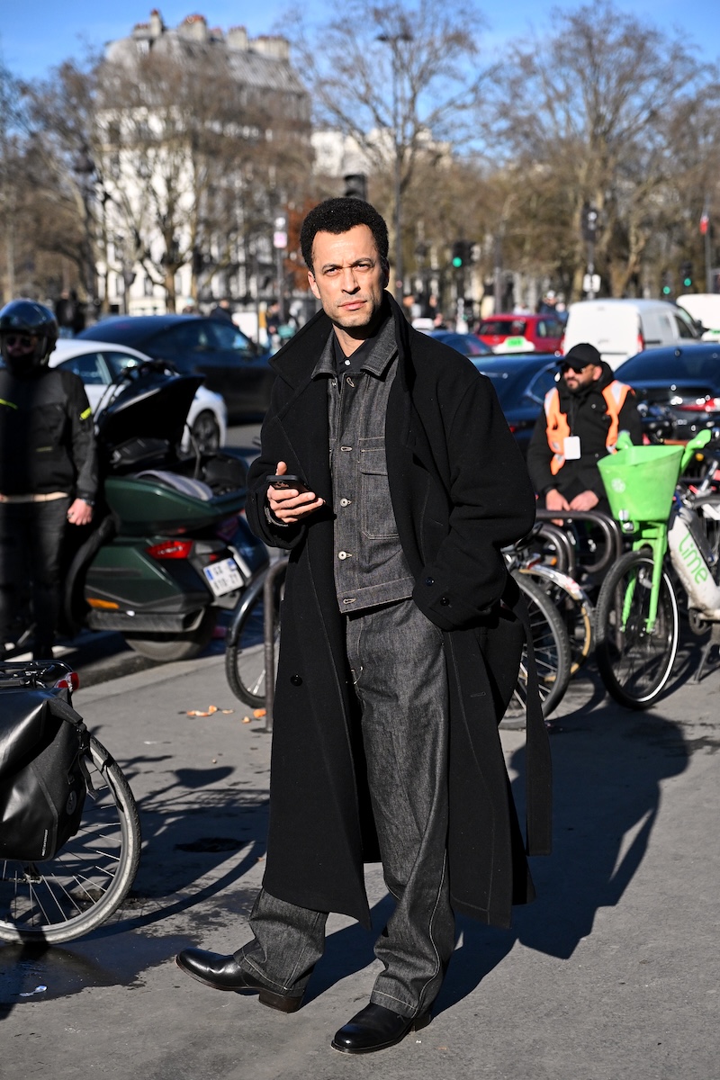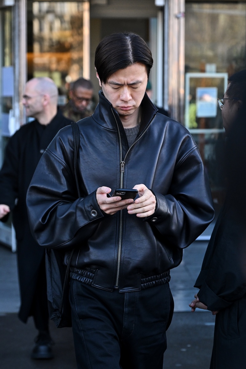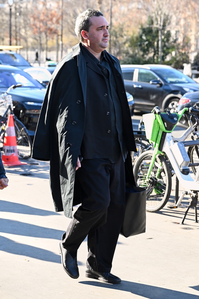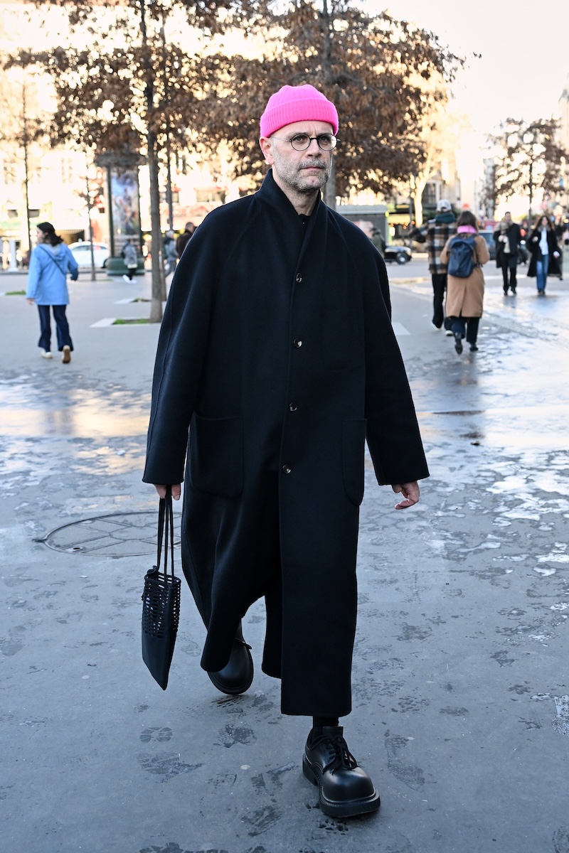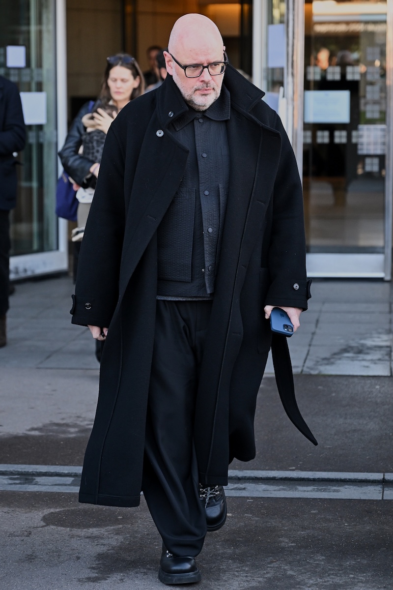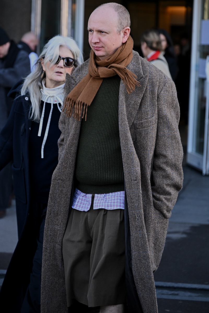 「ルメール(LEMAIRE)」は、2026-27年秋冬メンズ・コレクションをパリで現地時間1月21日に発表した。会場周辺に集ったゲストのスタイルで目立ったのは、黒やブラウン、深みのあるグリーンといったダークトーンを軸にしたレイヤリングだ。厚手のコートの下にニットやシャツを重ね、色数を抑えながらも素材感と分量で奥行きを生む着こなしが多く見られた。全体を貫いていたのは、ワークウエアに由来する実用的なアイテム群。無骨さを残しつつも、シルエットやバランスによって都会的に昇華されている点は、「ルメール」ならではのアプローチといえる。中でも支持を集めていたのがラップコートで、身体を包み込むような構築が印象的だった。その他のアウターも総じてゆったりとしたオーバーサイズで、力の抜けたエフォートレスなムードを醸し出している。足元はレースアップを中心としたクラシックなレザーシューズが主流。差し色としてマフラーを効かせるスタイリングも多く、ダークトーンの装いにさりげないリズムを添えていた。