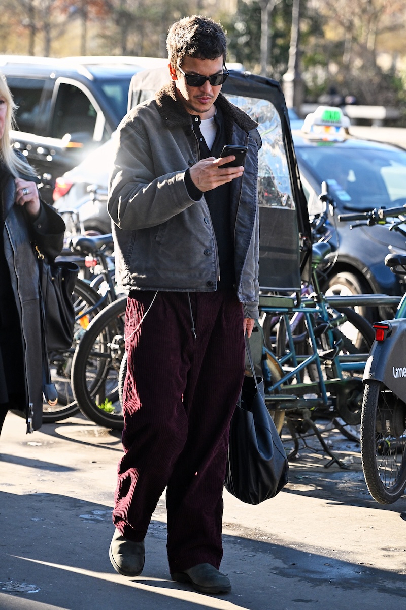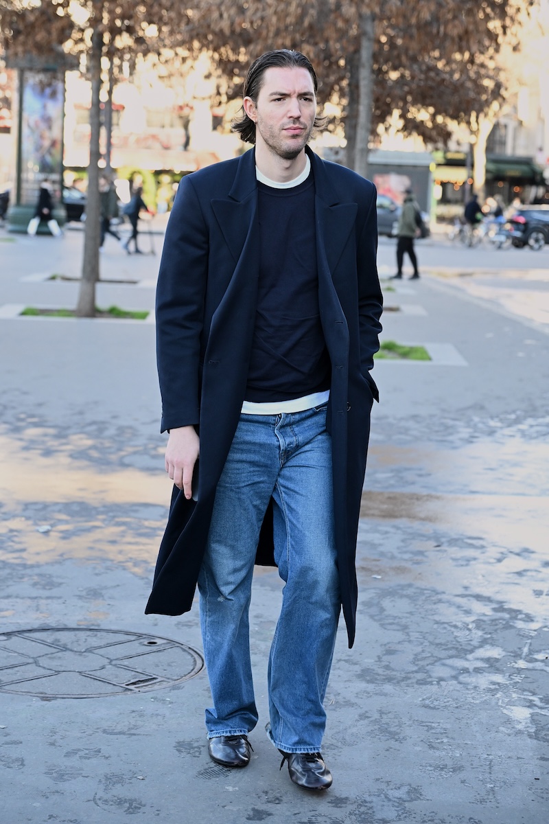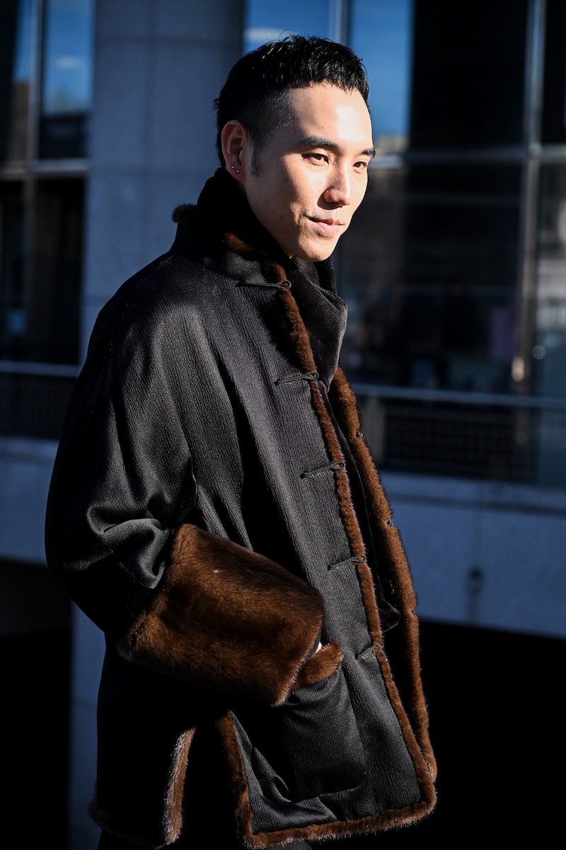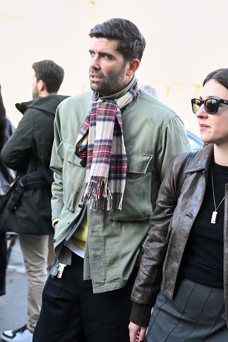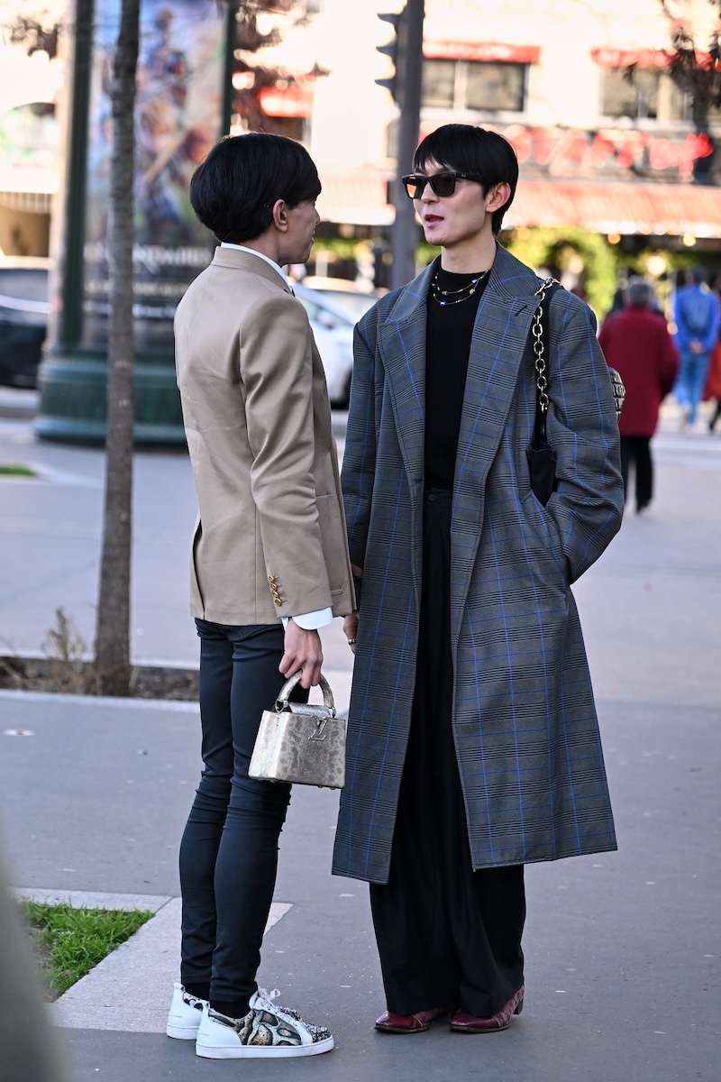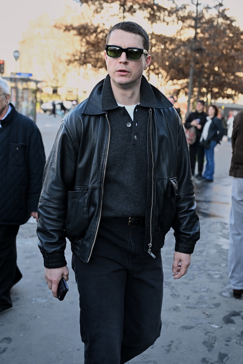 「ルメール(LEMAIRE)」は、2026-27年秋冬メンズ・コレクションをパリで現地時間1月21日に発表した。会場周辺に集ったゲストのスタイルで目立ったのは、黒やブラウン、深みのあるグリーンといったダークトーンを軸にしたレイヤリングだ。厚手のコートの下にニットやシャツを重ね、色数を抑えながらも素材感と分量で奥行きを生む着こなしが多く見られた。全体を貫いていたのは、ワークウエアに由来する実用的なアイテム群。無骨さを残しつつも、シルエットやバランスによって都会的に昇華されている点は、「ルメール」ならではのアプローチといえる。中でも支持を集めていたのがラップコートで、身体を包み込むような構築が印象的だった。その他のアウターも総じてゆったりとしたオーバーサイズで、力の抜けたエフォートレスなムードを醸し出している。足元はレースアップを中心としたクラシックなレザーシューズが主流。差し色としてマフラーを効かせるスタイリングも多く、ダークトーンの装いにさりげないリズムを添えていた。