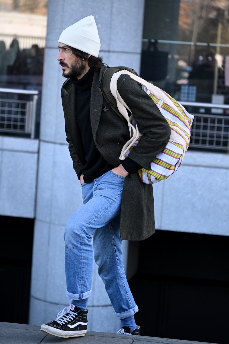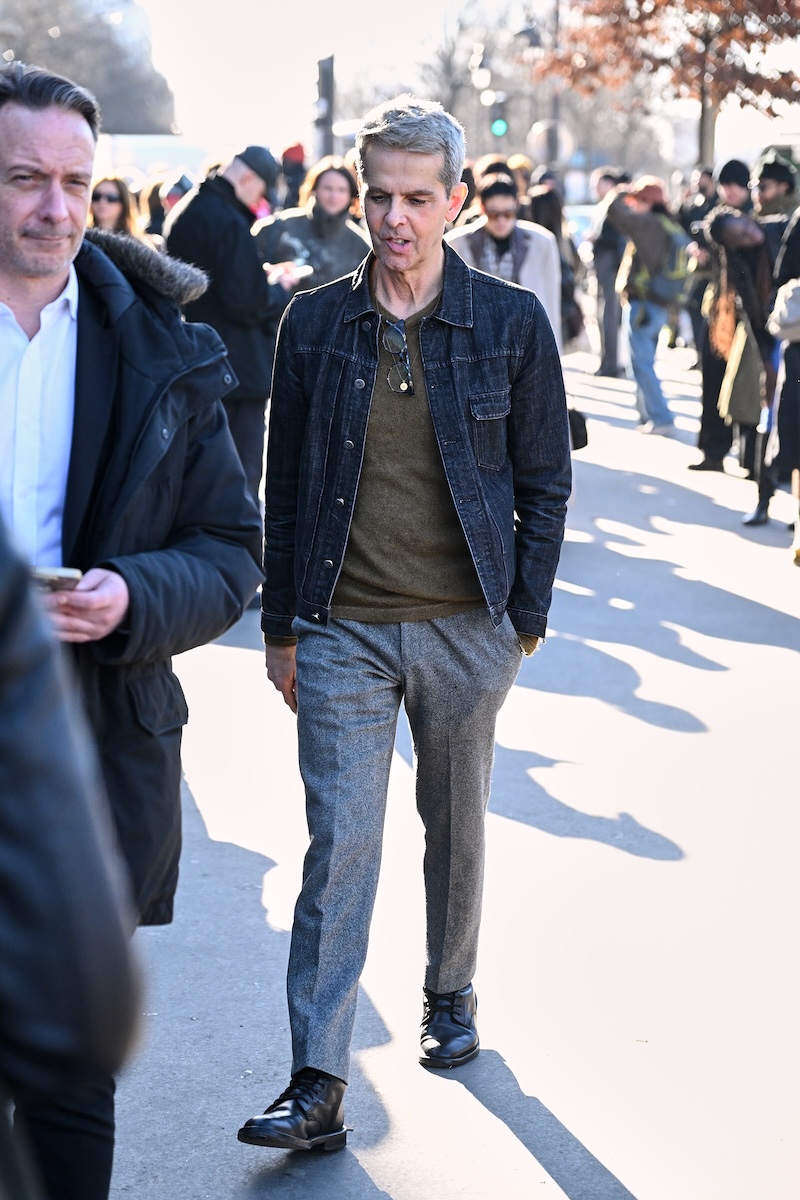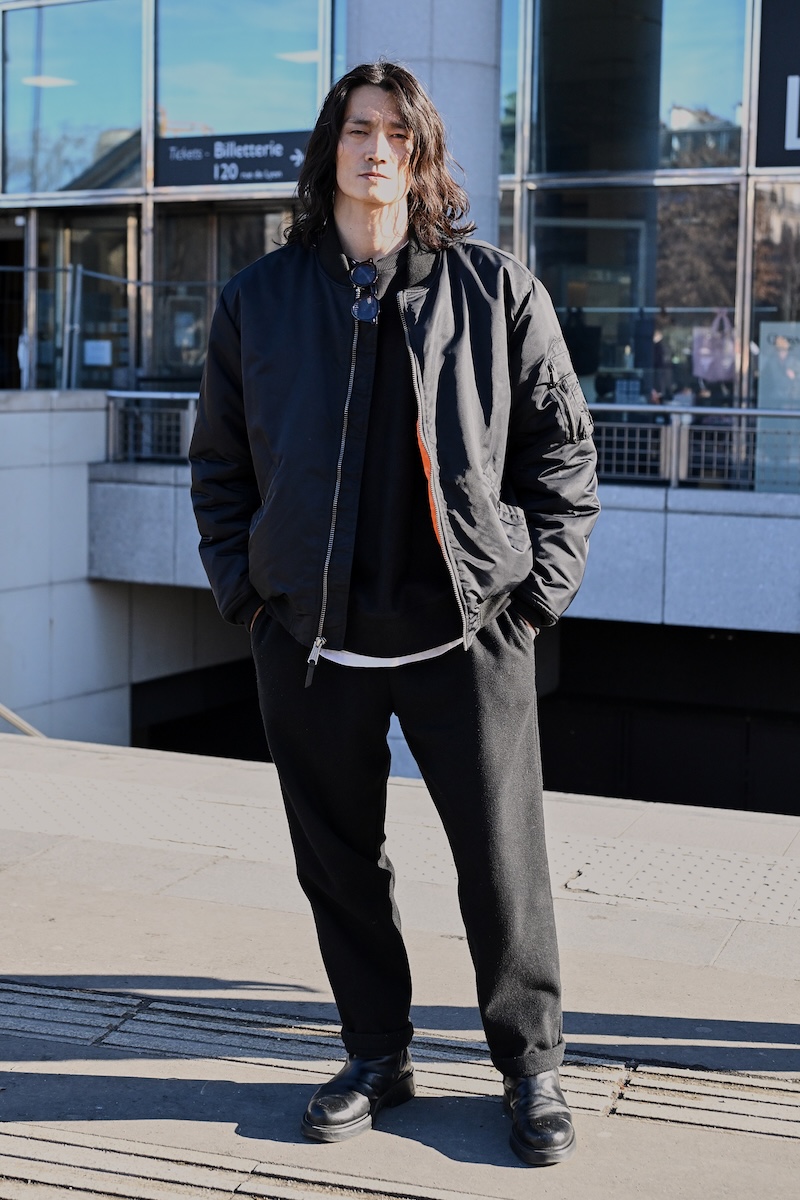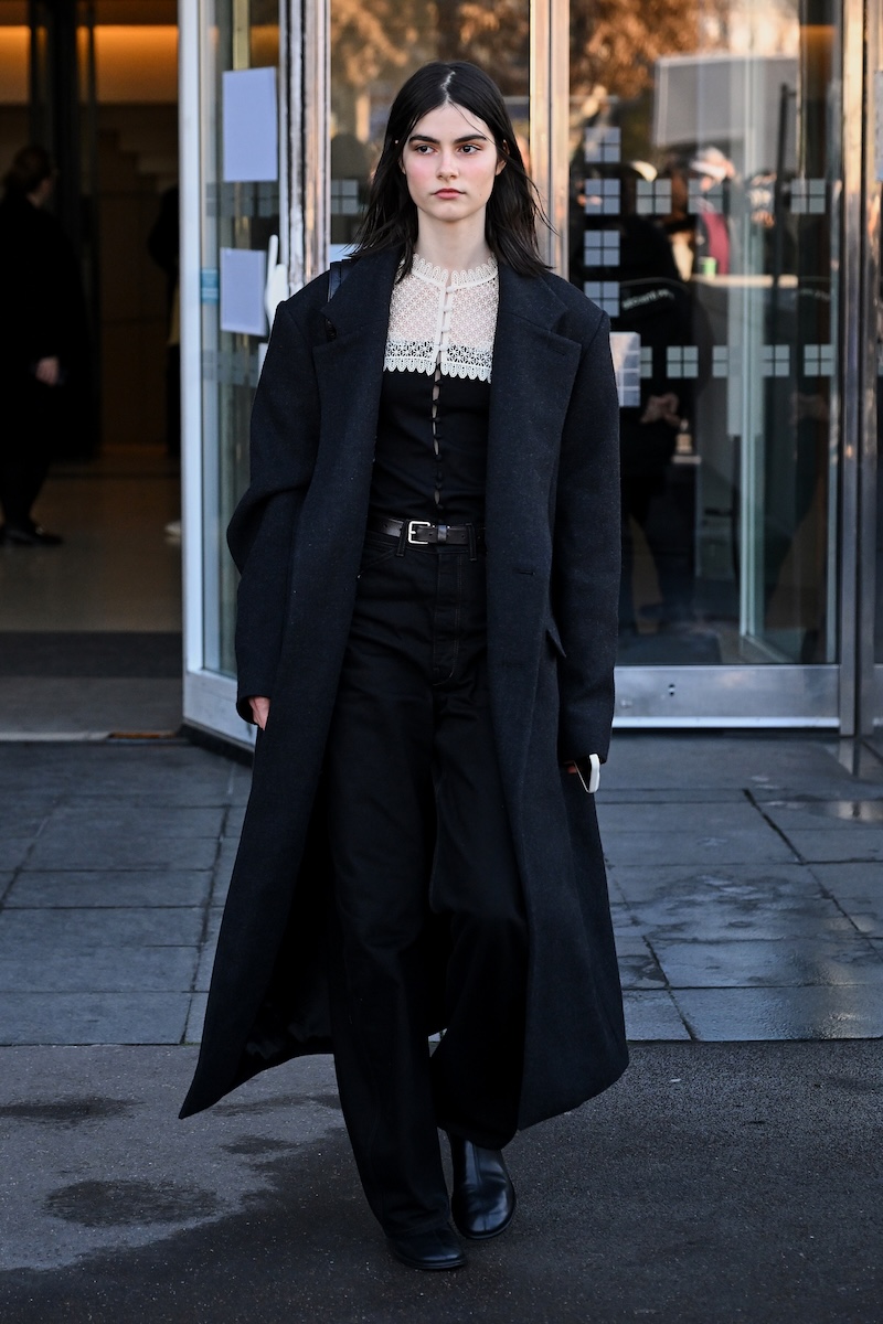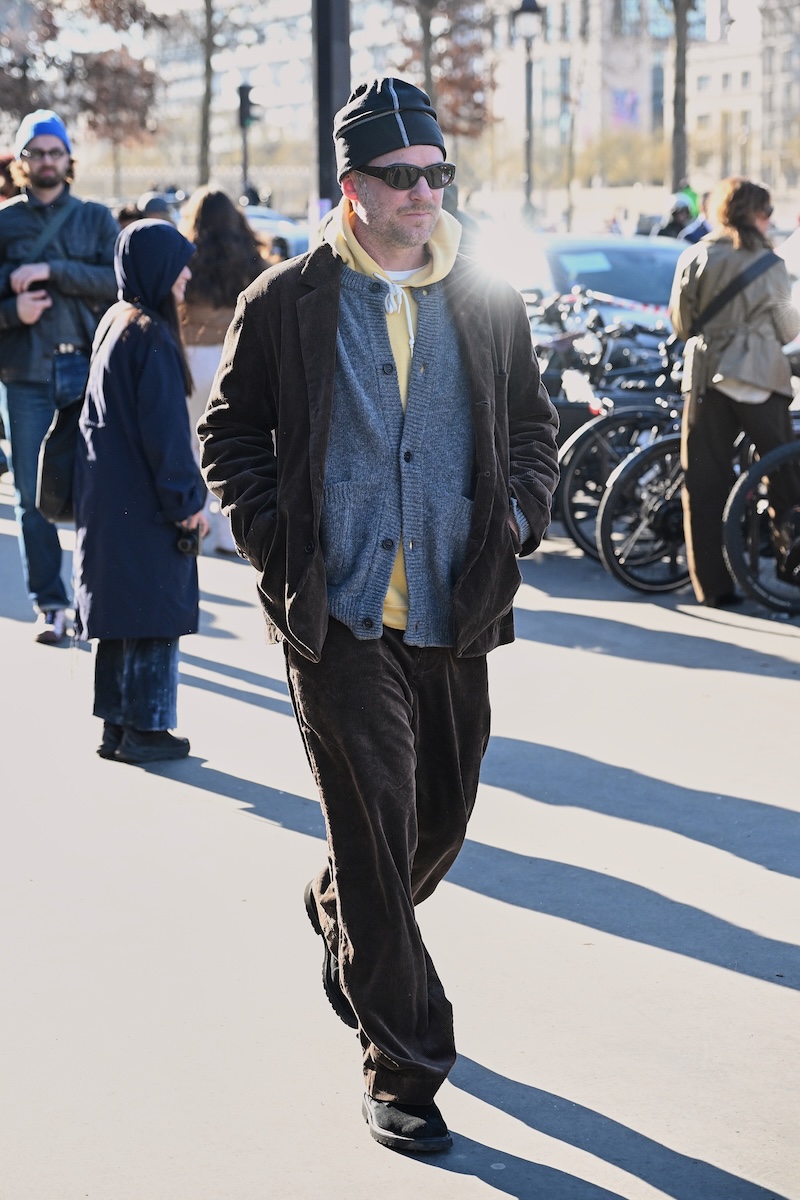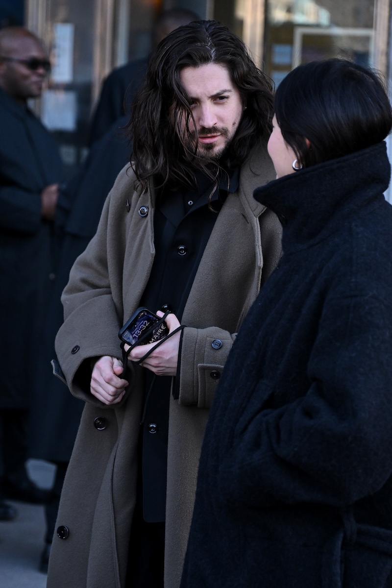「ルメール(LEMAIRE)」は、2026-27年秋冬メンズ・コレクションをパリで現地時間1月21日に発表した。会場周辺に集ったゲストのスタイルで目立ったのは、黒やブラウン、深みのあるグリーンといったダークトーンを軸にしたレイヤリングだ。厚手のコートの下にニットやシャツを重ね、色数を抑えながらも素材感と分量で奥行きを生む着こなしが多く見られた。全体を貫いていたのは、ワークウエアに由来する実用的なアイテム群。無骨さを残しつつも、シルエットやバランスによって都会的に昇華されている点は、「ルメール」ならではのアプローチといえる。中でも支持を集めていたのがラップコートで、身体を包み込むような構築が印象的だった。その他のアウターも総じてゆったりとしたオーバーサイズで、力の抜けたエフォートレスなムードを醸し出している。足元はレースアップを中心としたクラシックなレザーシューズが主流。差し色としてマフラーを効かせるスタイリングも多く、ダークトーンの装いにさりげないリズムを添えていた。