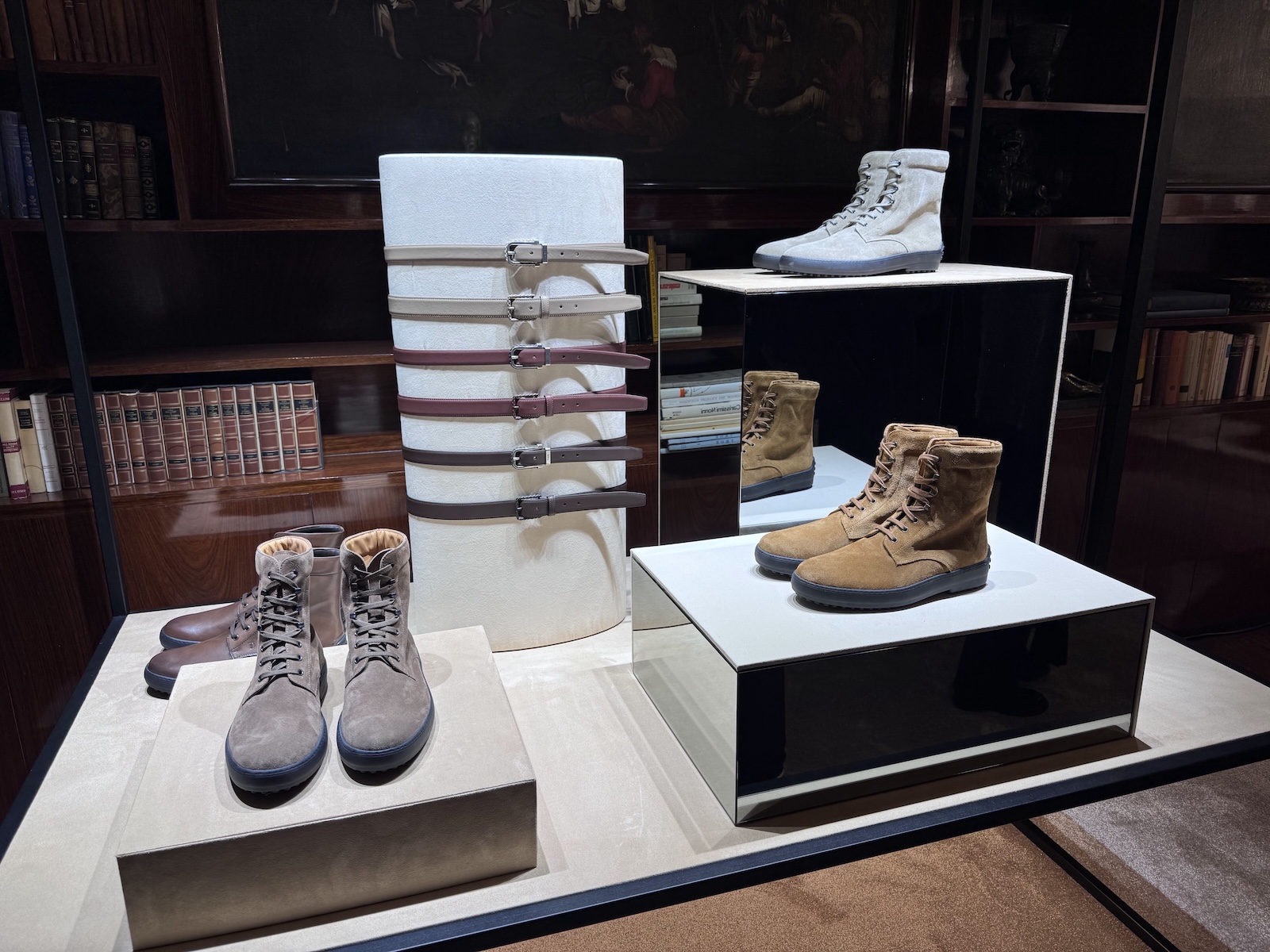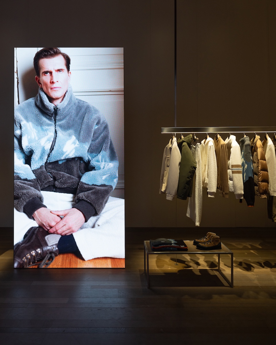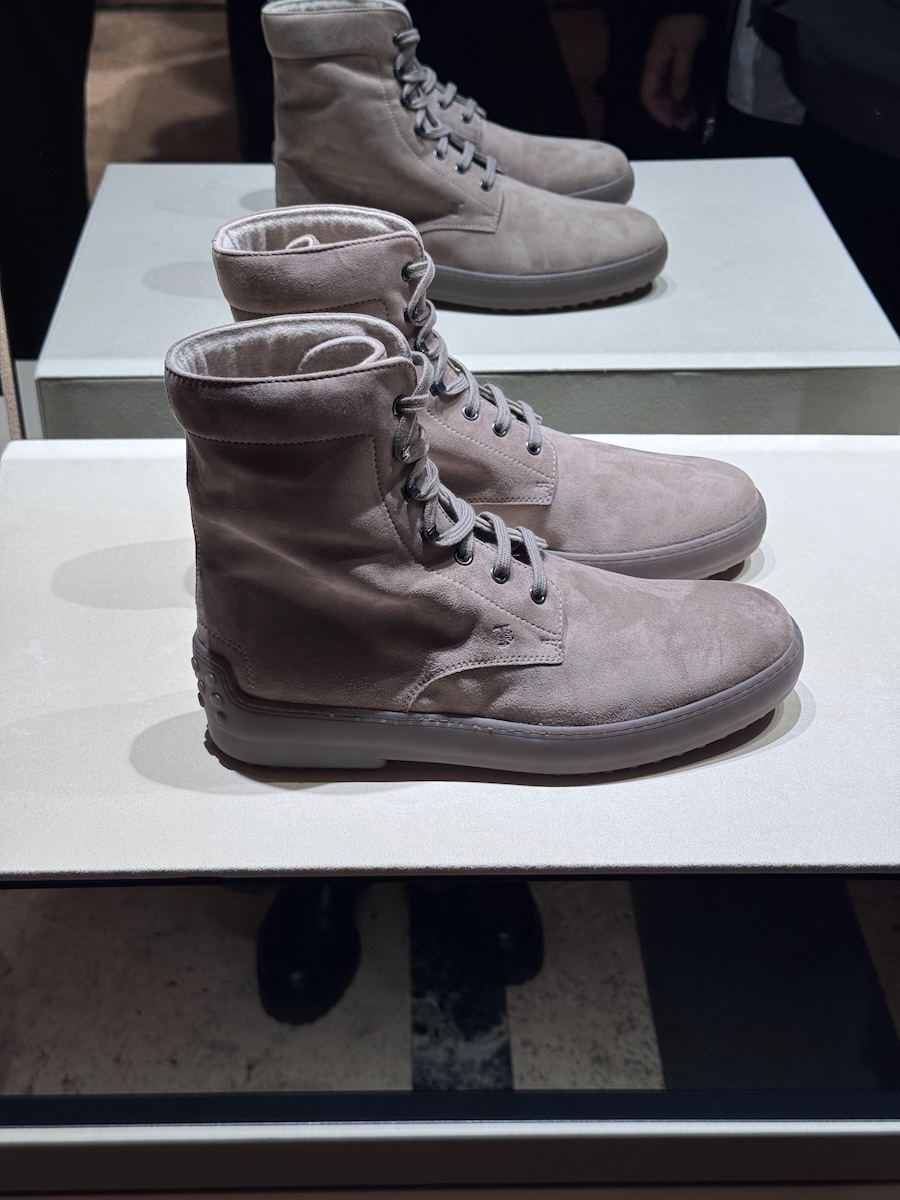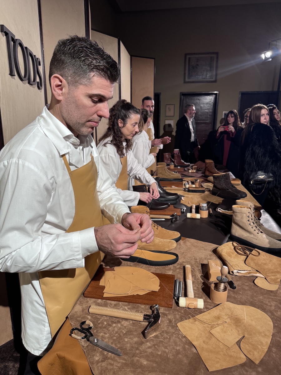 ブランドの定番“ウィンター ゴンミーノ”もアップデートしていました。今季は「原点回帰」を掲げ、極力オリジナルのソールやプロポーションに戻しているそう。会場では職人がアンティーク加工やハンドステッチの工程を実演していました。クラシックなルックスの一方で、ライニングにはカシミアやシアリングを採用し、雪山でも耐えうる機能性を秘めています。