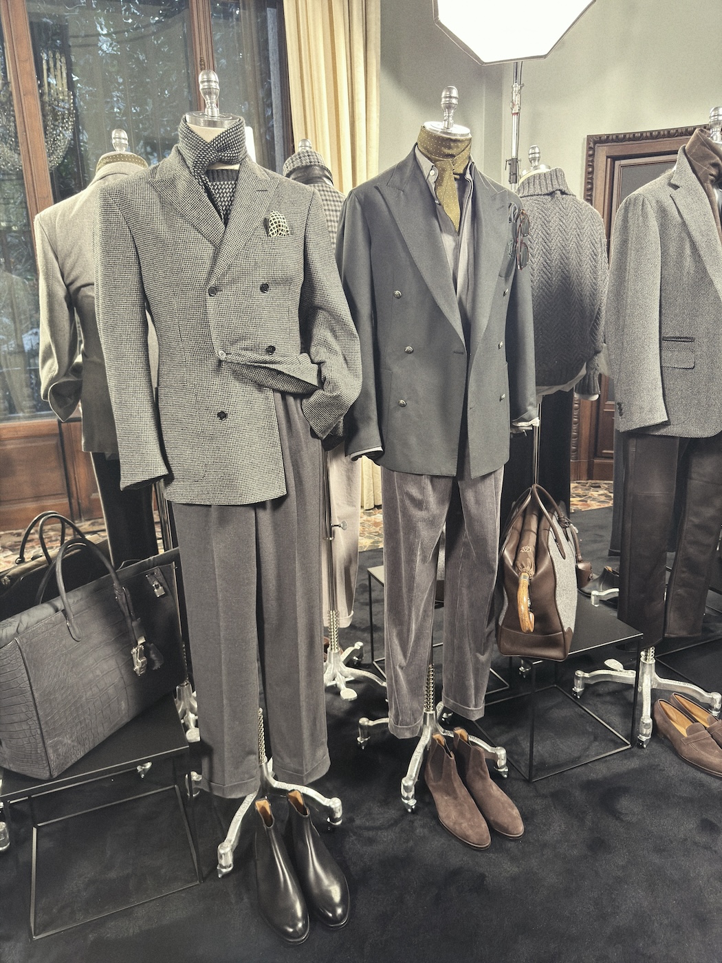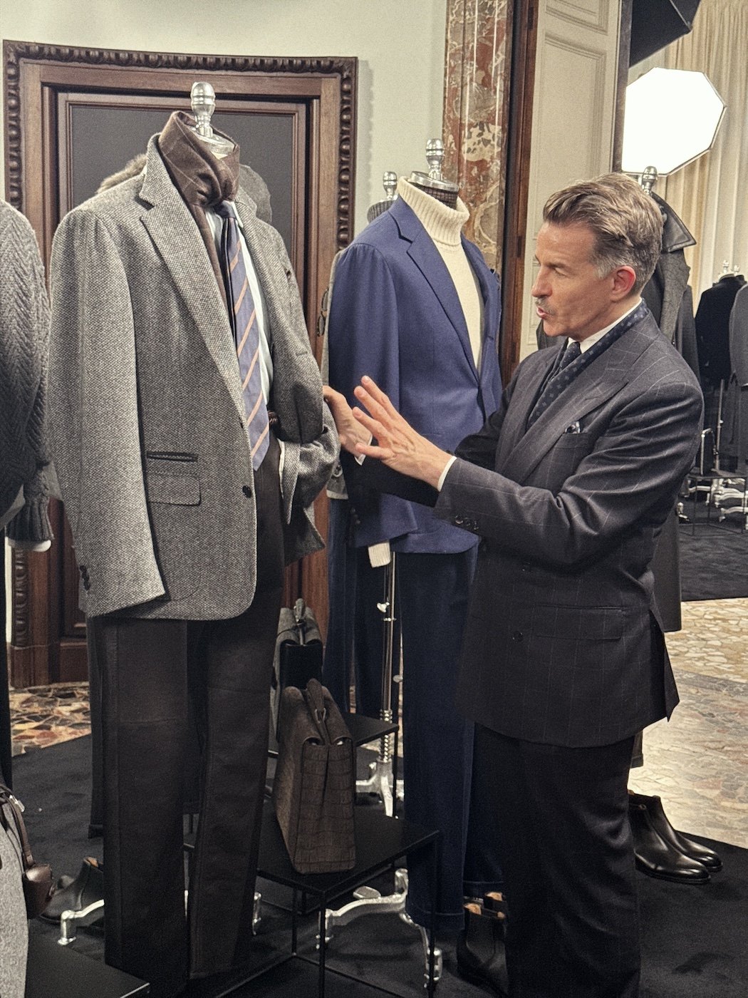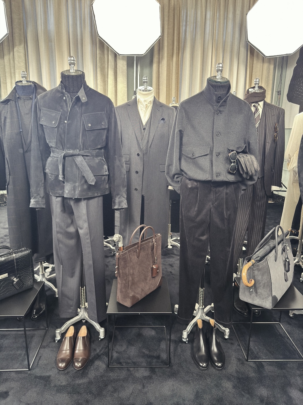 本橋:「ダンヒル(DUNHILL)」の展示会ではクリエイティブ・ディレクターのサイモン・ホロウェイ自身に会場を案内してもらいました。彼が繰り返し口にしていたのが「シネマティック(映画的)」や「ステルシー(隠密的)」という言葉。最近のトレンドである「クワイエット・ラグジュアリー」のその先、もっと深くて危険な香りのする「スパイ映画のような世界観」が、今回のコレクションの核心です。