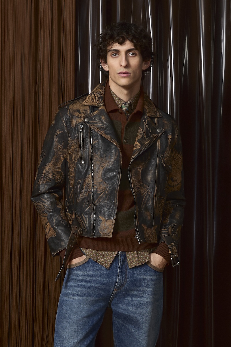 ウィメンズでは華やかでマキシマリズムなクリエイションを続ける一方で、メンズは昨シーズンかなりコンサバにシフトした印象でしたが、今季はマルコらしさがカムバック。クラシシズムと遊び心が交錯するスタイルを提案します。例えば、タイドアップしたシャツを合わせたチェックのスーツは、ジャケットの縁やパンツのサイドラインに小さなフェザーを装飾。レザーのバイカージャケットにはカービングで動物モチーフを描き、シンプルなウォッシュドジーンズやボーダーのポロニットと合わせます。