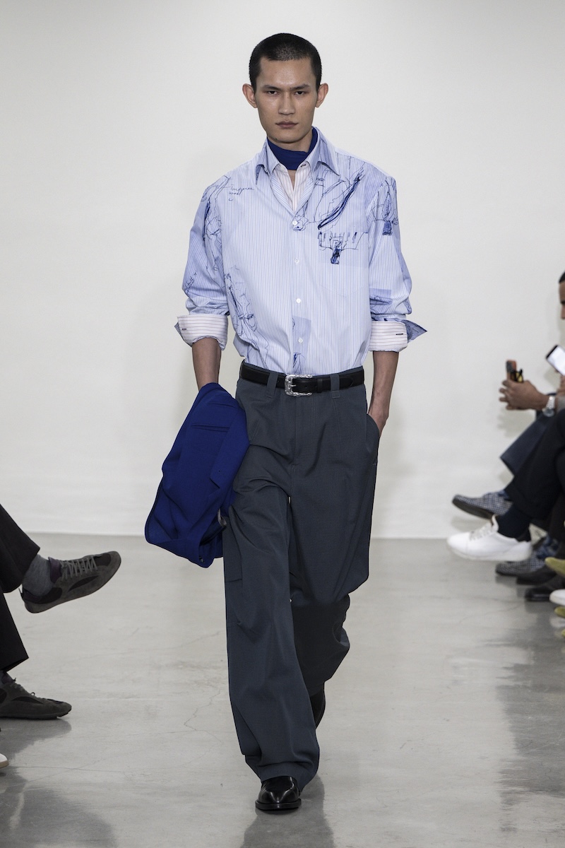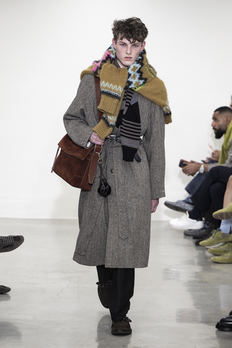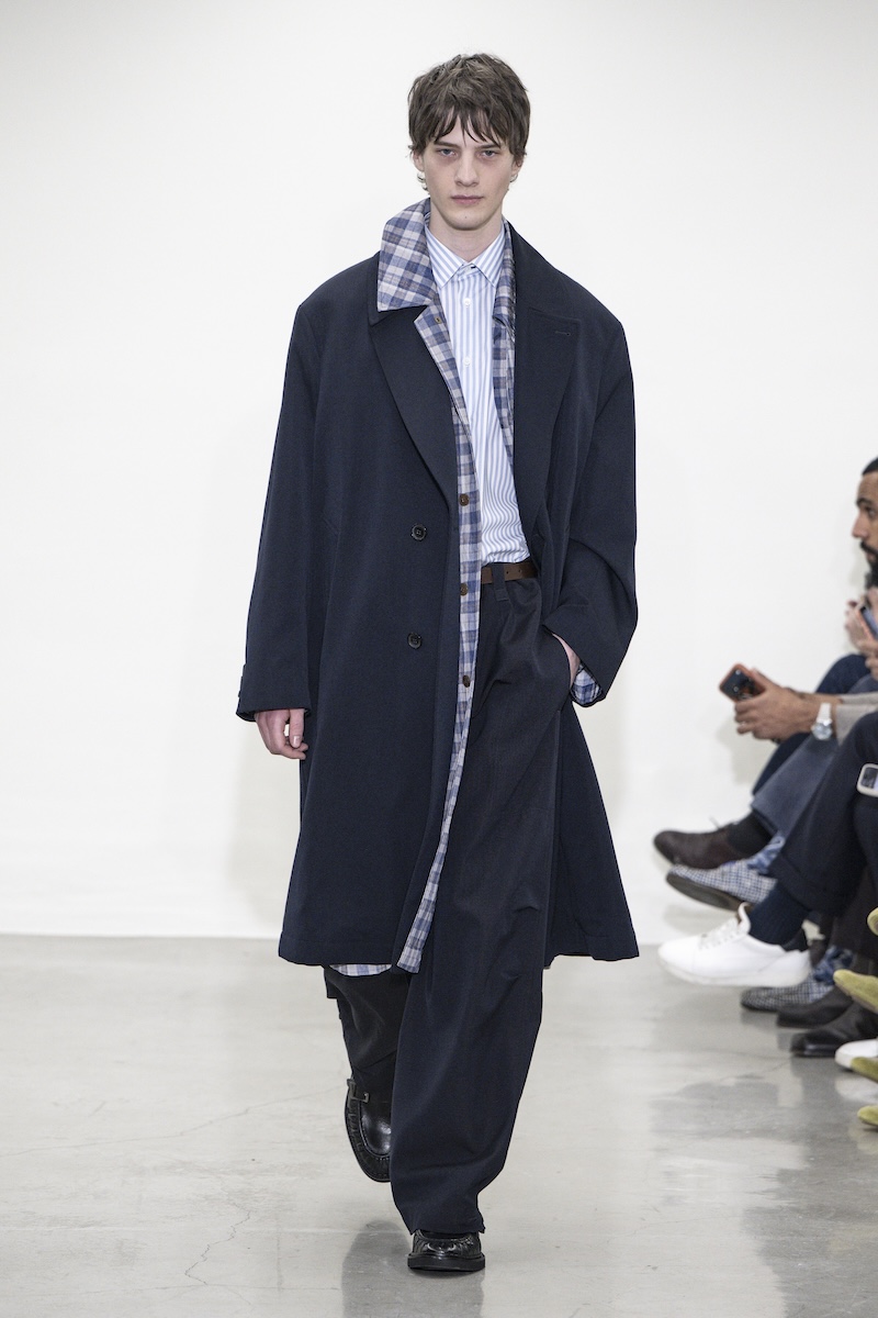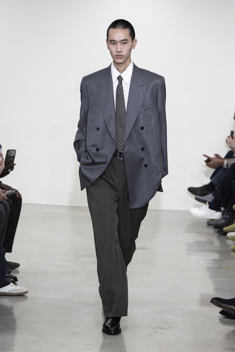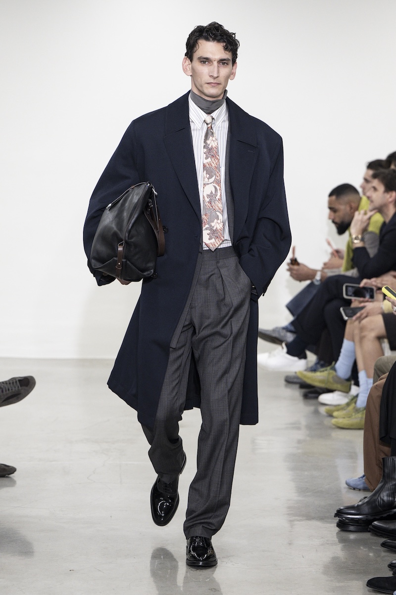 印象的だったのは、ゆったりとしたシルエットのボクシーなジャケットやコート、そしてローウエスト気味で穿くモデルも見られたワイドパンツ。クラシックなスーツ地やドニゴールツイードを多用しながら、アノラックなどのユーティリティーアイテムやヘンリーネックトップス、フェアアイルセーターと合わせ、ミックス感のあるスタイルに仕上げています。また、ポールさんがスーツを日々身にまとうように、「日常に根差したユニフォーム」としてシャツとネクタイを愛した芸術家ジャン・コクトー (Jean Cocteau)から着想を得たタイドアップスタイルも繰り返し登場。ただ、スタイル全体にはフォーマル感よりもユルさが漂い、それが若々しい空気感につながっています。