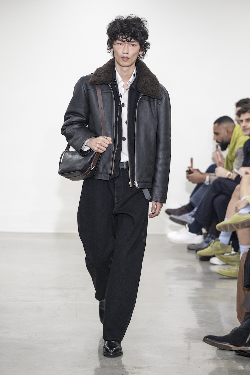 スパイ的な「隠密性」は、素材使いに表れていました。サイモンお気に入りのルックに使われている「レザー・ジーンズ」は一見チャコールグレーの5ポケットパンツなのですが、実は仏ラムスキン製。しかも、レーザーカットした革を手作業で「不可視(invisibly)」につなぎ合わせ、ウールカシミアとボンディングするなど、かなりの技巧を凝らしています。