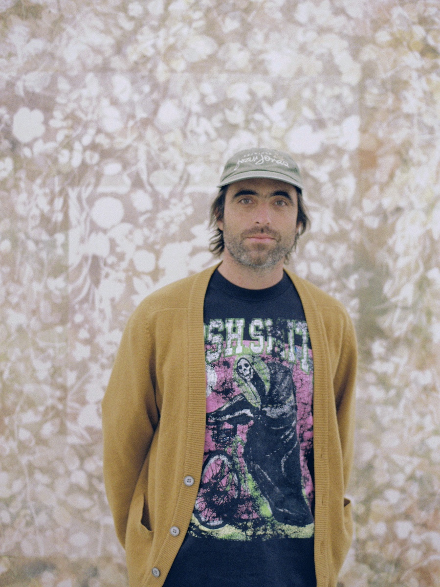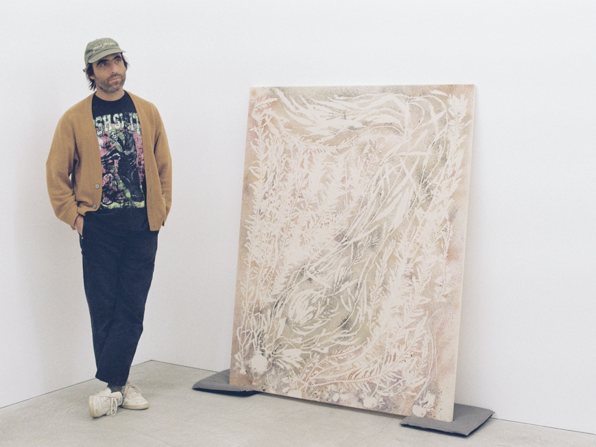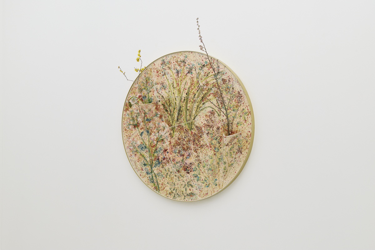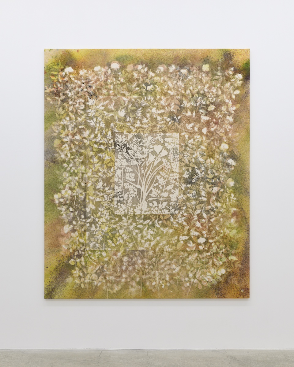 ニューヨークとロサンゼルスを拠点にする彼の軸となるアプローチはペインティングだが、いわゆるアトリエで筆とともに描かれるものではない。地面や野原にキャンバスを敷き、採取した植物でコンポジションを編成。その上から水に反応する顔料をまき、屋外に一定期間置くことで湿度や風といった自然の力も加わり繊細なシルエットが浮かび上がる。いわば場所の特性を活かした表現である。