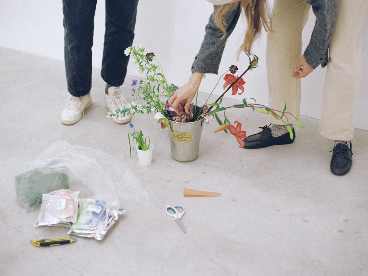 サム:昨年、「ザ・ノース・フェイス」とコラボレーションをした際に、小山登美夫ギャラリーとの協業で個展を行いました。会場の草月会館は「いけばな草月流」の総本山ということもあり、レッスンを見学できる機会がありました。そこで、花瓶や彫刻を掛け合わせた実験的なスタイルに刺激を受けて、花を生けるポケットのある彫刻作品が生まれたんです。