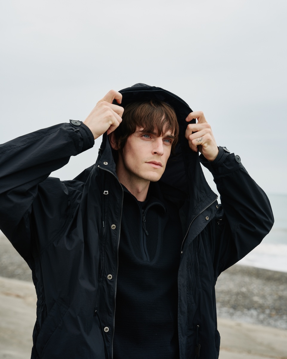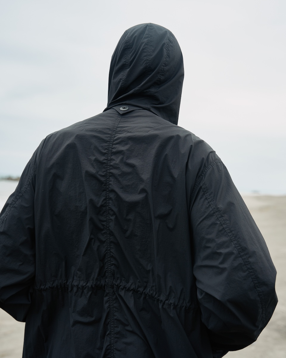今回で第2弾目となる本コラボアイテムは、ミリタリーアーカイブである“M-59 パーカ”をベースに、フィッシュテールを配し、袖周りにゆとりを持たせたAラインシルエットへ再構築した。アシンメトリーに配置したファスナーポケットが、アクセントだ。裏仕様は前身頃のみにメッシュを配し、軽量化を重視した。素材には、20D×20Dの細番手ナイロンを使用した薄手のストレッチタフタを採用している。ダライタッチで肌離れがよく、軽さと凹凸感が特徴の素材だ。