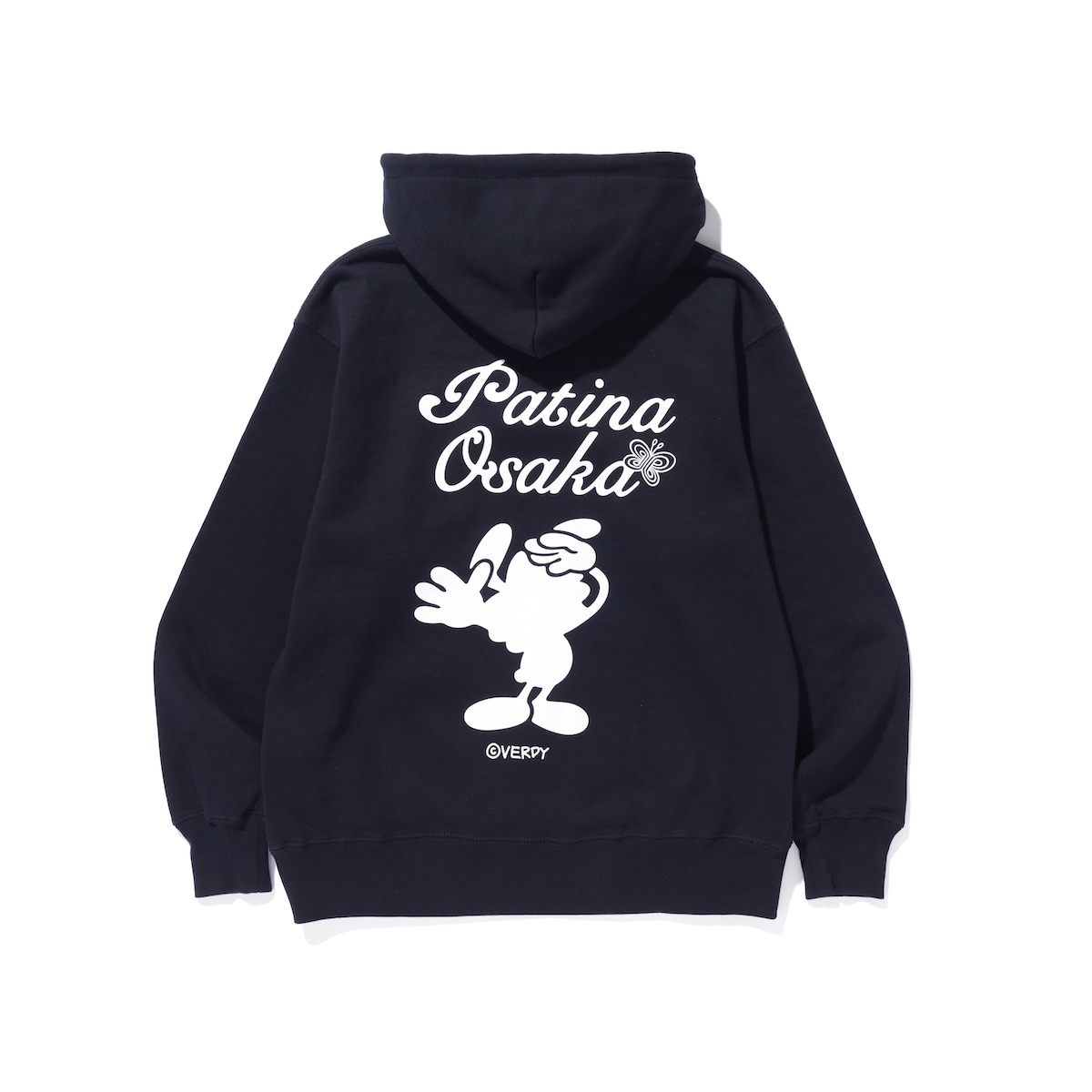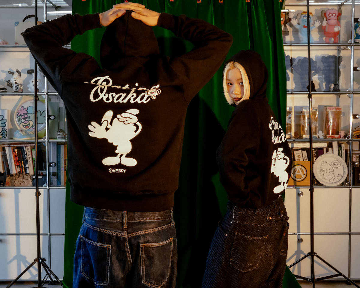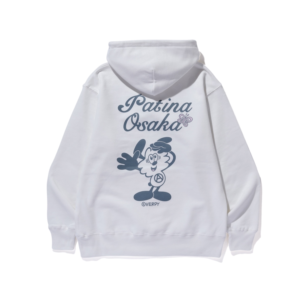 本コレクションは、VERDYならではの遊び心と洗練されたグラフィックを通して、ホテルの建築美や空気感、大阪という都市が持つエネルギーをライフスタイルコレクションに落とし込んだ。アイテムは、クルーネックスエット(1万6500円)、フーディー(1万7600円)、ソックス(2860円)をラインアップ。いずれも前回と同様に、パティーナのロゴ、象徴的なモチーフの蝶、VERDYのキャラクター“Vick(ヴィック)”という3つの要素を軸にデザインした。また、ソックスは大阪発のソックスブランド「ウィムジー(WHIMSY)」を迎えたトリプルコラボとして制作し、ラグジュアリーとストリート、スケートカルチャーを融合した1本に仕上げた。