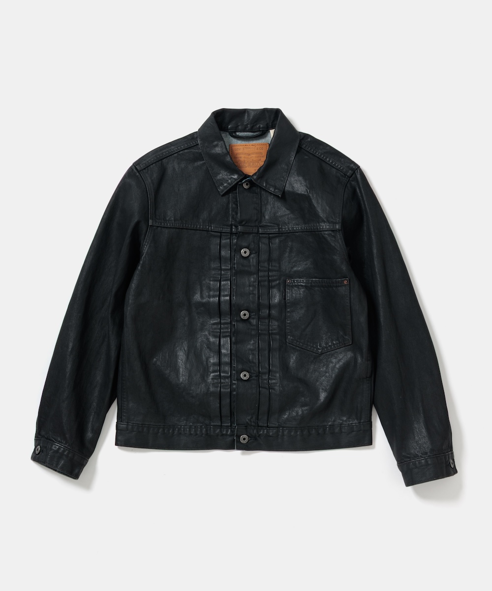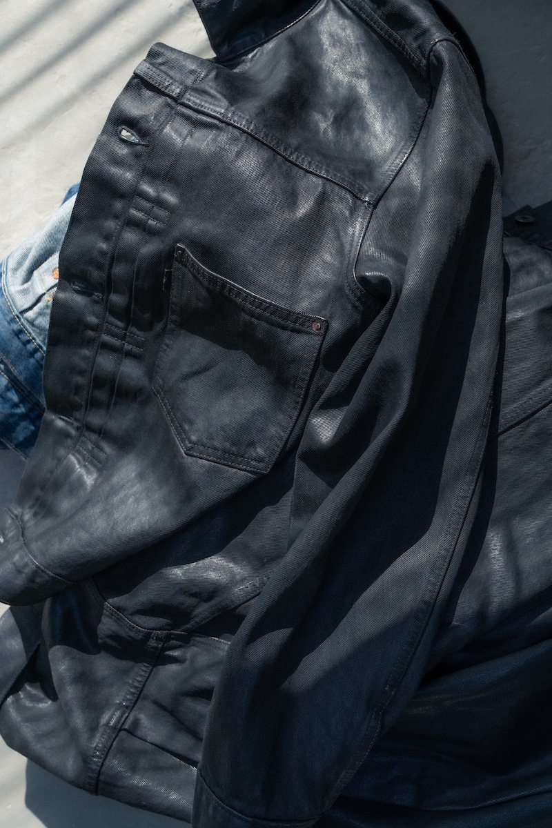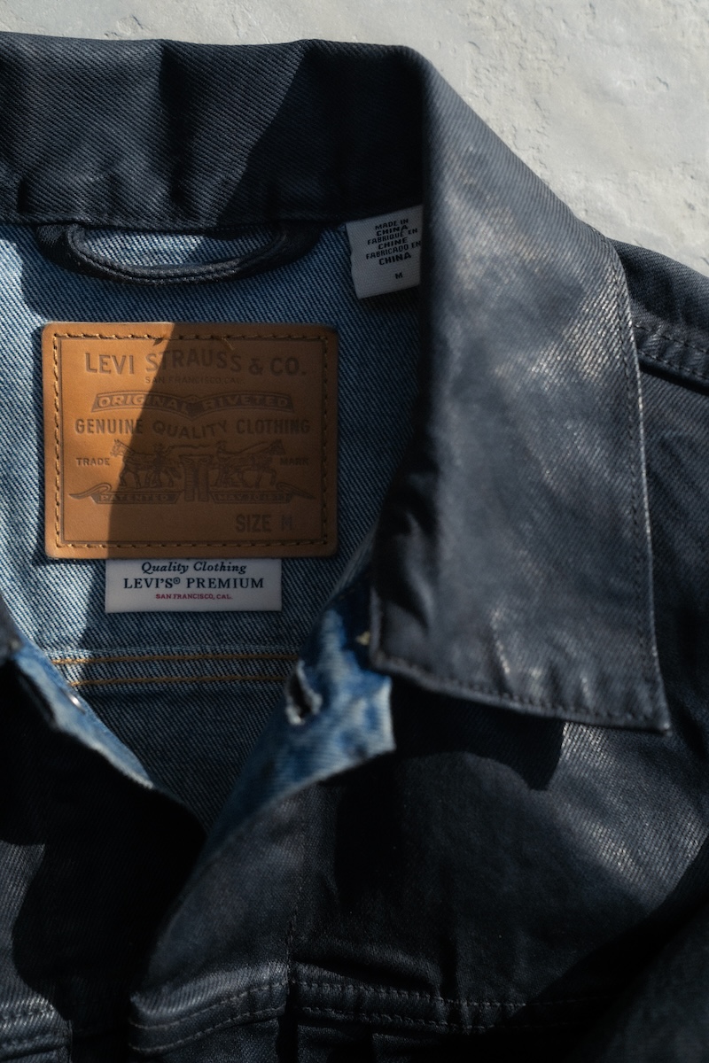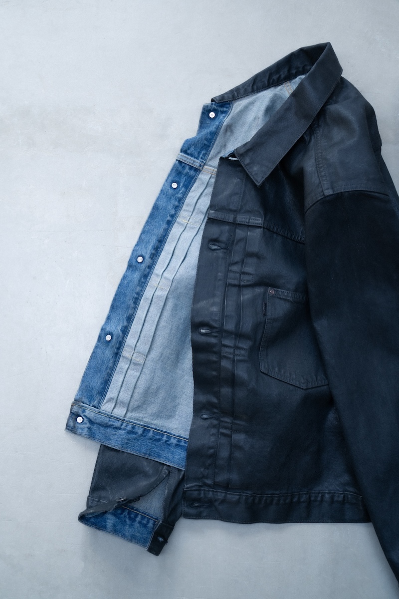 同アイテムは「リーバイス」の代表作の1つである“タイプ1トラッカージャケット”を現代的に再解釈したモデルをベースにしており、デニムのベースカラーのウォッシュをかけたビンテージ風のライトインディゴカラーの上に手作業で施されたブラックのPUコーティングが最大の特徴だ。