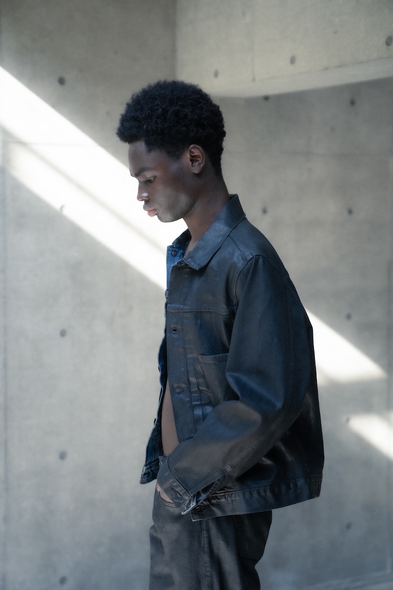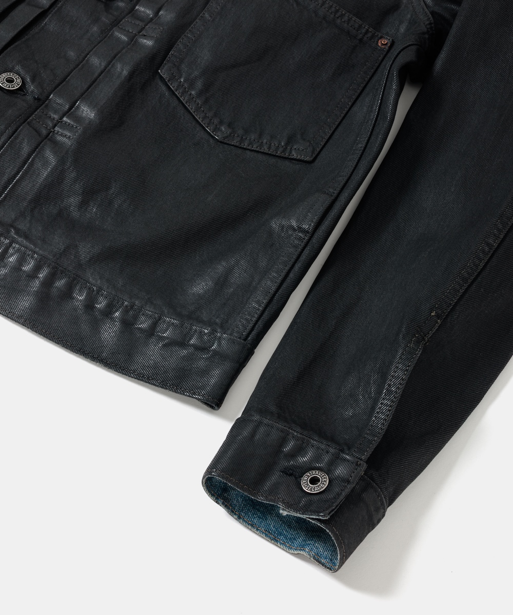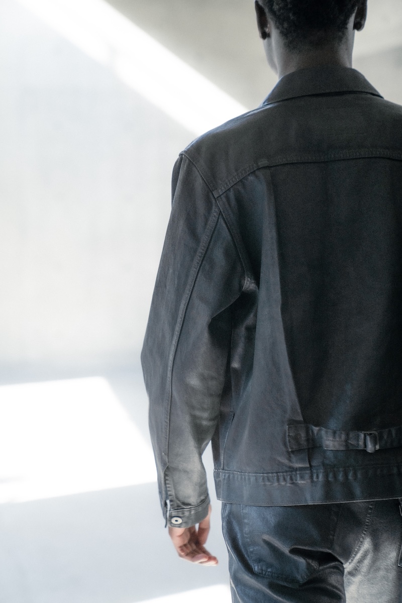 同アイテムは「リーバイス」の代表作の1つである“タイプ1トラッカージャケット”を現代的に再解釈したモデルをベースにしており、デニムのベースカラーのウォッシュをかけたビンテージ風のライトインディゴカラーの上に手作業で施されたブラックのPUコーティングが最大の特徴だ。
