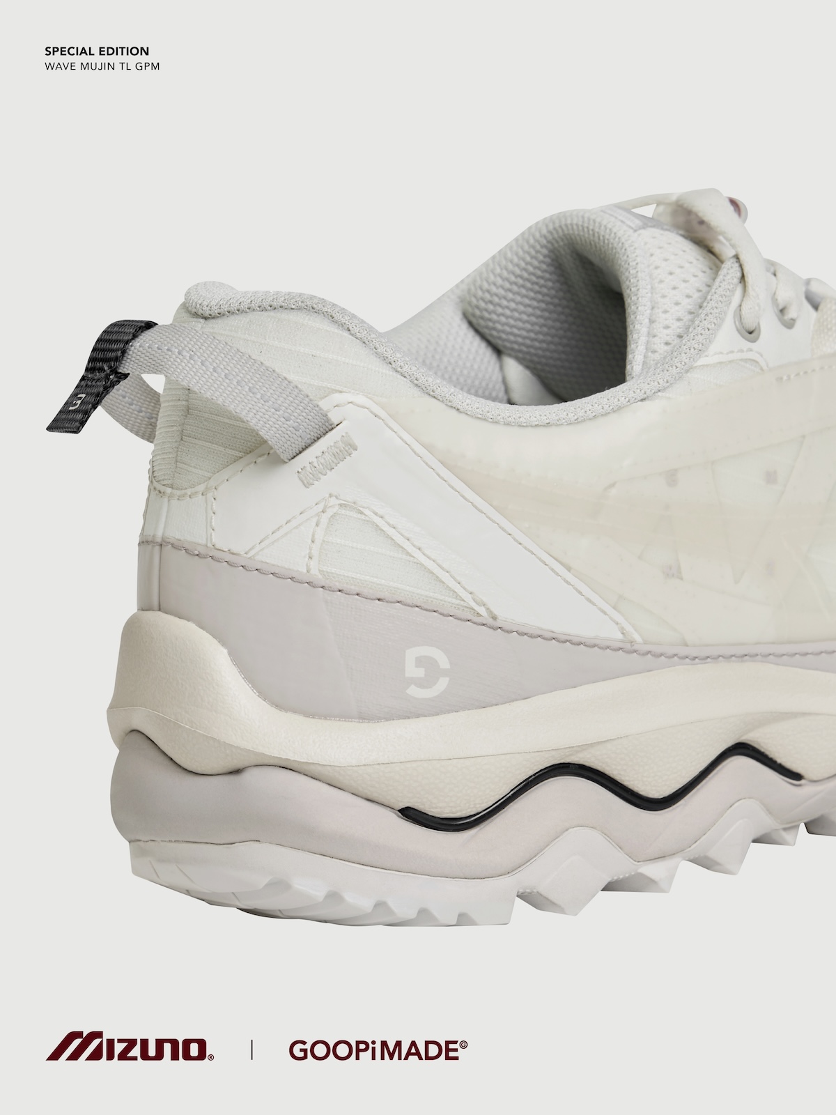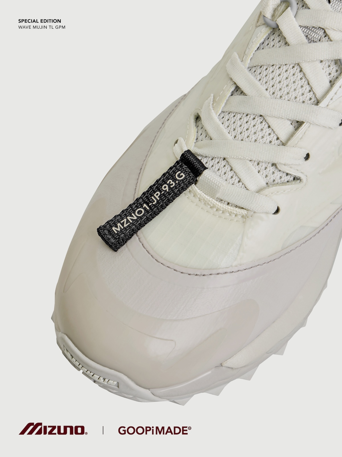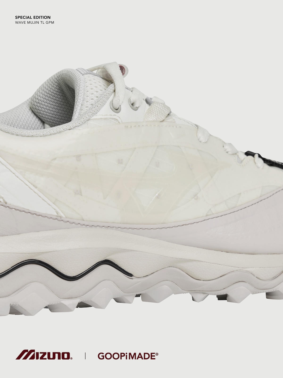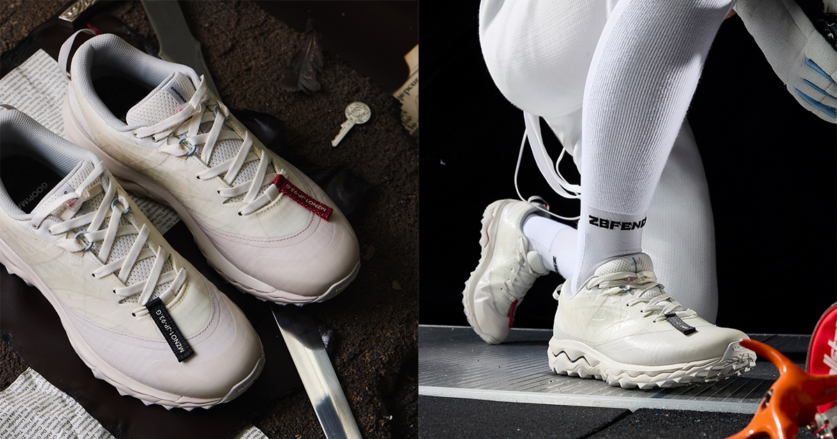 本アイテムは、トレイルランニングシューズのアーカイブデザインをもとに「ミズノ」が設計した“ウエーブ ムジン(WAVE MUJIN) TL”をベースに、「グーピーメイド」が掲げる“Build To Stand Upon The Hill – 山頂に立つための装備”をテーマにデザイン。都市生活とアウトドアをシームレスにつなぐ “All-Terrain (全天候・全環境)”を意識した一足だ。アッパーには、「グーピーメイド」の象徴的ディテールである “非対称構造” や “調整システム”を落とし込み、ホワイト PU とメッシュを採用。ミッドソールには、ミズノ独自の基幹機能である “ミズノウエーブ” テクノロジーを搭載し、クッション性と安定性を両立した。またアウトソールには、フランスの自動車タイヤブランド、ミシュランのラバーソールを採用した。