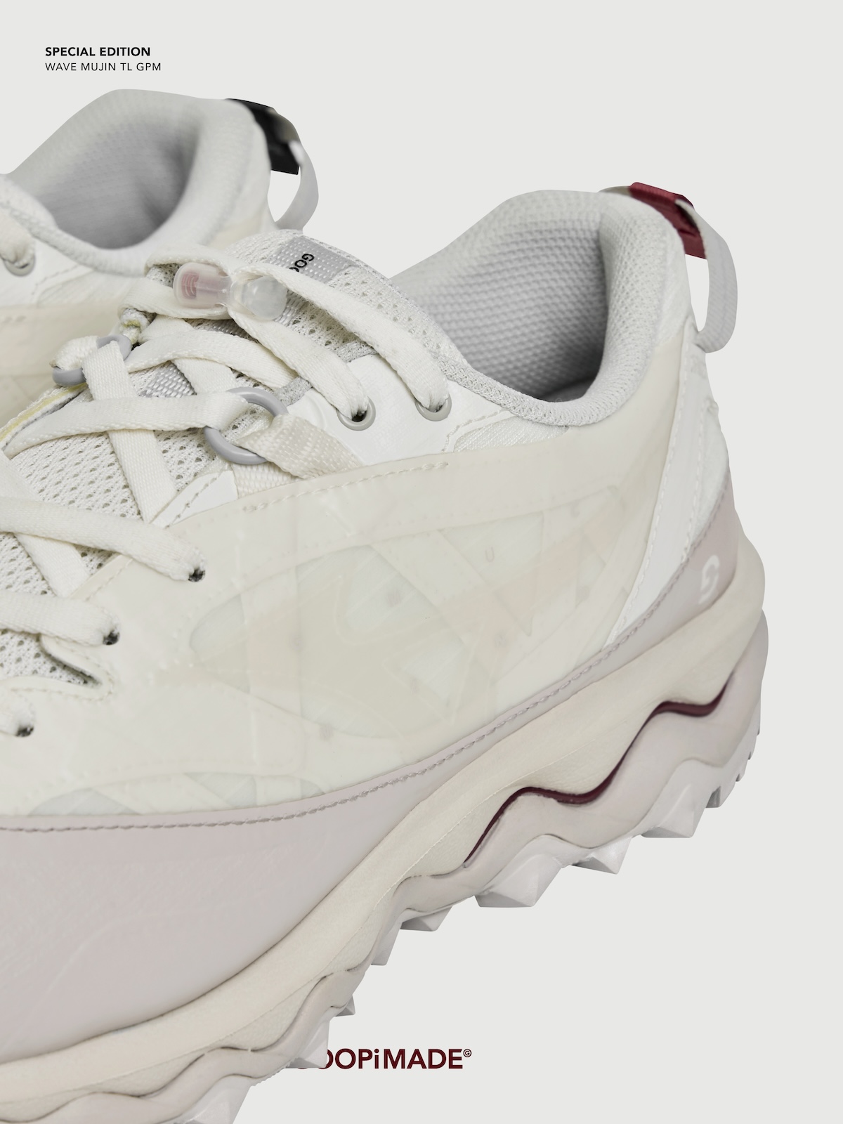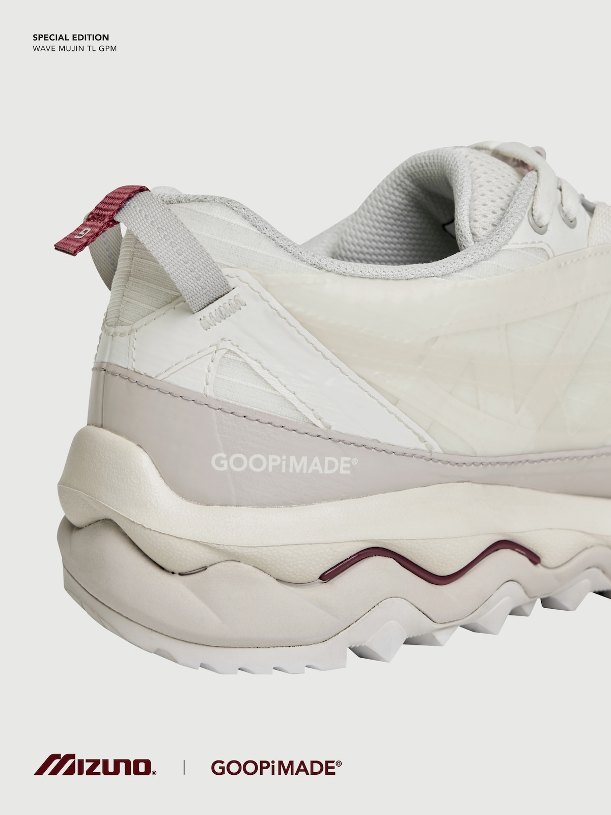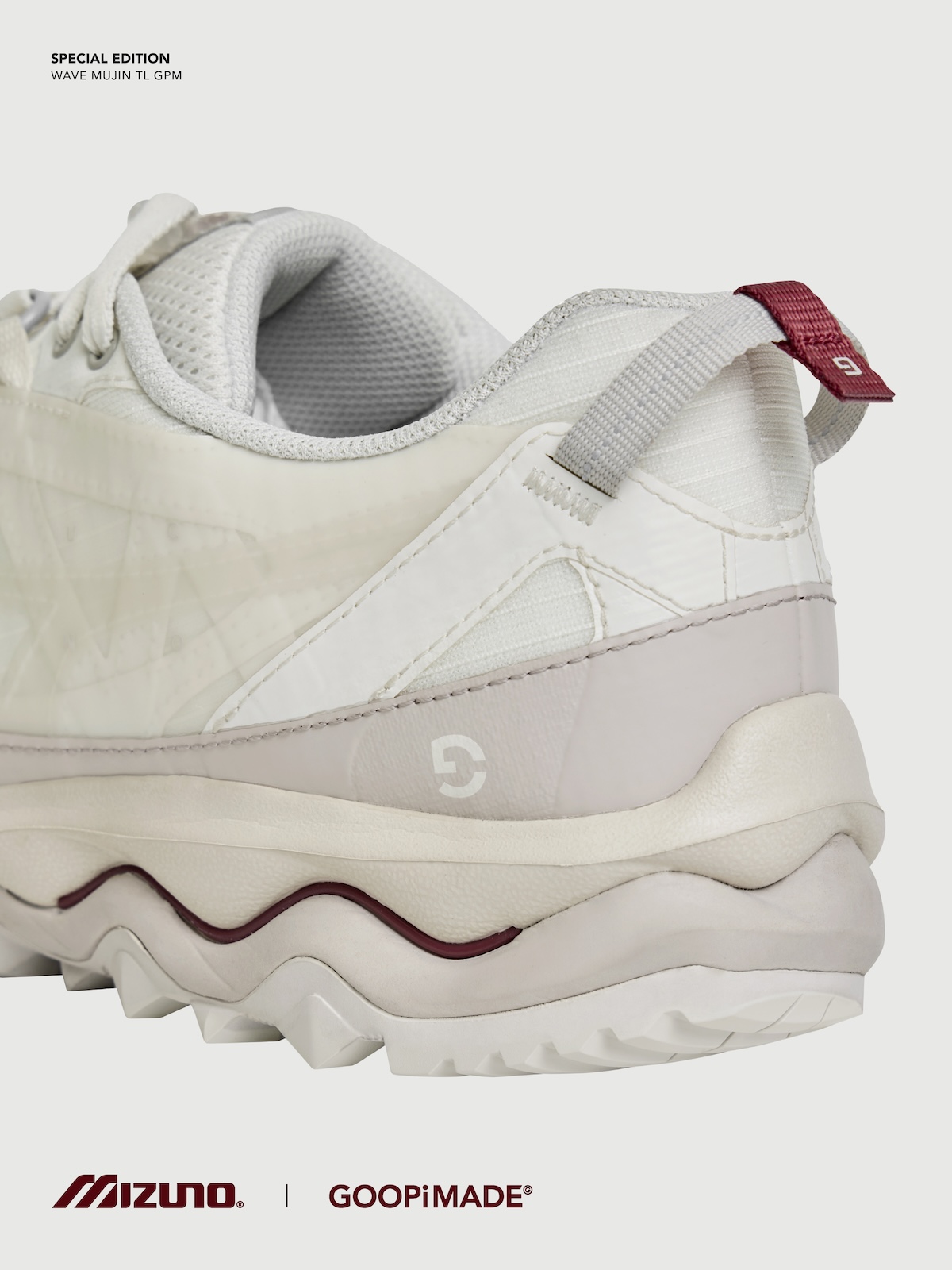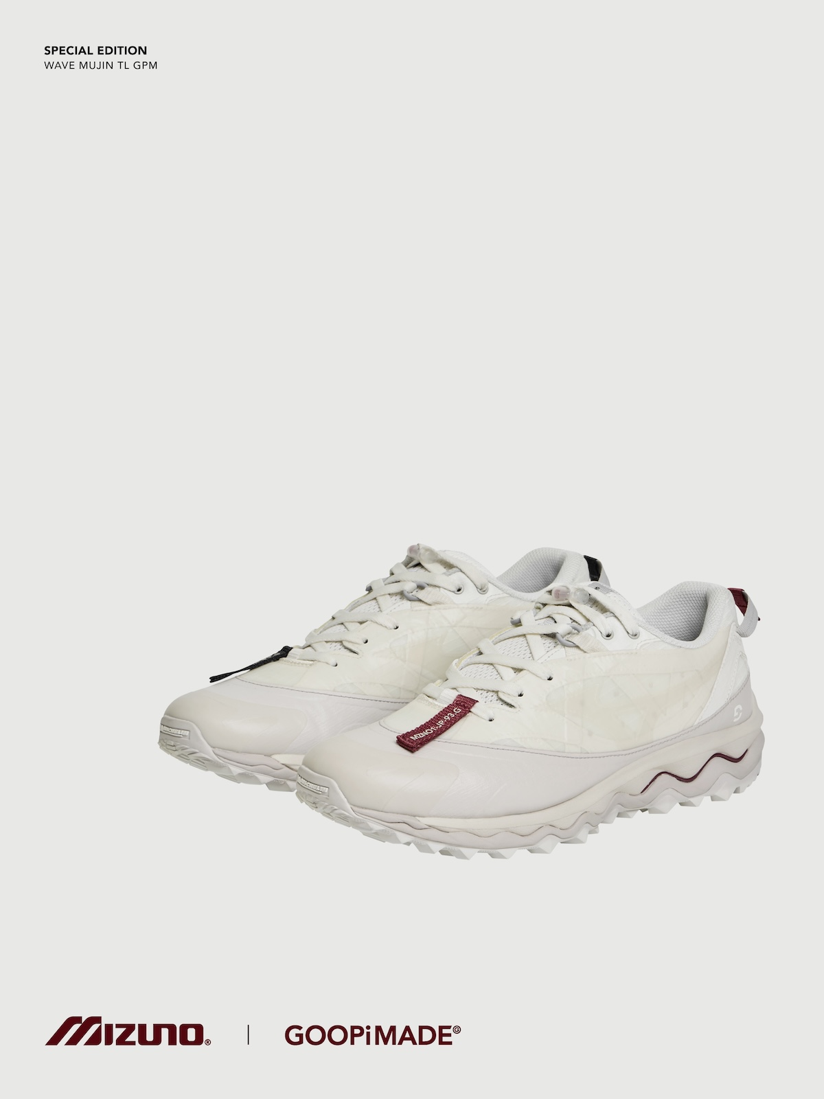 本アイテムは、トレイルランニングシューズのアーカイブデザインをもとに「ミズノ」が設計した“ウエーブ ムジン(WAVE MUJIN) TL”をベースに、「グーピーメイド」が掲げる“Build To Stand Upon The Hill – 山頂に立つための装備”をテーマにデザイン。都市生活とアウトドアをシームレスにつなぐ “All-Terrain (全天候・全環境)”を意識した一足だ。アッパーには、「グーピーメイド」の象徴的ディテールである “非対称構造” や “調整システム”を落とし込み、ホワイト PU とメッシュを採用。ミッドソールには、ミズノ独自の基幹機能である “ミズノウエーブ” テクノロジーを搭載し、クッション性と安定性を両立した。またアウトソールには、フランスの自動車タイヤブランド、ミシュランのラバーソールを採用した。