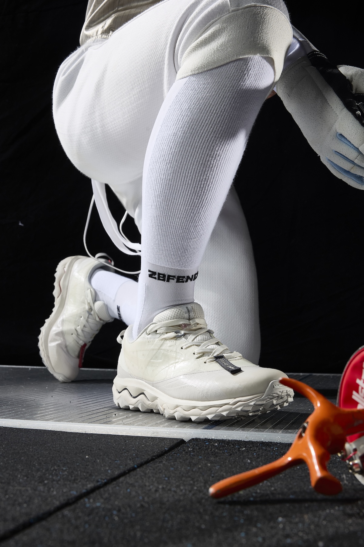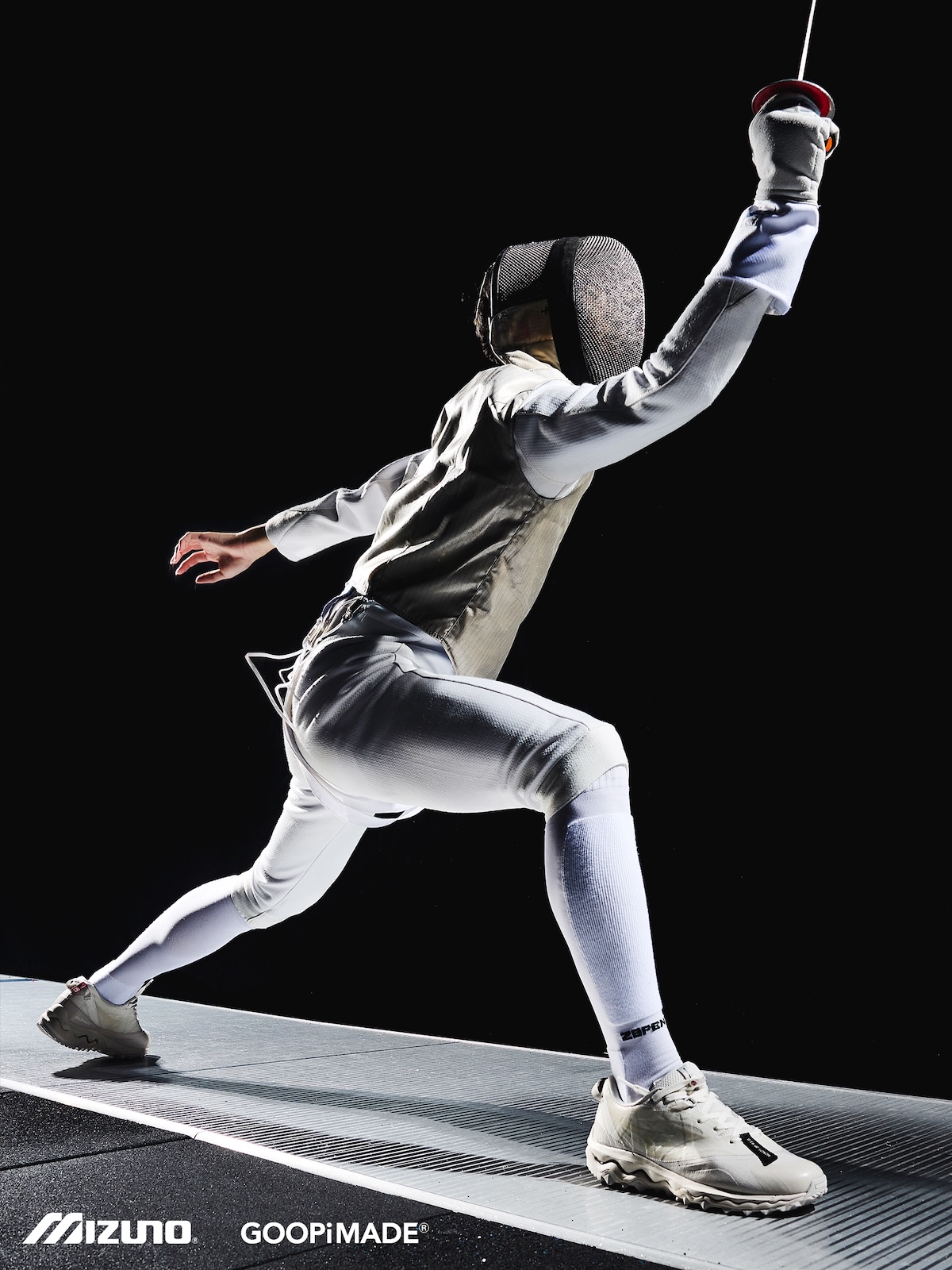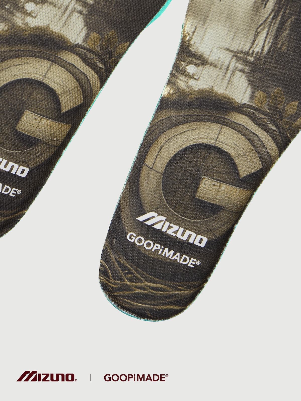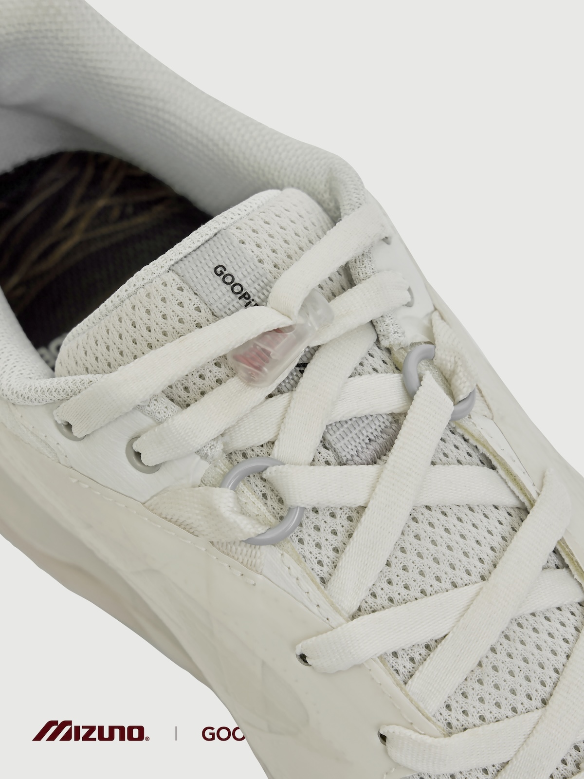 本アイテムは、トレイルランニングシューズのアーカイブデザインをもとに「ミズノ」が設計した“ウエーブ ムジン(WAVE MUJIN) TL”をベースに、「グーピーメイド」が掲げる“Build To Stand Upon The Hill – 山頂に立つための装備”をテーマにデザイン。都市生活とアウトドアをシームレスにつなぐ “All-Terrain (全天候・全環境)”を意識した一足だ。アッパーには、「グーピーメイド」の象徴的ディテールである “非対称構造” や “調整システム”を落とし込み、ホワイト PU とメッシュを採用。ミッドソールには、ミズノ独自の基幹機能である “ミズノウエーブ” テクノロジーを搭載し、クッション性と安定性を両立した。またアウトソールには、フランスの自動車タイヤブランド、ミシュランのラバーソールを採用した。