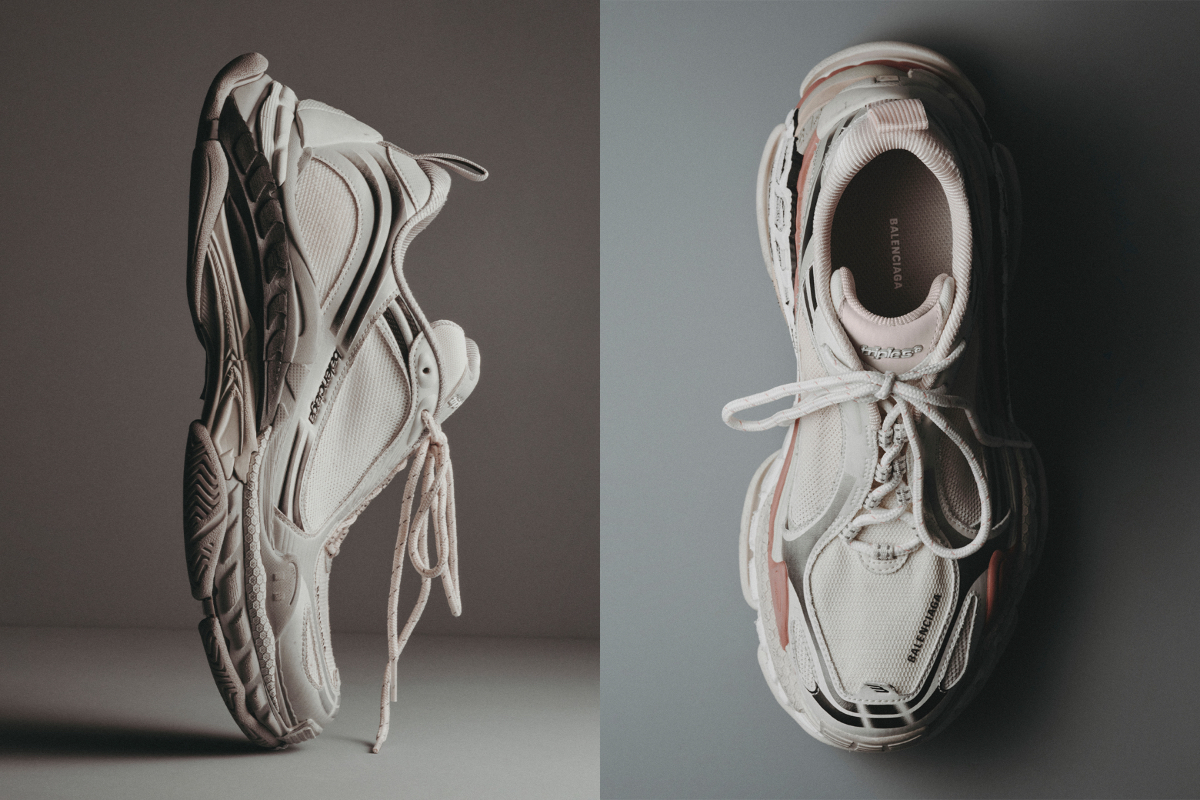 新たに登場する“トリプル S.2 スニーカー”は、時代に合わせ、オリジナルよりも細長く流線的なシルエットへとアップデートした。1足あたり68ものパーツで構成され、メッシュ素材の面積を増やすことで軽量化と通気性を高め、快適な履き心地を追求。3層のソールを彫刻的に統合し、ディストレス加工を全体に施すことで、荒々しさと洗練を同居させた。