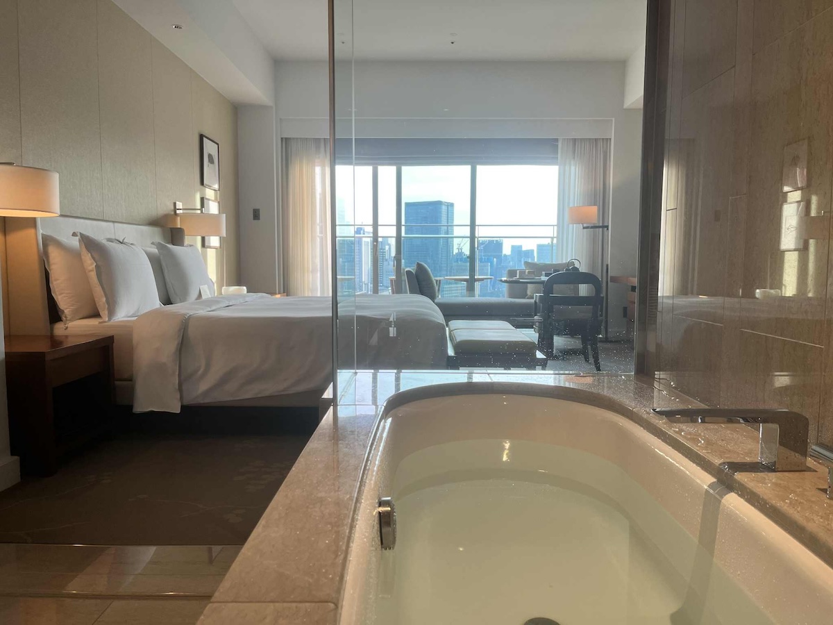 客室のデザインはそれぞれだが、眺望がすばらしい点では共通。そして私が滞在したデラックスキングwithバルコニーは、ベッドやリビング越しに入浴中も東京の街を見通せるというユニークなデザインだった。バスタブにつかりながら眺める、暮れゆく街はなんとも幻想的。もちろんスクリーンで目隠しし、扉を閉めて洗面スペースを仕切ることはできるのだが、ここはぜひ、非日常的な開放感を味わってほしい。