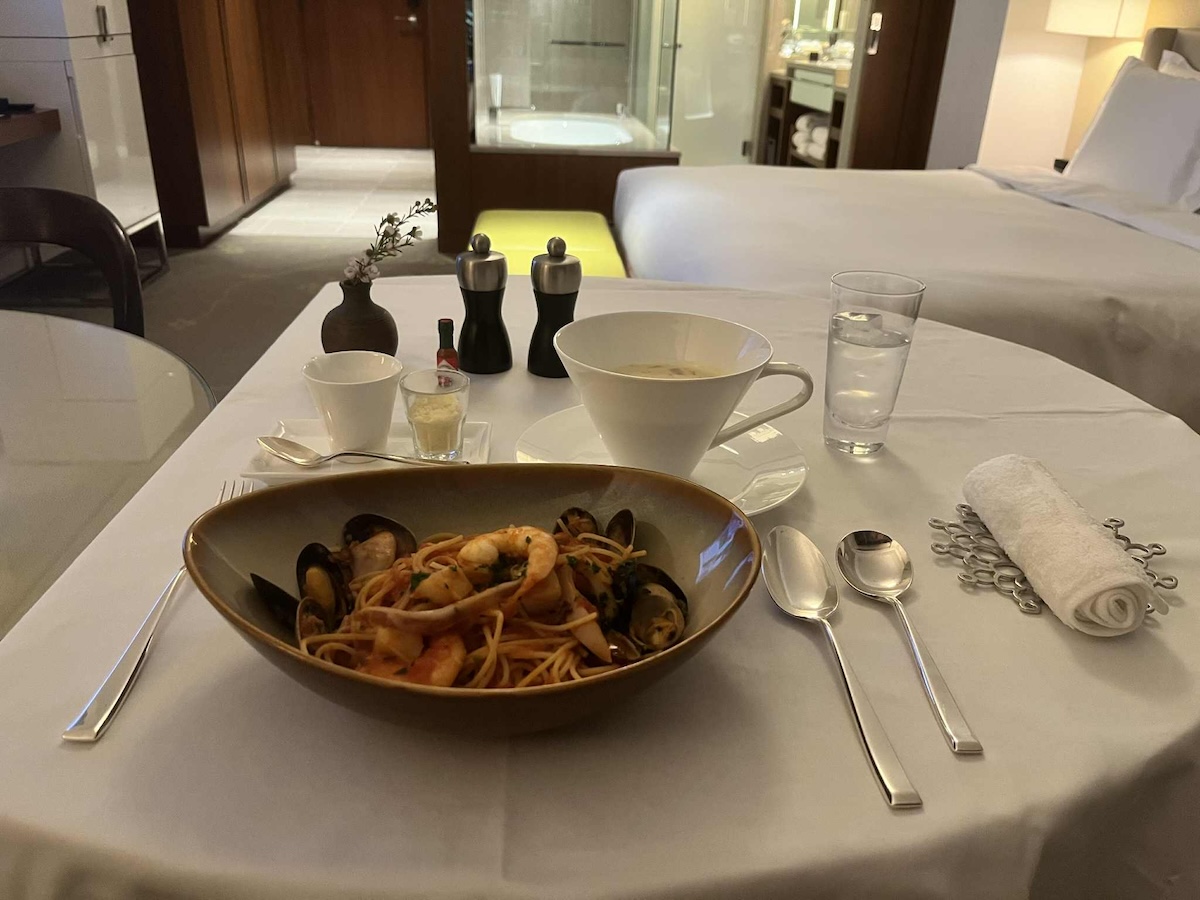 食事もインルームダイニングを試すことに。いわゆるルームサービスと一体何が違うの?と思っていたのだが、全く別物だった。「出前」の感覚のルームサービスと違い、インルームダイニングでは、テーブルクロスがしかれ、グランメゾンさながらの給仕。ネーミング通り、部屋がそのままレストランに変身したような感覚に。それなのに、お造りとシュウマイを前菜に、メーンはパスタと鍋焼きうどん、などさまざまな料理を組み合わせられるメリットも。少しずつシェアするのも楽しそうだ。客室内だからこその自由さがある。部屋で推し会なんて。なんとも優雅な企画も可能だ。