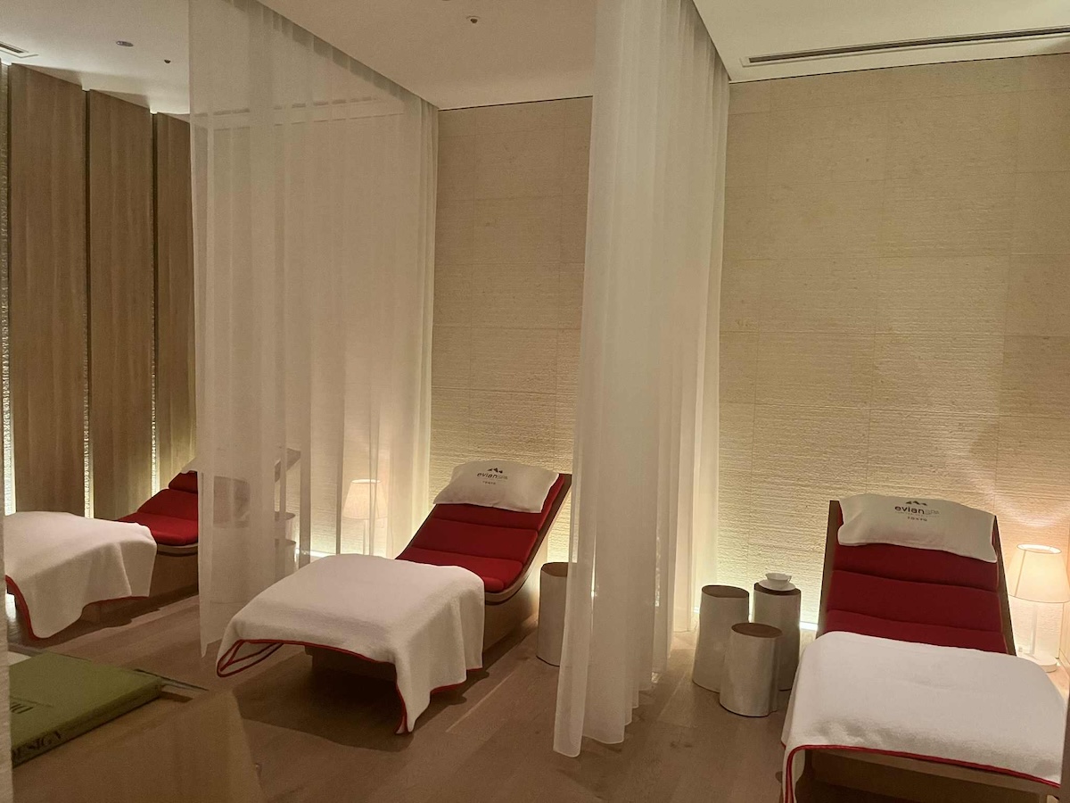 施術をより効果的にするために、アポの時間よりかなり早めにエビアン スパの温浴施設へ。ジムやプールも併設した総合的なフィットネス施設だが、このお風呂とリラクゼーションルームは芯からほぐれるようで、ゆったり過ごしたくなる。トリートメントは質のいい眠りを導入することが目的だけに、さするような優しいマッサージ。いつもはギュギュギュッ、グイグイと力任せな強めの施術が好みなのだが、今回はソフトタッチが心地よく、施術中に深い眠りに落ちてしまいそうだった。