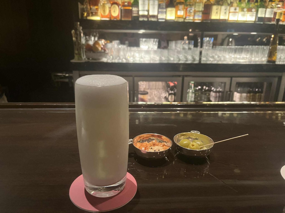 このまますとんとベッドに入るのが一番だとは理解しつつも、好奇心にはあらがえなかった…! 伝説のマティーニを味わいに、メインバー「ロイヤル バー」へ。初代チーフバーテンダー今井清氏が設計した当時のカウンターが残る、旧「パレスホテル」の歴史を象徴するバー。ジンやグラスを提供する直前まで冷蔵庫で冷やすスタイルもこのバーから始まったとか。こんなキリッとしたカクテルを飲んだら意識もしゃっきりしてしまいそうだが、隠れ家に迷い込んだようなおこもり空間が心地よく、ちょうどいいナイトキャップになった。そして知る人ぞ知る名カクテル、ミルクを使った「パレス ジンフィズ」にもトライ。こちら、昼間からちょっとお酒をあおりたい当時の進駐軍の将校が、明るいうちからこっそり飲みたい、とアルコールと気づかれぬよう、ミルクをたっぷり入れたという逸話が。オトナのカルピスソーダといった爽やかさで、さらりと飲めるのだ。これはクセになる。