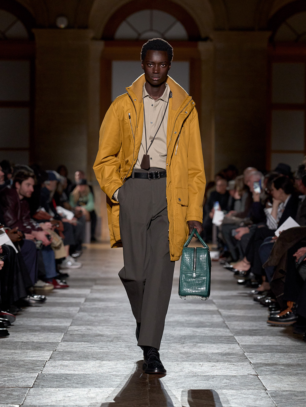 ランウエイに登場したのは、上質なレザーを用いたクリーンなシルエットのコートやパンツを筆頭に、シアリングのフライトジャケット、鮮やかな差し色で彩ったテクニカルシルクのアウター、ピンストライプの端正なスーツ、グラフィカルなセーター、遊び心を感じるバッグといったアイテム。今回、ニシャニアンは過去のコレクションのパターンやデザインも取り入れたが、ノスタルジーに陥ることなく、あくまで現代男性のライフスタイルに寄り添う洗練された装いを貫いた。時代の空気感や顧客のニーズをくみ取りながら現実的なクリエイションを積み重ねてきたその姿勢は、彼女に全幅の信頼を寄せ、創造の自由を与えてきたメゾンの価値観とも共鳴。いつものようにチャーミングな笑顔でフィナーレに登場した彼女をたたえる歓声と拍手は、しばらくやむことはなかった。