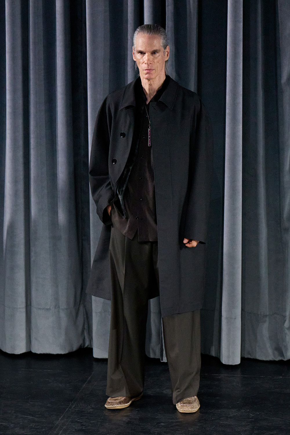 クリストフ・ルメール(Christophe Lemaire)とサラ=リン・トラン(Sarah-Linh Tran)は今季、ショーではなく「舞台」を表現の手段に選んだ。振付家ナタリー・ベアス(Nathalie Béasse)と協業し、俳優ペ・ドゥナ(Doona Bae)ら多彩な演者が踊り、たたずむ、日常の詩的な一幕を描き出した。実用美を備えたテーラリングを土台に、メンズではカーフのマンダリンジャケットなど、オリエンタルな要素をモダンに再解釈し、緊張と緩和のバランスを巧みに操る。「スタイルを作るのは服ではなく、その人のムードや立ち居振る舞い」と両人は語る。物質主義に突き進む世界へのアンチテーゼとして、単なる消費物ではなく、人生の機微に寄り添い、内面からにじみ出る個性を支える服のあり方を探った。