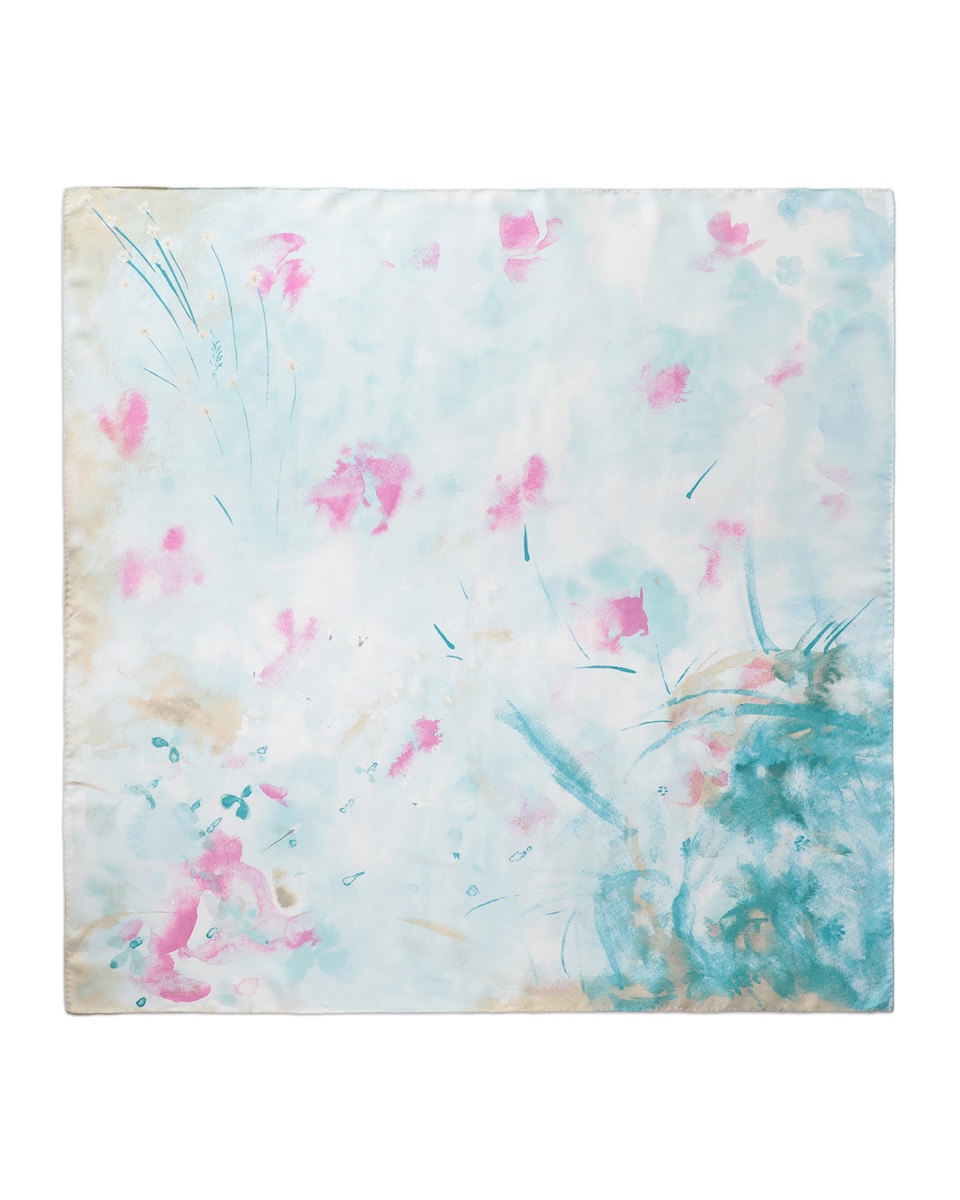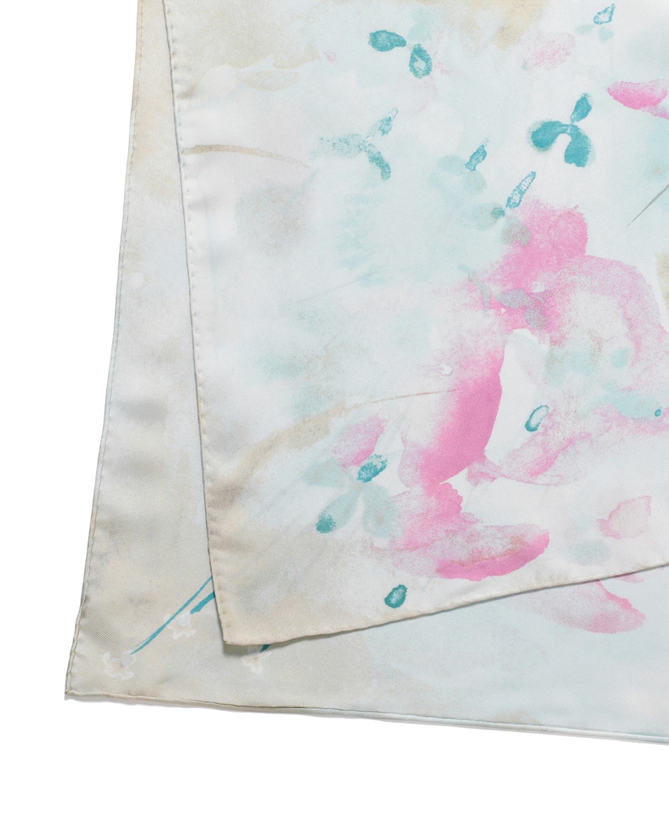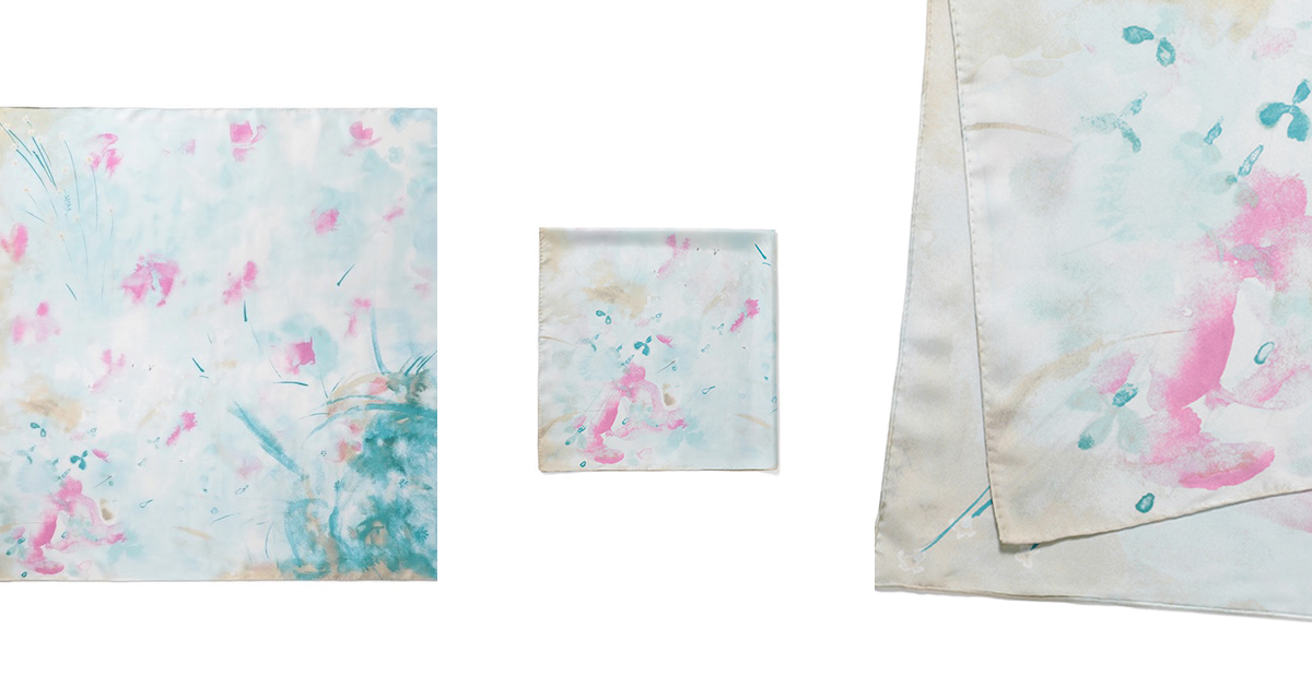 スカーフは、黒河内真衣子の幼少期の記憶を起点にしたコレクションのテーマを反映し、ガラス越しに見える朝焼けや夕焼けの中で植物が透けて浮かび上がる情景に着想する。配色による表現に初挑戦した今回は過去最多となる全9色(9版)を使用し、職人の高度な染色技術を用いて繊細で美しい風合いを実現した。