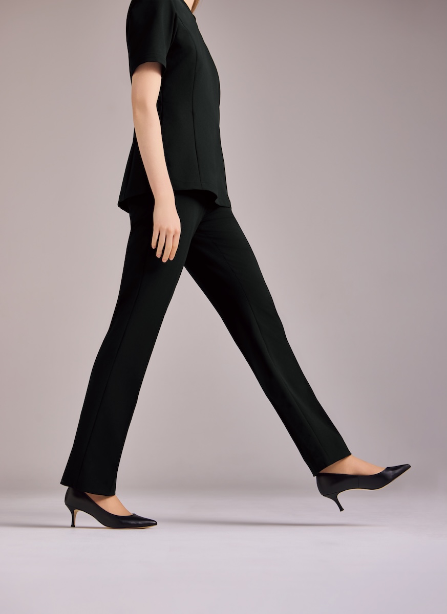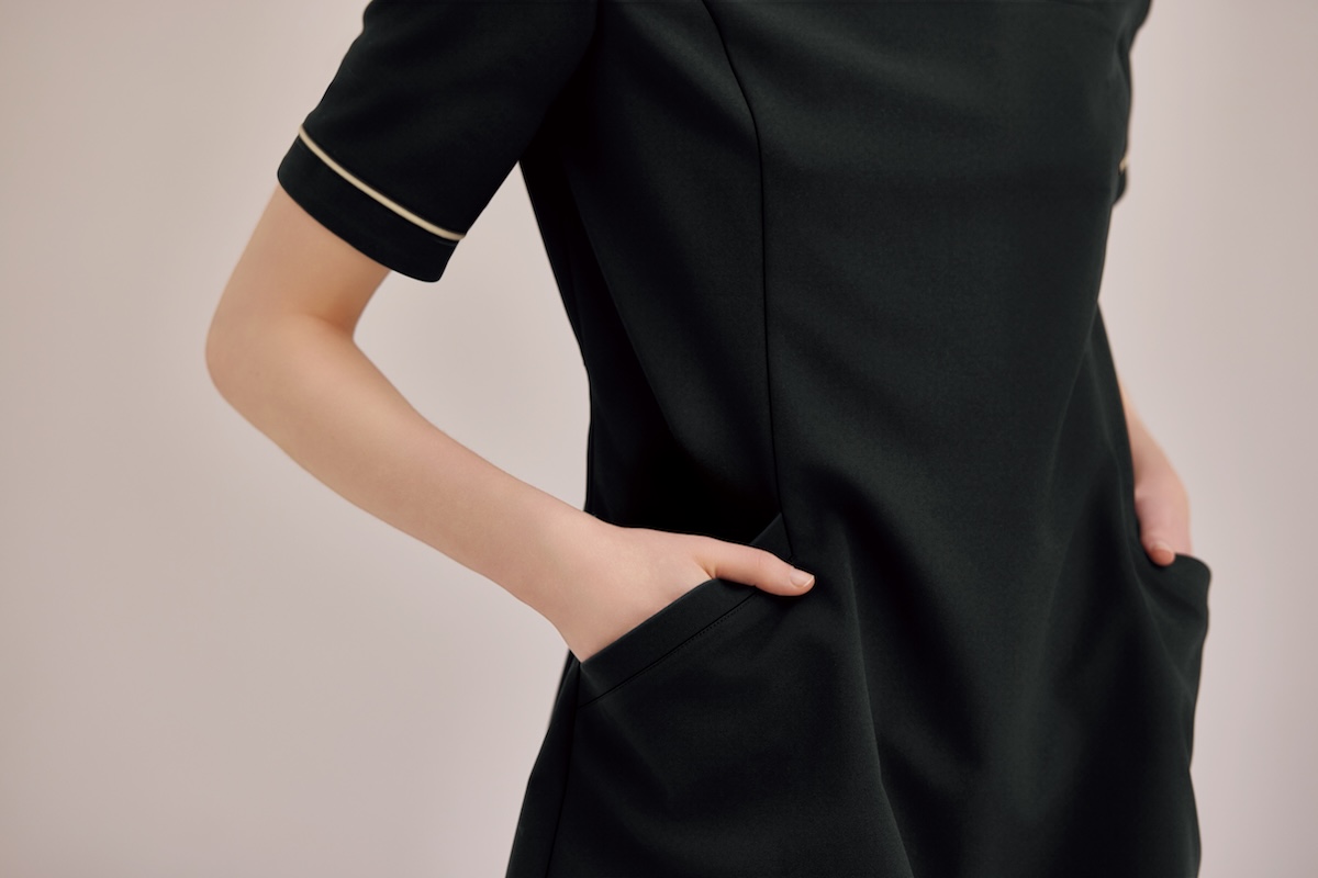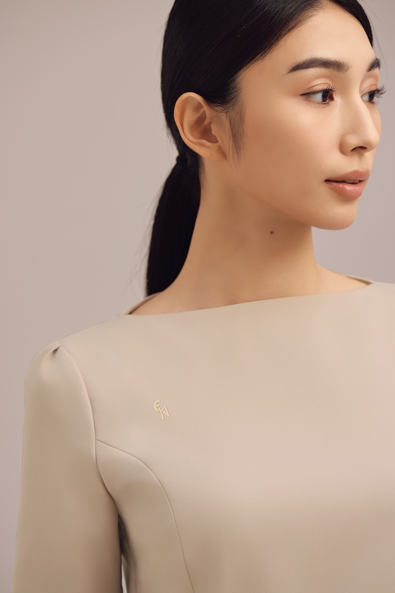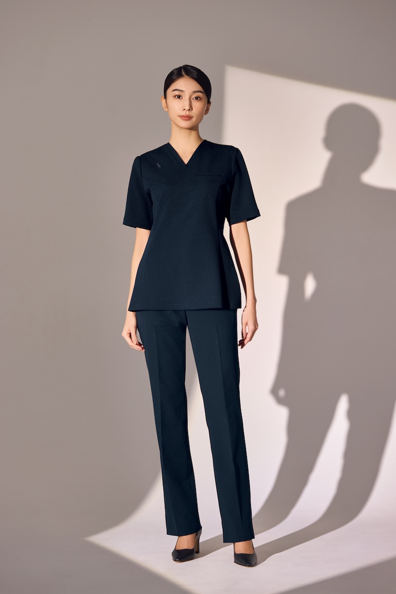 本ユニホームは、おもてなしの基本である“お辞儀”の際、胸元が気にならない安心感とデコルテが美しく見えるVラインをミリ単位で両立させた。また、業務内容に最適化した“キャラクター設定”に着目した。受付のユニホームには、座り仕事でもお腹を圧迫せず、座った姿でも華やかなデザインに仕上げた。事務・カウンセラー向けのユニホームには、院内を回遊する動きを考慮し、直線的なラインと直線的なポケットを配置した。