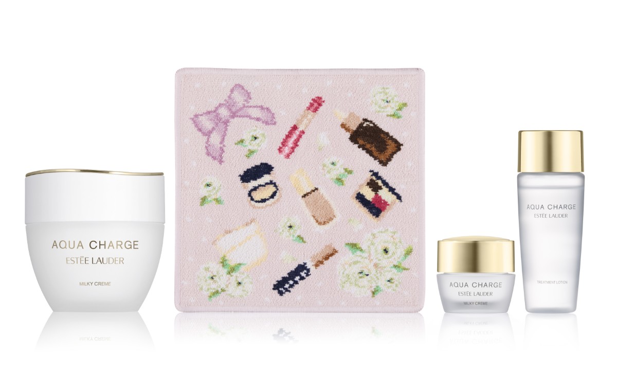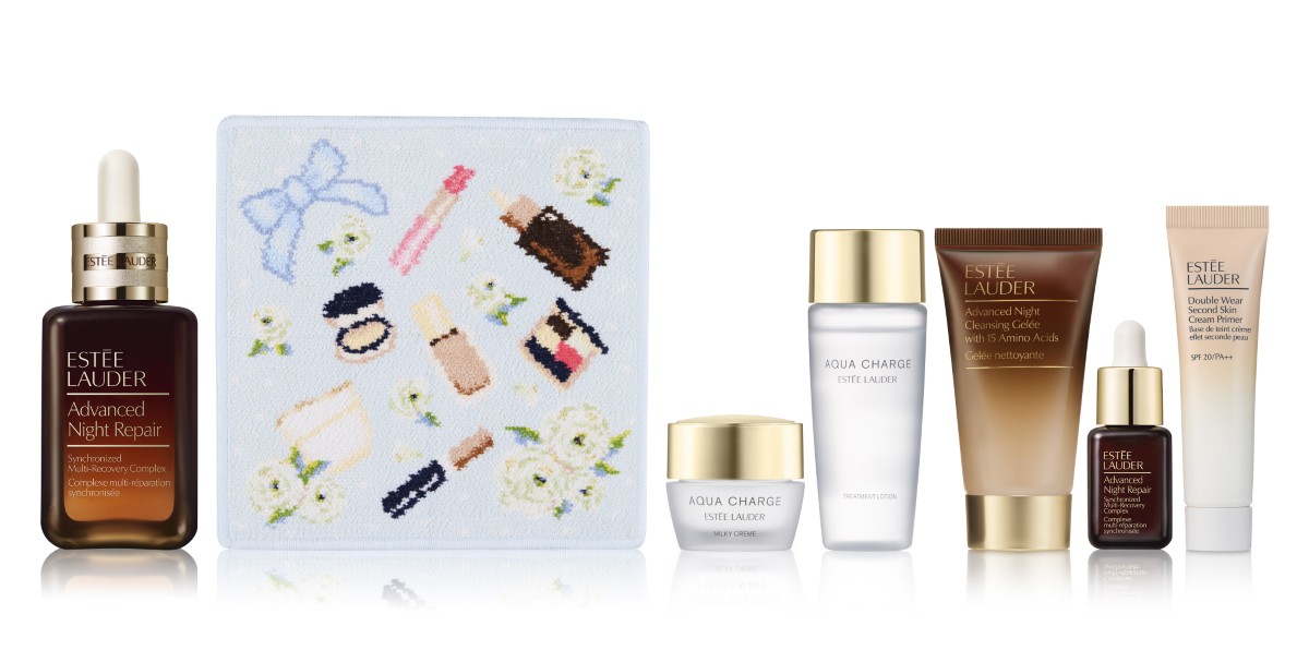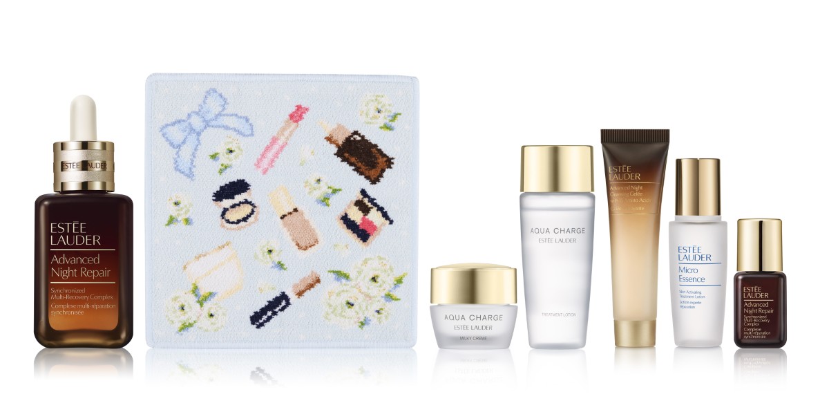 今回は、「エスティ ローダー」を代表するベストセラーアイテムをモチーフにした限定オリジナルハンカチを主役に、人気スキンケア製品を組み合わせた2種のセットをラインアップ。日本発の医薬部外品スキンケアシリーズ“アクア チャージ”の現品を中心に構成したセットと、ベストセラー美容液“アドバンス ナイト リペア”をメインにしたセットを用意する。