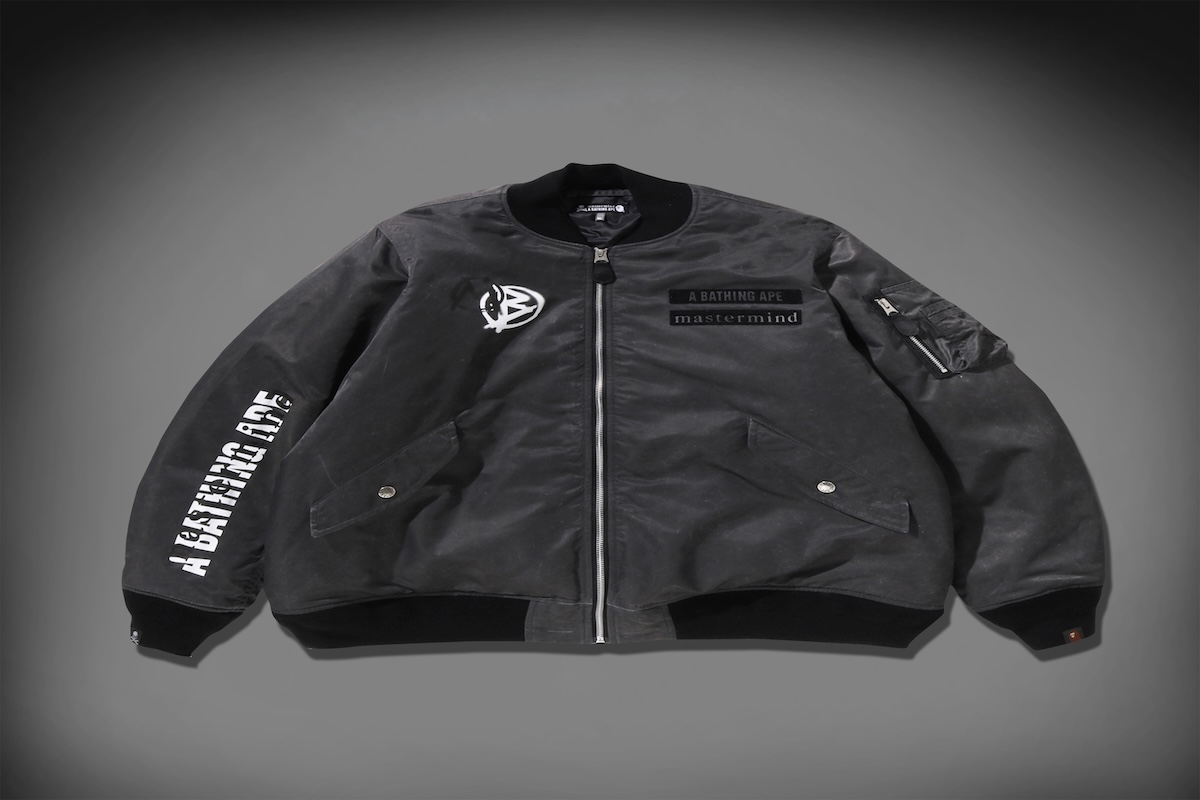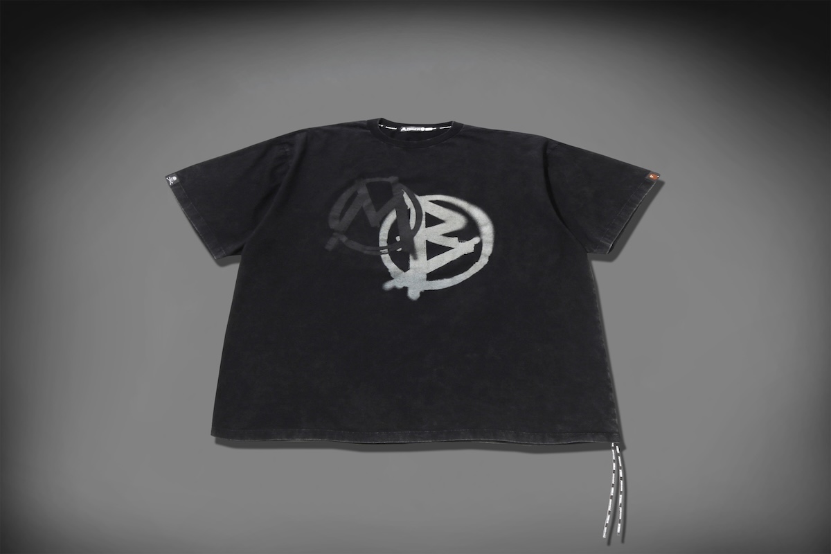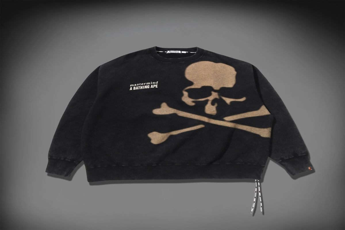 本コレクションは、“パンク”の反骨の美学に着想を得て制作し、DIY精神や反体制の姿勢をグラフィックとして再構築。アイテムは、両者のイニシャルである“M”と“B”をスプレーペイントで表現したモチーフや、ロゴを重ね合わせた新たなデザイン“mastermind BAPE®︎ LOGO”をあしらった“Tシャツ”2型(3万3000〜3万6300円)、“ボンバージャケット”(10万4500円)、“カーゴパンツ”(6万500円)をラインアップするほか、フロントにクロスボーンスカル、バックに“エイプ ヘッド”をブリーチ加工で表現した“クルーネックスエット”(5万2800円)や、アッパーに牛革を使用し、上品に仕上げた “ベイプ スタ”(5万5000円)も用意する。