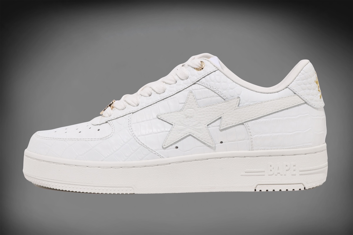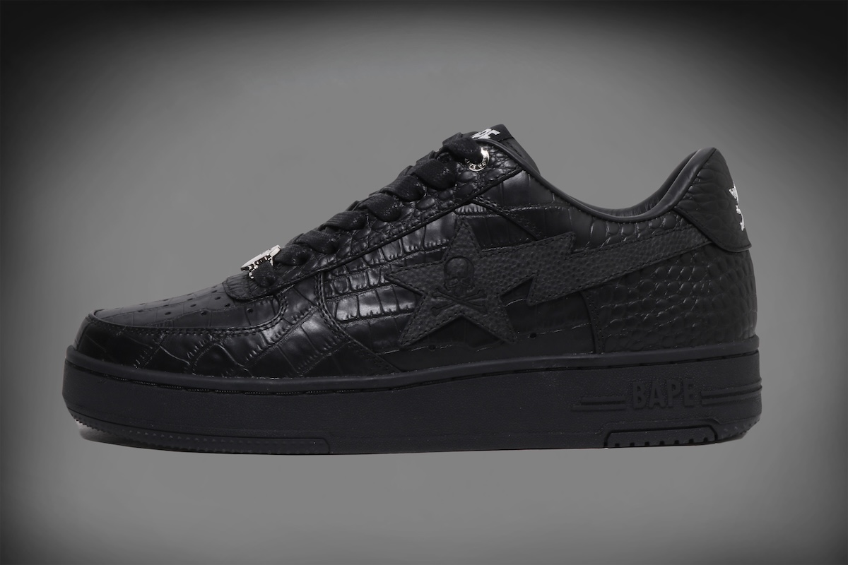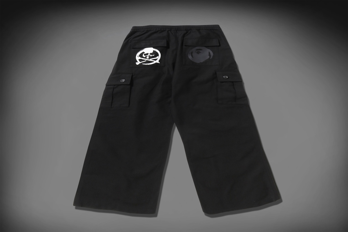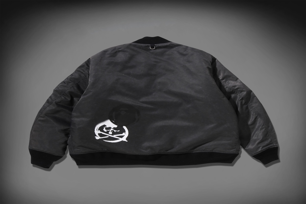 本コレクションは、“パンク”の反骨の美学に着想を得て制作し、DIY精神や反体制の姿勢をグラフィックとして再構築。アイテムは、両者のイニシャルである“M”と“B”をスプレーペイントで表現したモチーフや、ロゴを重ね合わせた新たなデザイン“mastermind BAPE®︎ LOGO”をあしらった“Tシャツ”2型(3万3000〜3万6300円)、“ボンバージャケット”(10万4500円)、“カーゴパンツ”(6万500円)をラインアップするほか、フロントにクロスボーンスカル、バックに“エイプ ヘッド”をブリーチ加工で表現した“クルーネックスエット”(5万2800円)や、アッパーに牛革を使用し、上品に仕上げた “ベイプ スタ”(5万5000円)も用意する。