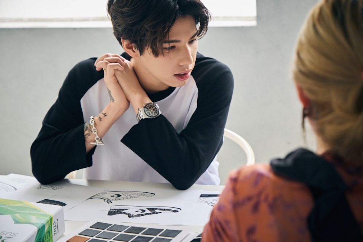 今回コラボするスニーカーのベースは、「コンバース」の代表モデルである“シェブロン&スター”ロゴをサイドに配したコートタイプのスニーカー“NX360”だ。2モデル展開し、サイズ展開は、22.5〜29.0cm。生地や素材、カラーリングなど打ち合わせを重ね、Hiroのこだわりや感性が込められている。