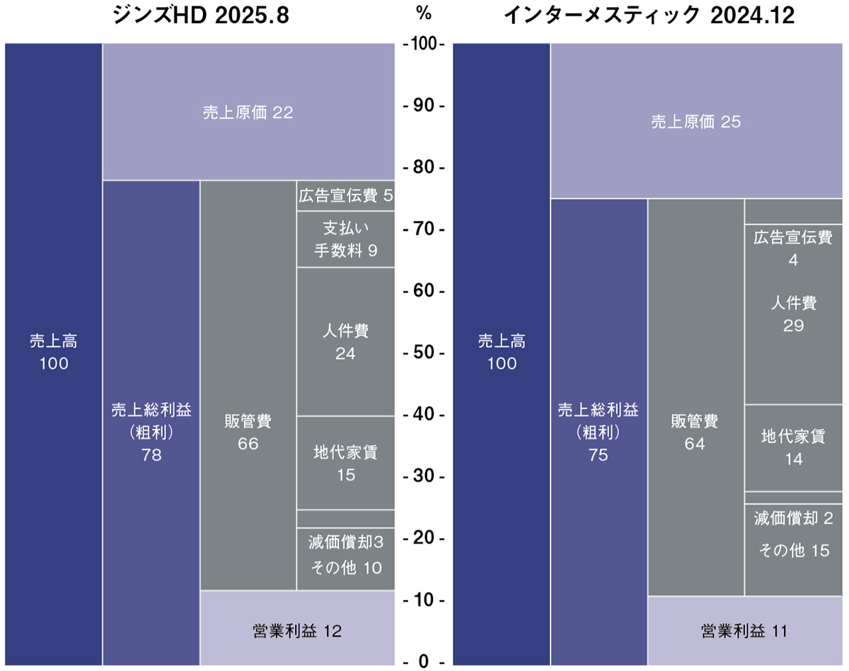 ジンズの2025年8月期の売上高は前期比17.1%増の972億円で、営業利益が同54.3%増の120億円、インターメスティックの24年12月期の売上高は同12.5%増の448億円、営業利益が同43.3%増の50億円と、共に2ケタの増収増益、営業利益率も10%を超えています。