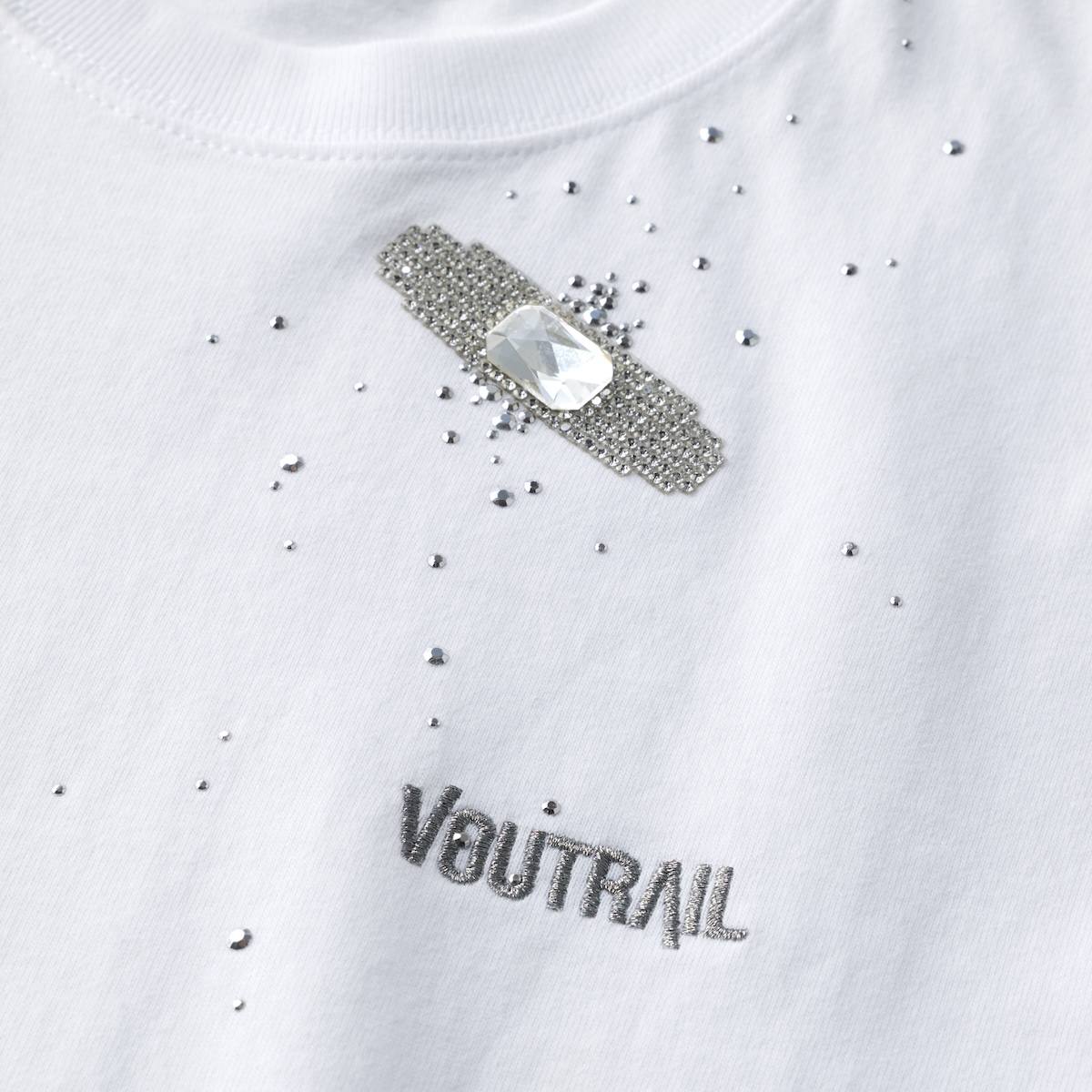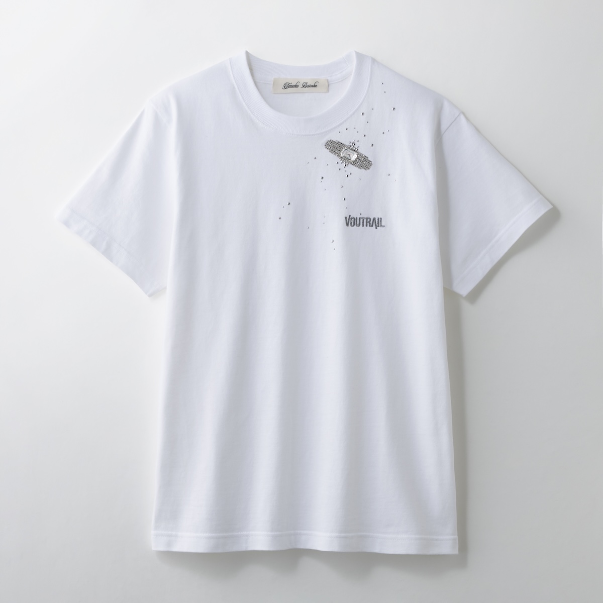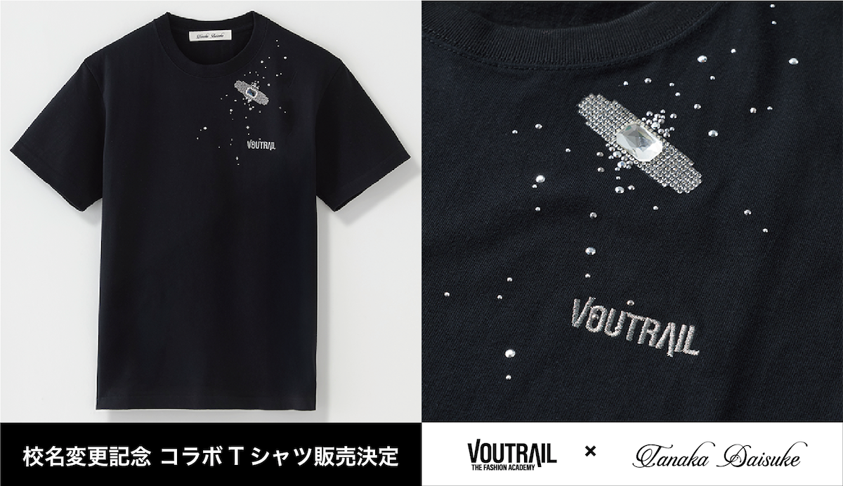 本アイテムは、「タナカダイスケ」で人気のビジューエイド(Bijou Aid )Tシャツをベースにした特別仕様で、細かなラインストーンやビジューで絆創膏のモチーフを表現し、さらにメタルパーツを散りばめた同アイテムの世界観を生かしながら、新校名「VOUTRAIL」のロゴを刺しゅうで施した限定デザインに仕上げた。