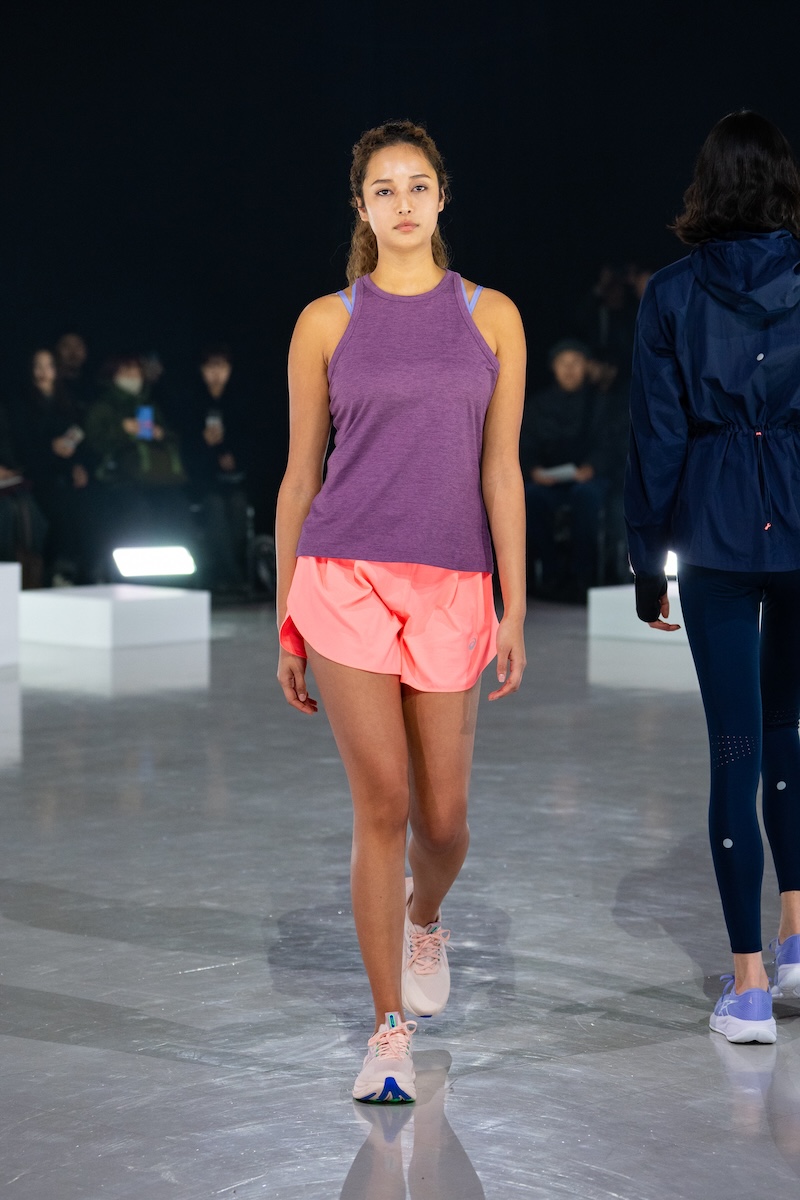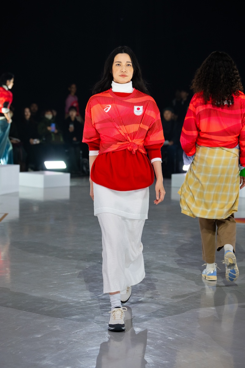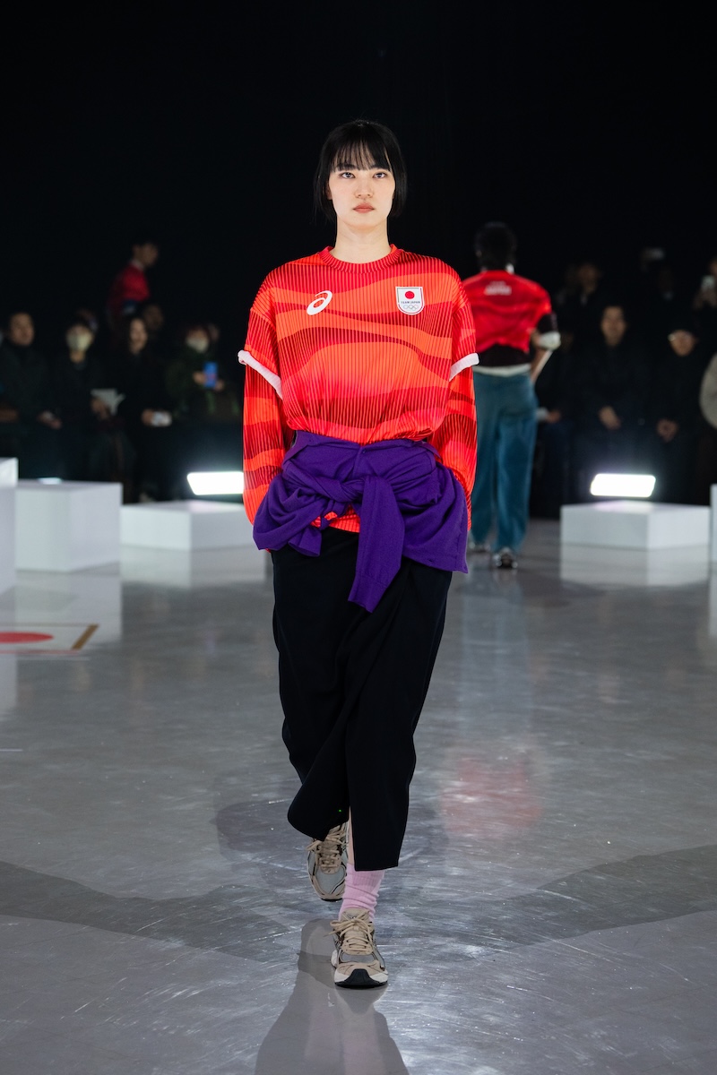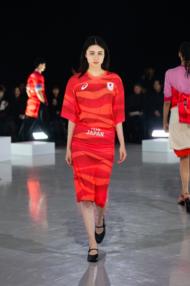 ショーは、アシックスジャパンの創業理念である「Sound Mind, Sound Body」をベースに、アスリートの日常から大舞台までを5つのシーンで構成した。2026年春夏シーズンのインラインアパレルやランニングウエアを用い、日々努力を積み重ねてきた時間を表現したり、「アシックス」が冬季五輪では8年ぶりに手掛けた“チームジャパン レッド”と“サンライズレッド”のグラデーションを基調にした公式ウエアのアスリートルックを披露したり、代表に選ばれた選手の大会までの日常を描写した。