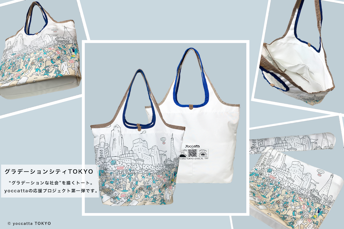 第1弾では、絵本作家の中垣ゆたかと協業。障害者と健常者の垣根をなくす「グラデーションな社会」をテーマにしたイラストをプリントしたトートバッグを制作した。売り上げの一部は、中垣氏との出会いのきっかけとなった「脳卒中フェスティバル」の実行委員会に寄付する。