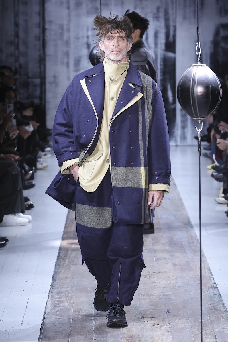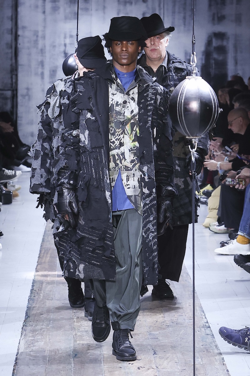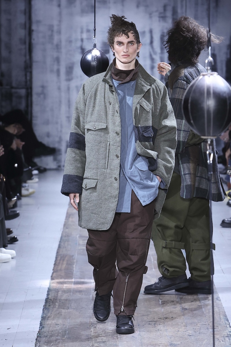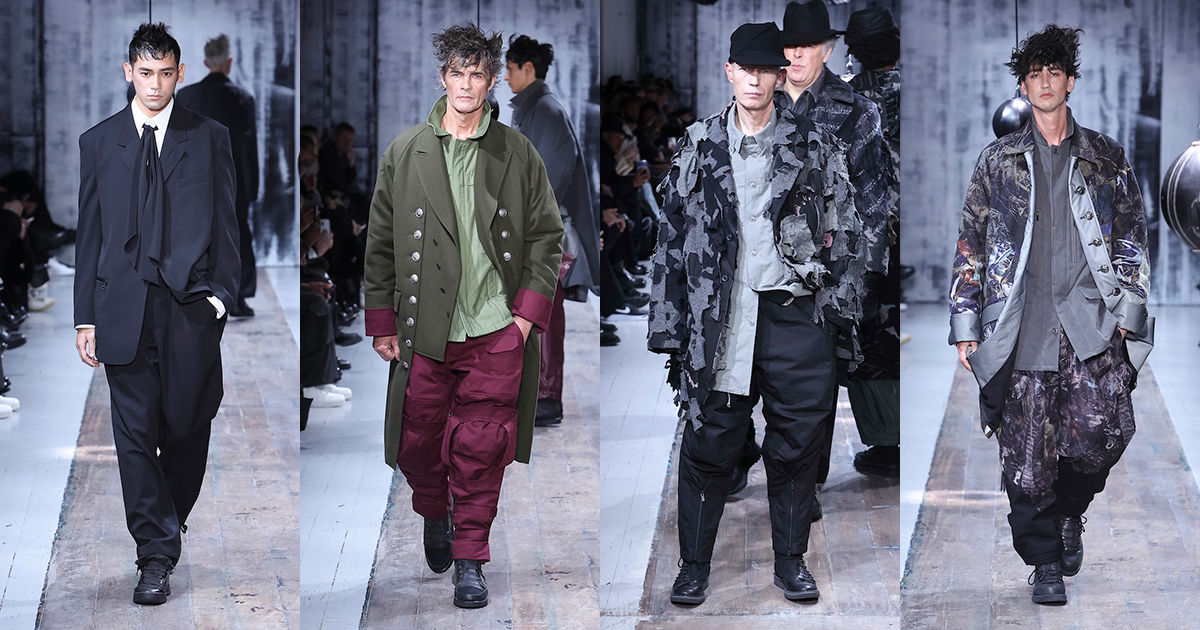 「ヨウジヤマモト(YOHJI YAMAMOTO)」 の2026-27年秋冬メンズ・コレクションは、この複雑な現代社会で闘う男性たちを静かに鼓舞する応援歌のようだった。山本耀司デザイナーは今季、ミリタリーと土や泥にまみれる仕事から着想。“プロテクティブ(保護的)”な服の役割に目を向け、体と心を守る服のあり方を探求した。