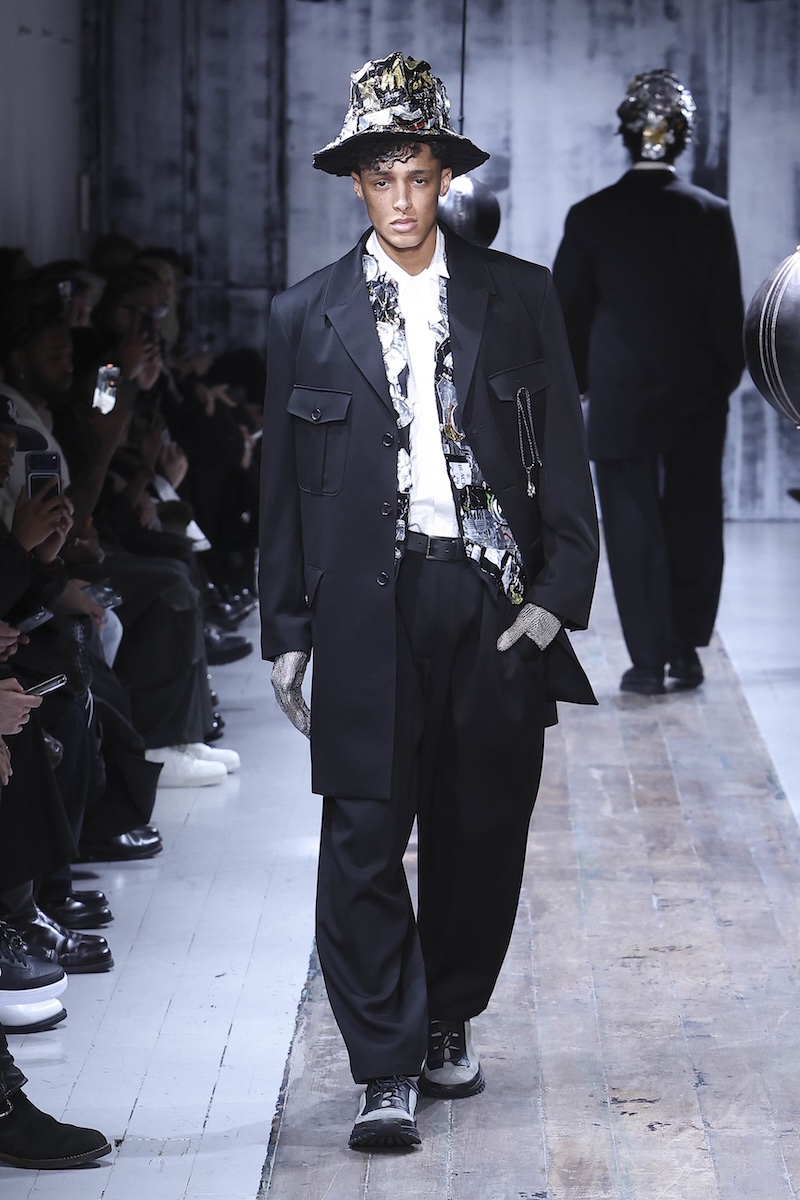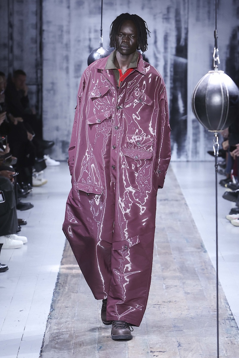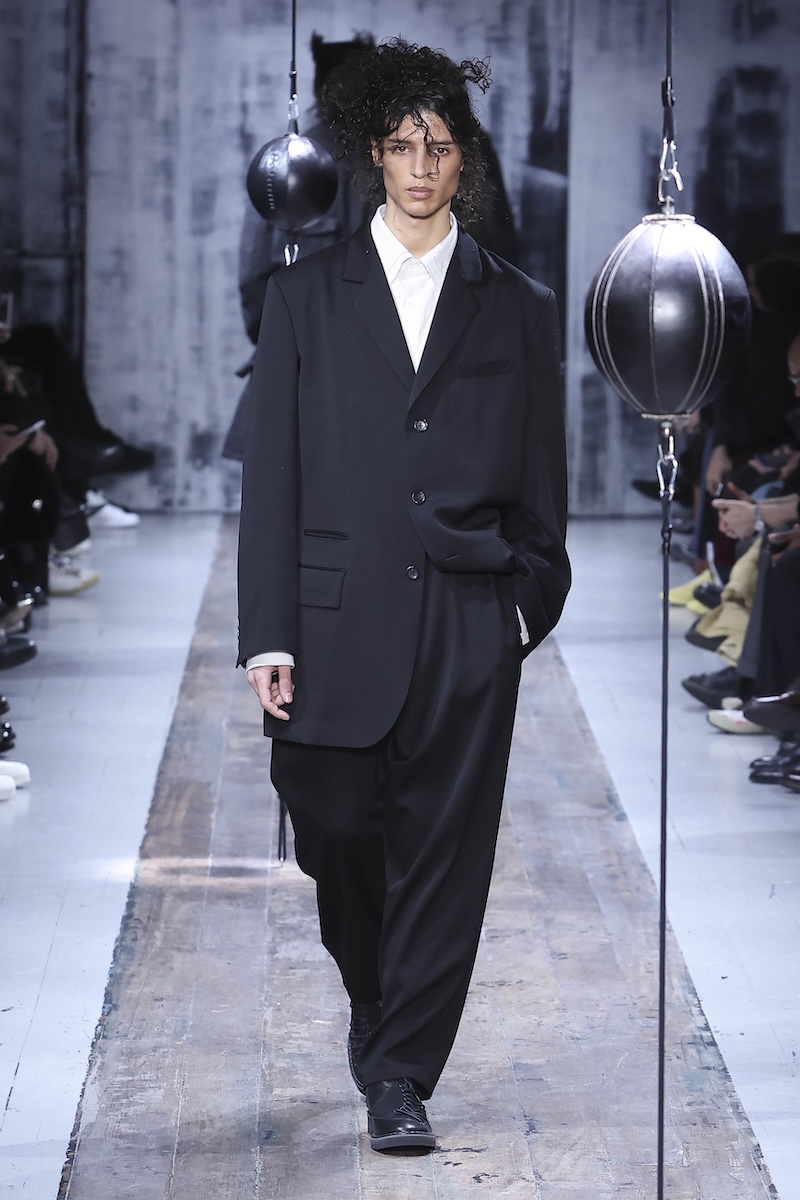 ショーは中島みゆきの「ファイト」のカバーで幕を開け、モデルたちはゆっくりと歩きながら、ランウエイの中間に設置された2つのパンチングボールに向き合う。それを拳や手の平で叩いたり、そっと撫でたり。敬意を込めてお辞儀をしたり、額を当てたりする姿も見られた。