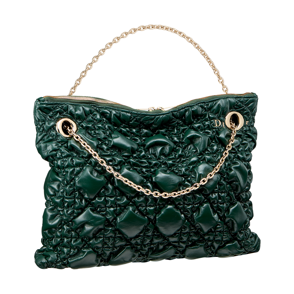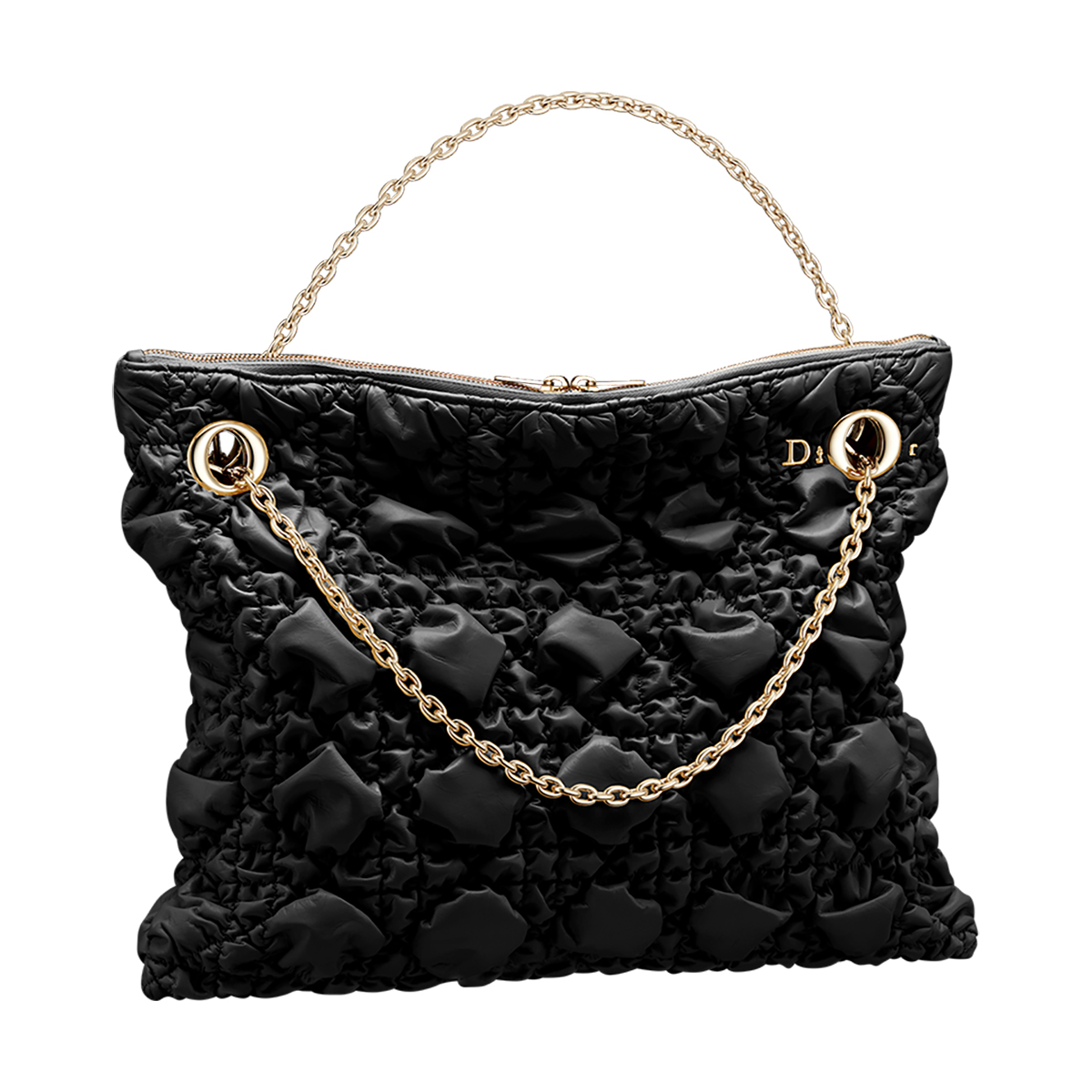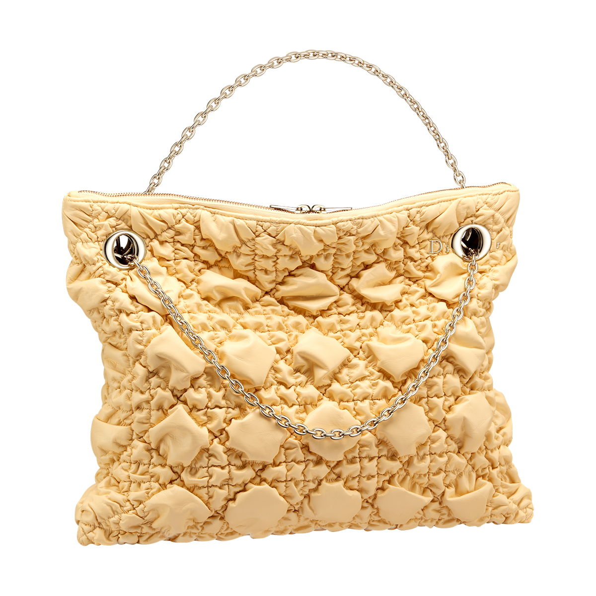 “ディオール クランチー”は繊細なしわが施された質感のレザーを使用し、高密度なテクスチャーとしなやかさのコントラストが立体感や質感を際立たせる。スモール、ミディアムの2つのサイズ展開で、ブラック、ベージュ、パステルイエロー、ダークグリーンの4色を用意する。2つのゴールドハンドルが手持ちや肩掛け、クロスボディーまでさまざまな持ち方を可能にし、「ディオール」のシグネチャーはチェーンストラップのアイレットに重ねて配置された。
