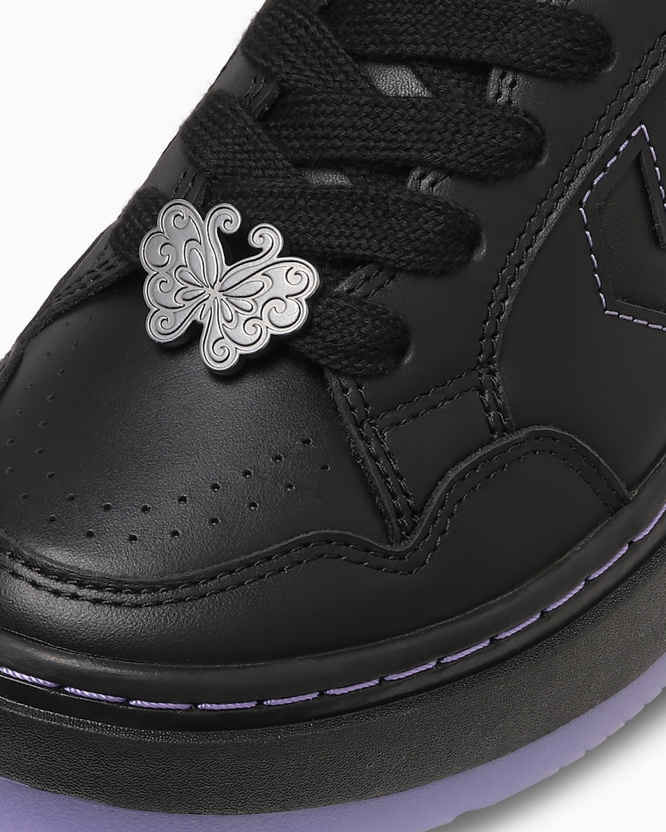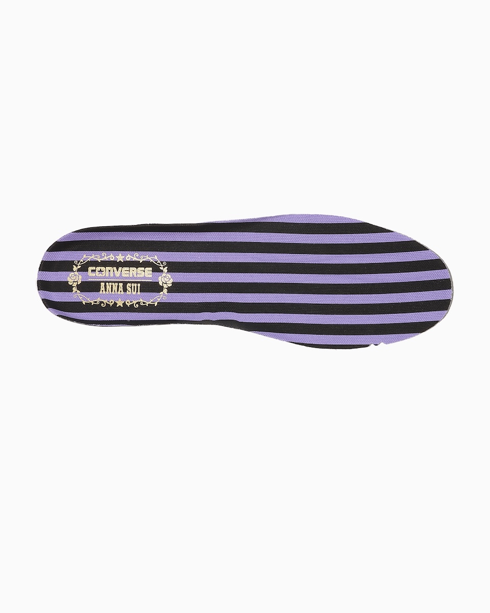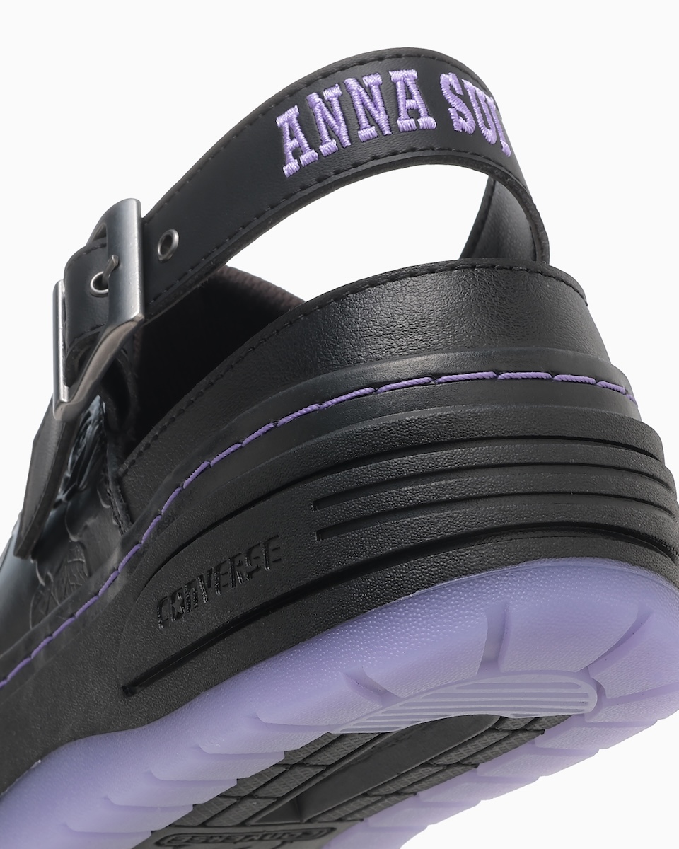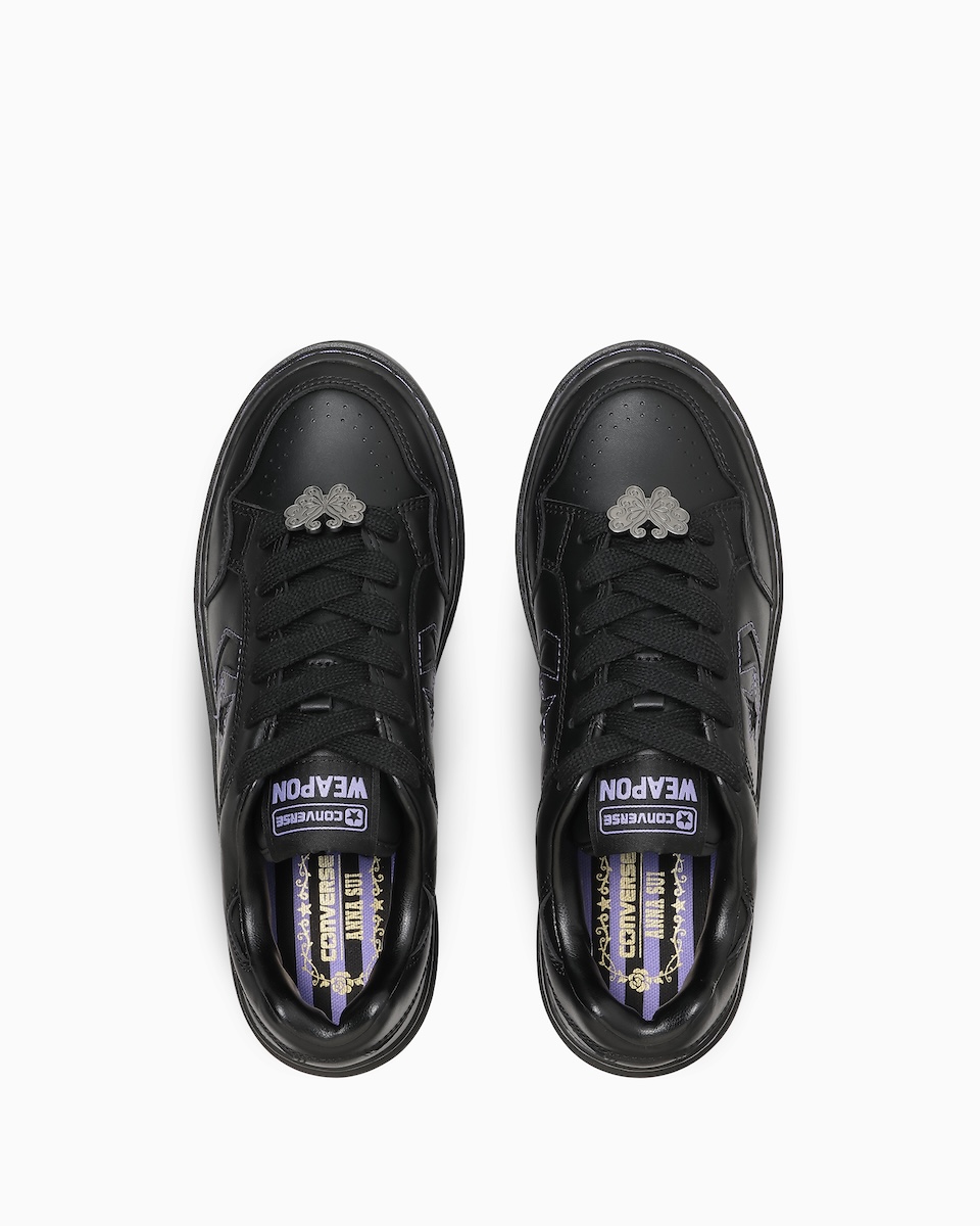 本コラボレーションでは、コンバースを代表するバスケットボールシューズ“ウエポン”をベースに「アナ スイ」の世界観をアレンジしたアイテムがそろう。“ウエポンPLTS OX”はハリのあるレザーと柔らかなシンセティック素材を組み合わせたアッパーが特徴だ。“ウエポンPLTS CLG OX”は同モデルをクロッグ仕様にアレンジする。この2つのアイテムには「アナ スイ」を象徴するブラック、パープルのカラーリングを配置し、蝶や薔薇のモチーフを取り入れた。また、インソールにはブランドカラーのストライプ柄にダブルネームプリントを施している。現代のトレンドに合わせ厚底ながら、軽量な履き心地だ。