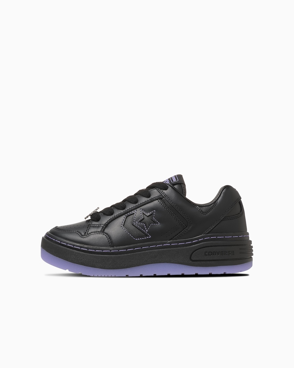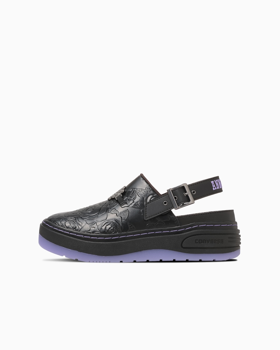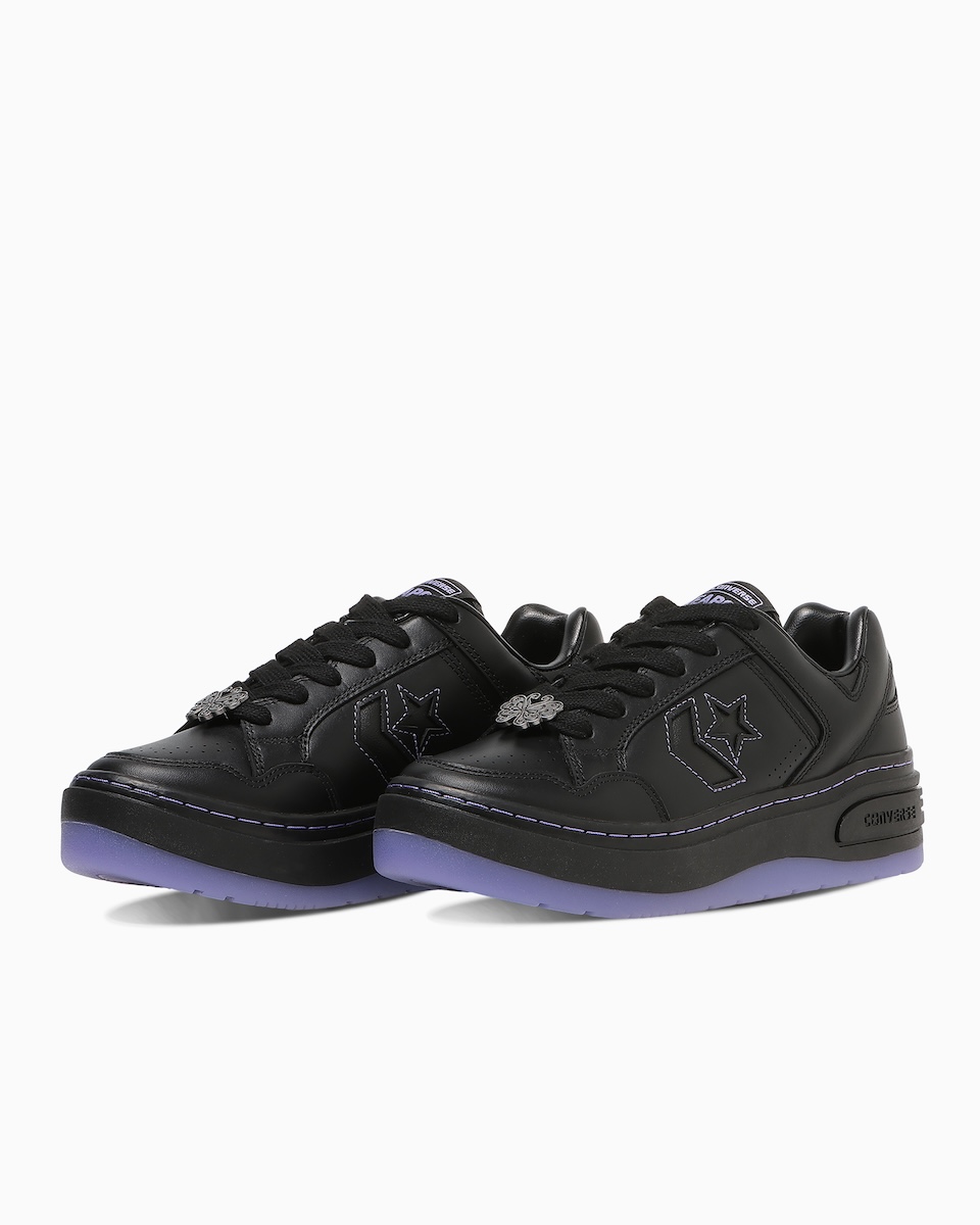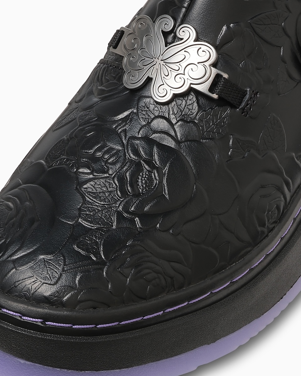 本コラボレーションでは、コンバースを代表するバスケットボールシューズ“ウエポン”をベースに「アナ スイ」の世界観をアレンジしたアイテムがそろう。“ウエポンPLTS OX”はハリのあるレザーと柔らかなシンセティック素材を組み合わせたアッパーが特徴だ。“ウエポンPLTS CLG OX”は同モデルをクロッグ仕様にアレンジする。この2つのアイテムには「アナ スイ」を象徴するブラック、パープルのカラーリングを配置し、蝶や薔薇のモチーフを取り入れた。また、インソールにはブランドカラーのストライプ柄にダブルネームプリントを施している。現代のトレンドに合わせ厚底ながら、軽量な履き心地だ。