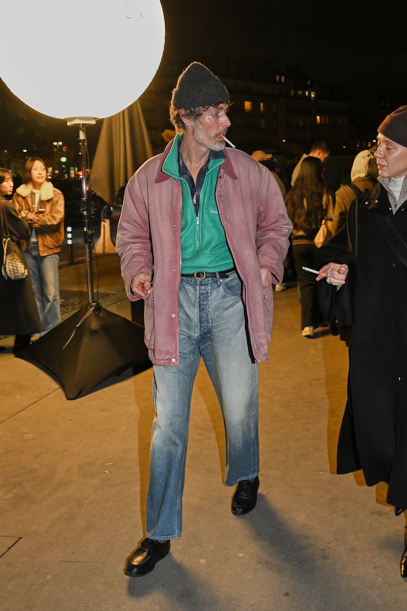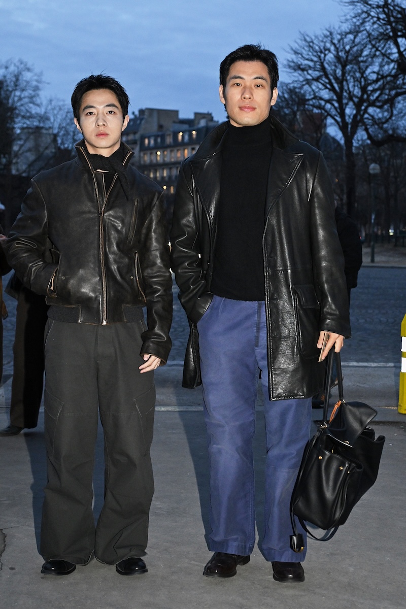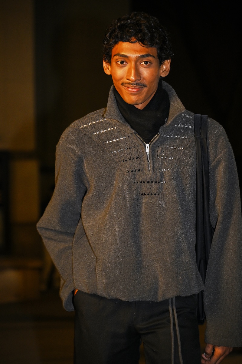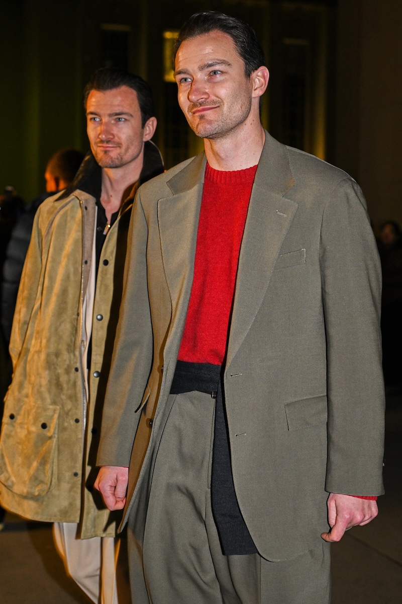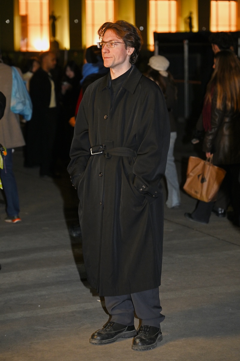 被り率が高かったのは、襟にレザーを配したブルゾンジャケットと、フリースのような表情を持ちながら実はシルク100%で作られたハーフジップセーター。ニットウエアを腰に巻いたり、マフラーを首元から無造作に垂らしたりと、絶妙な抜け感を生み出す「オーラリー」のスタイリングを踏襲する来場者も多い。時折、赤や緑といった差し色を一点だけ効かせる装いも見られるが、ランウエイで披露された最新コレクションでは、ビビッドカラーを大胆に掛け合わせたルックも提案された。抑制の効いたグレーを基調とした来場者の装いとは対照的に、来シーズンのオフランウェイでは、より強い色彩表現が広がりを見せそうだ。
