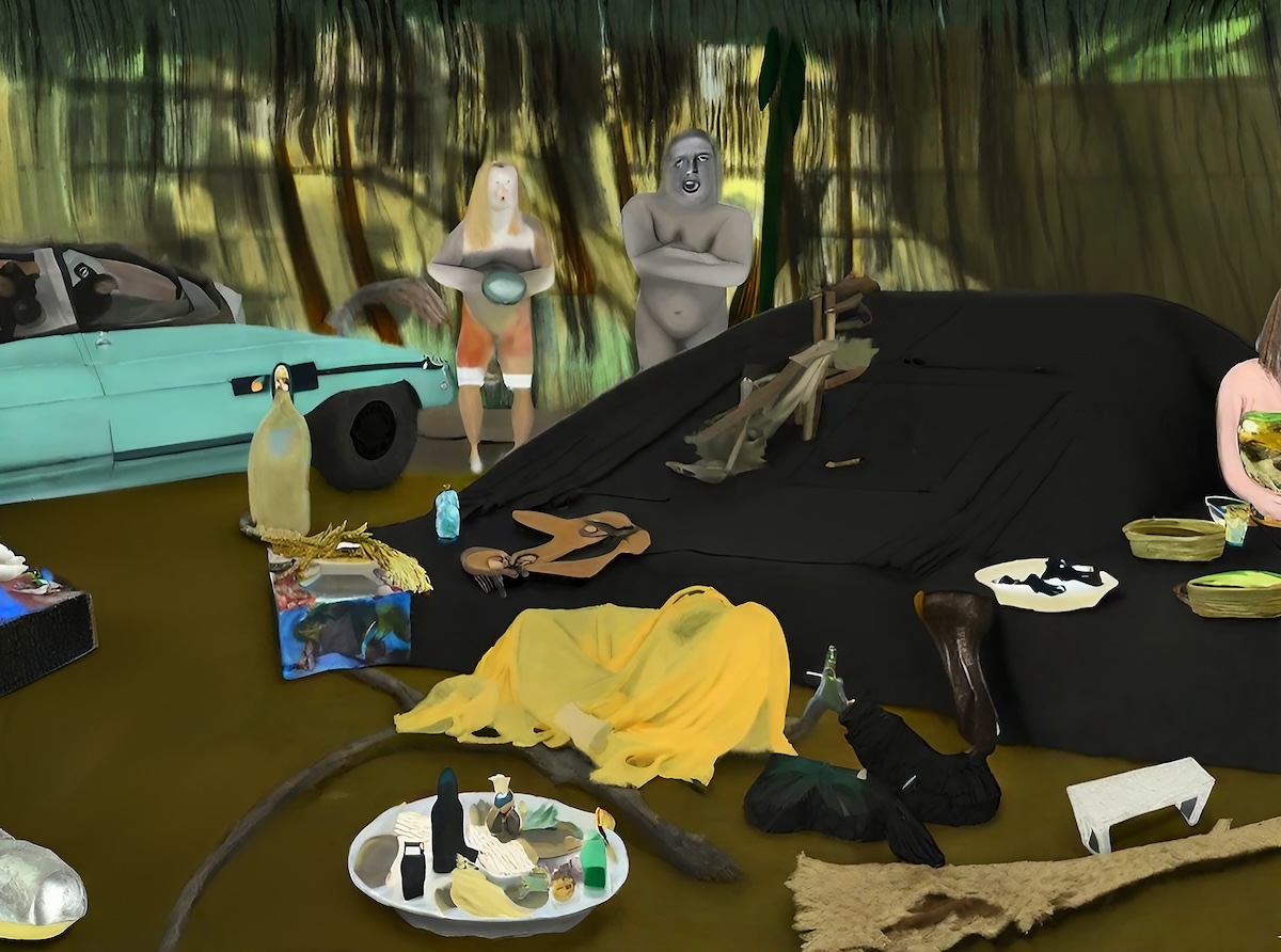 マネの「草上の昼食」をテーマにして作品を制作した時、当時のAIではテキストの指示で画像を作ることはできても、複雑なプロンプトは反映できなかったんです。例えば画像中央に据えるものを指示することはできるんですが、マネの絵画のように中央に複数の人物やオブジェクトを描いたり、複数種類の木や湖を描いたりすることは難しい。どうすればそういう複雑な情報を作品に反映できるのかを考えていました。「草上の昼食」に描かれている人物や風景についてネットで調べると、人物像やポージングの意味がテキストで残されているので、それらをプロンプトに含めてオブジェクトごとに生成してみたんです。そうすると全く違うものが出来上がるんですね。元絵の人物とは造形もポーズも異なる。