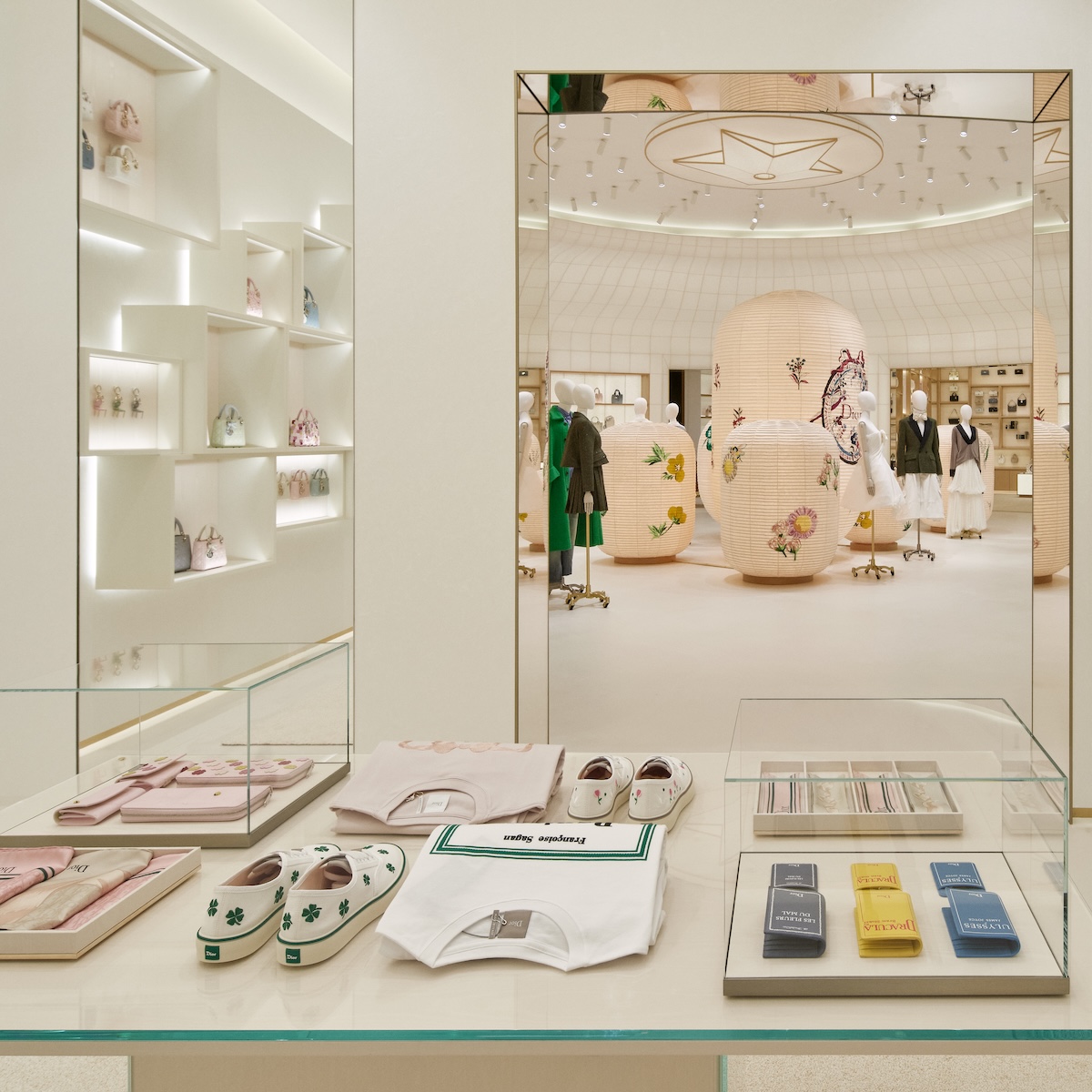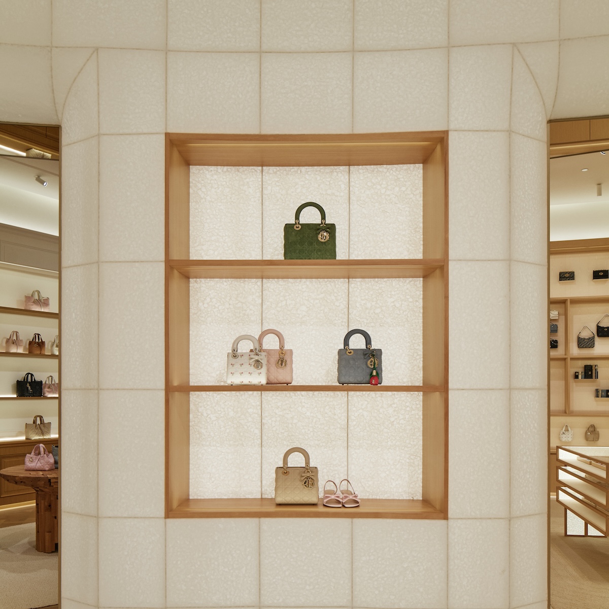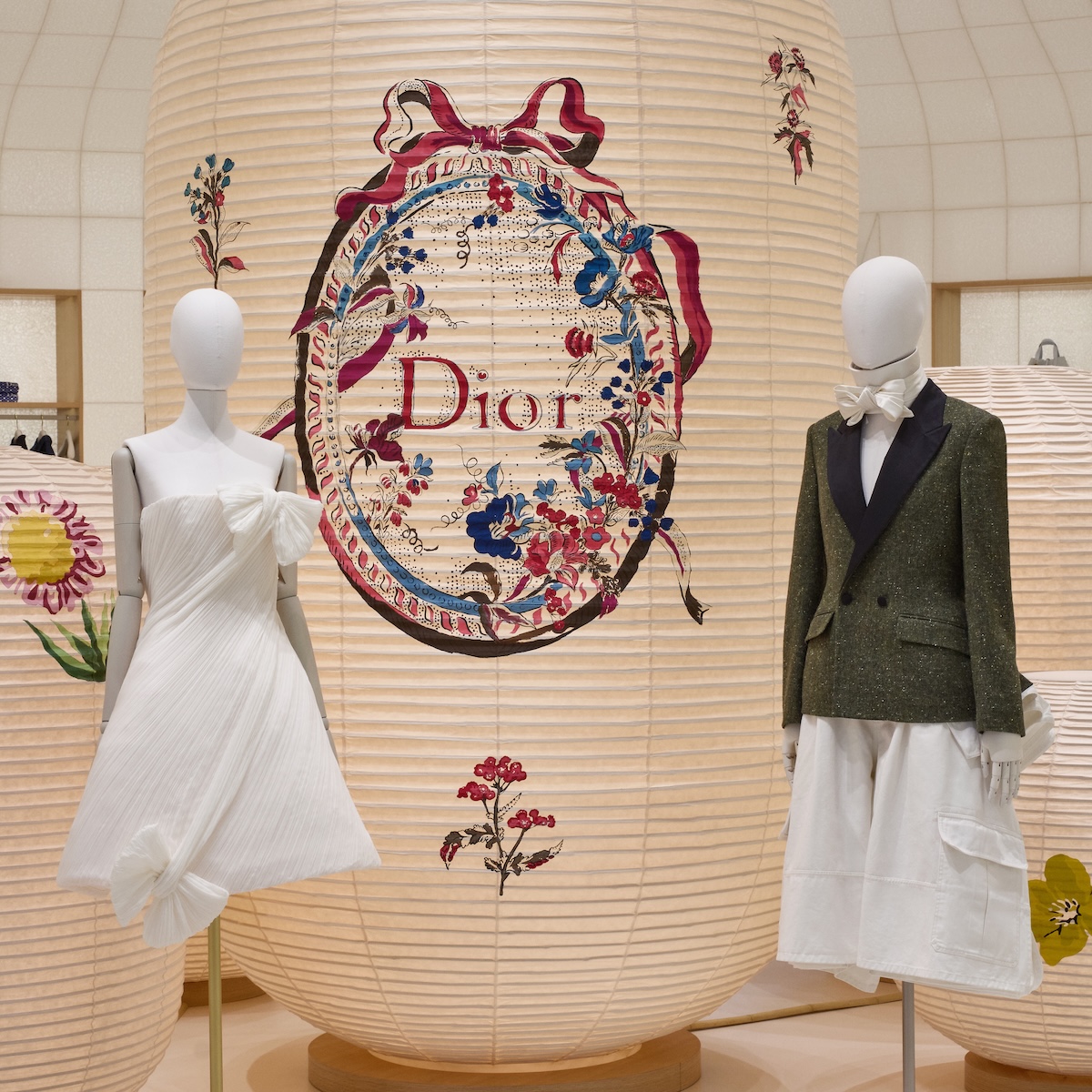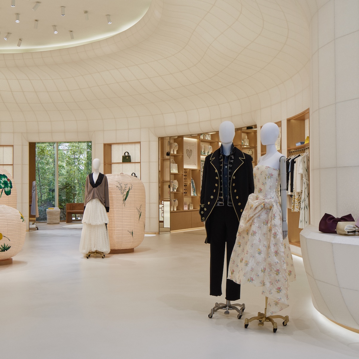 本店舗は、パリの本店「30モンテーニュ」のファサードを、ゴールドで染めた竹で再解釈し、夜にはライトアップする。西畠清順による“禅”をコンセプトにした庭園やフラワーアーティストの東信が手掛けた作品などが広がり、“レディ ディオール”バッグの形に仕上げた提灯が並ぶ。さらに、TAKT PROJECT(タクト プロジェクト)や太田翔、柴田あゆみ、we +、光井花、CHIKAKEN(チカケン)などの現代デザイナーの作品を配置する。さらに、“バー”スーツや“ジュノン”ドレスなどの、ブランドを代表するクリエーションも展示している。