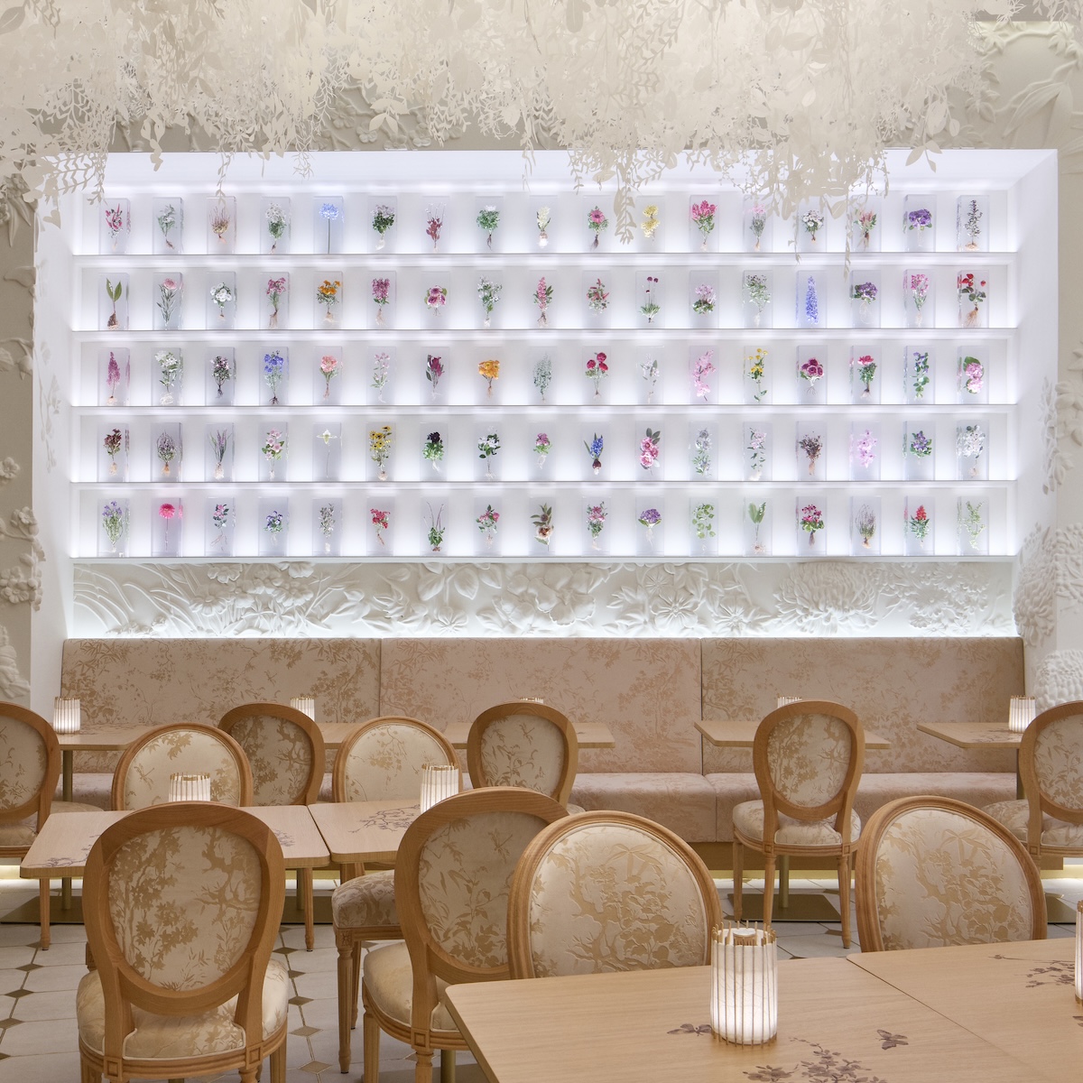 東信によるカプセルに覆われた花々で装飾した「カフェ ディオール」では、アンヌ=ソフィー・ピック(Cafe Dior by Anne-Sophie Pic)が考案したフランス料理のメニューを用意する。ソルティメニューには、デビルドエッグ、ヒマワリとオニオンスープに着想を得た野菜のコンポジション、“カナージュ”モチーフへのオマージュなどの料理が並ぶ。デザートには、抹茶やゆずなどの日本料理の素材に着想を得た組み合わせたスイーツや、自宅で楽しめる2種のチョコレートとケーキをラインアップする。