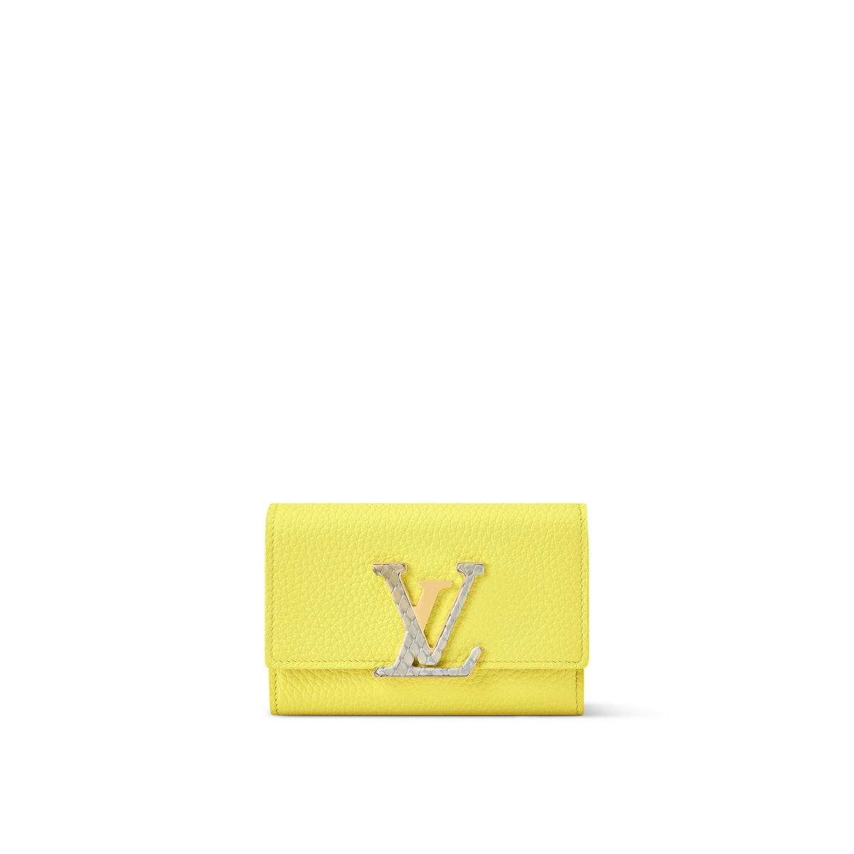 鮮やかなシトラスイエローで彩られた日本限定“ポルトフォイユ・カプシーヌ タイニー”(13万9700円)は、内装にシルバーカラーのレザーライニングを施した。“LV”イニシャルをはじめとする、ゴールドカラーの金具で仕上げた。
