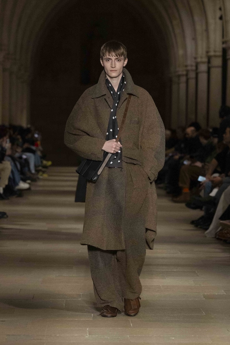 ランウエイに現れたのは、極端に身幅の広いジャケットやコート、そして床を引きずるほどルーズなトラウザー。一見オーセンティックな紳士服ですが、そのプロポーションは大きく歪められ、三原康裕デザイナーが感じている「日常のズレや違和感」を服そのものの形として表現しました。