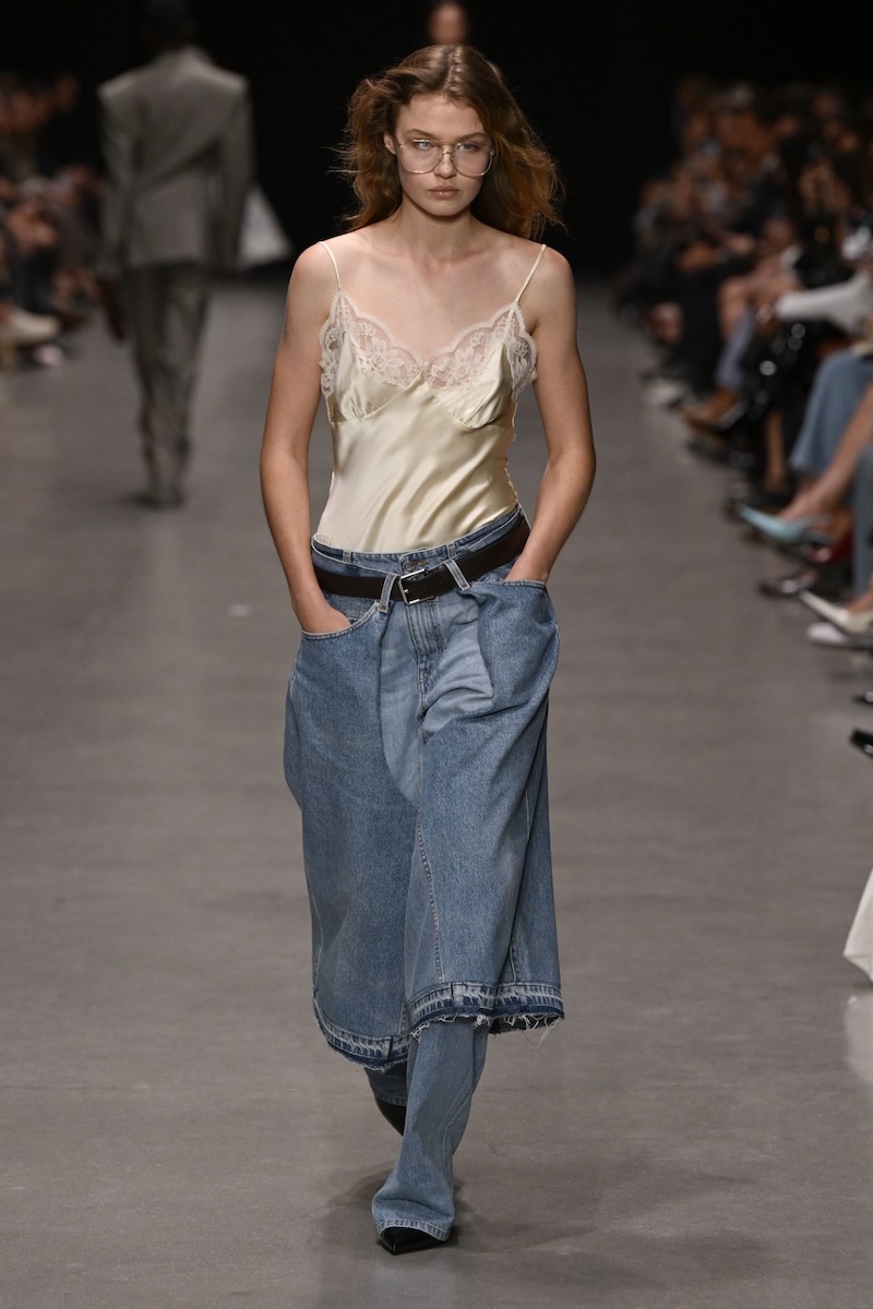 「ステラ マッカートニー(STELLA McCARTNEY)」は、ランジェリー風のスリップにデニムのワイドパンツを合わせました。デニムパンツを2枚重ねたかのようなレイヤードデザインが目を引きます。ベルトでウエストを強調。おへそより低い位置にくるローライズは、このようにトップスをウエストインすることで、ルーズな印象を抑えやすくなります。